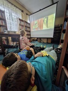 Następnie biblioteka zamieniła się w salę kinową. Dzieci najpierw zapoznały się z projektorem "Ania", na którym w latach 80. i 90. można było w domu oglądać bajki.