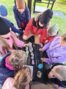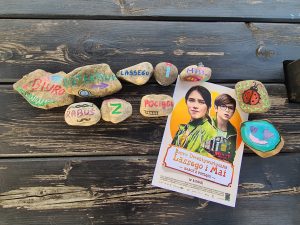 - za pomocą wcześniej przygotowanych przez bibliotekarzy map grupy poszukują słów zapisanych farbami akrylowymi na kamieniach ukrytych w bliskiej okolicy biblioteki, każda grupa ma inne zdanie, a kolory i miejsce rozłożenia kamieni są zaznaczone na mapach,