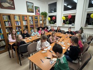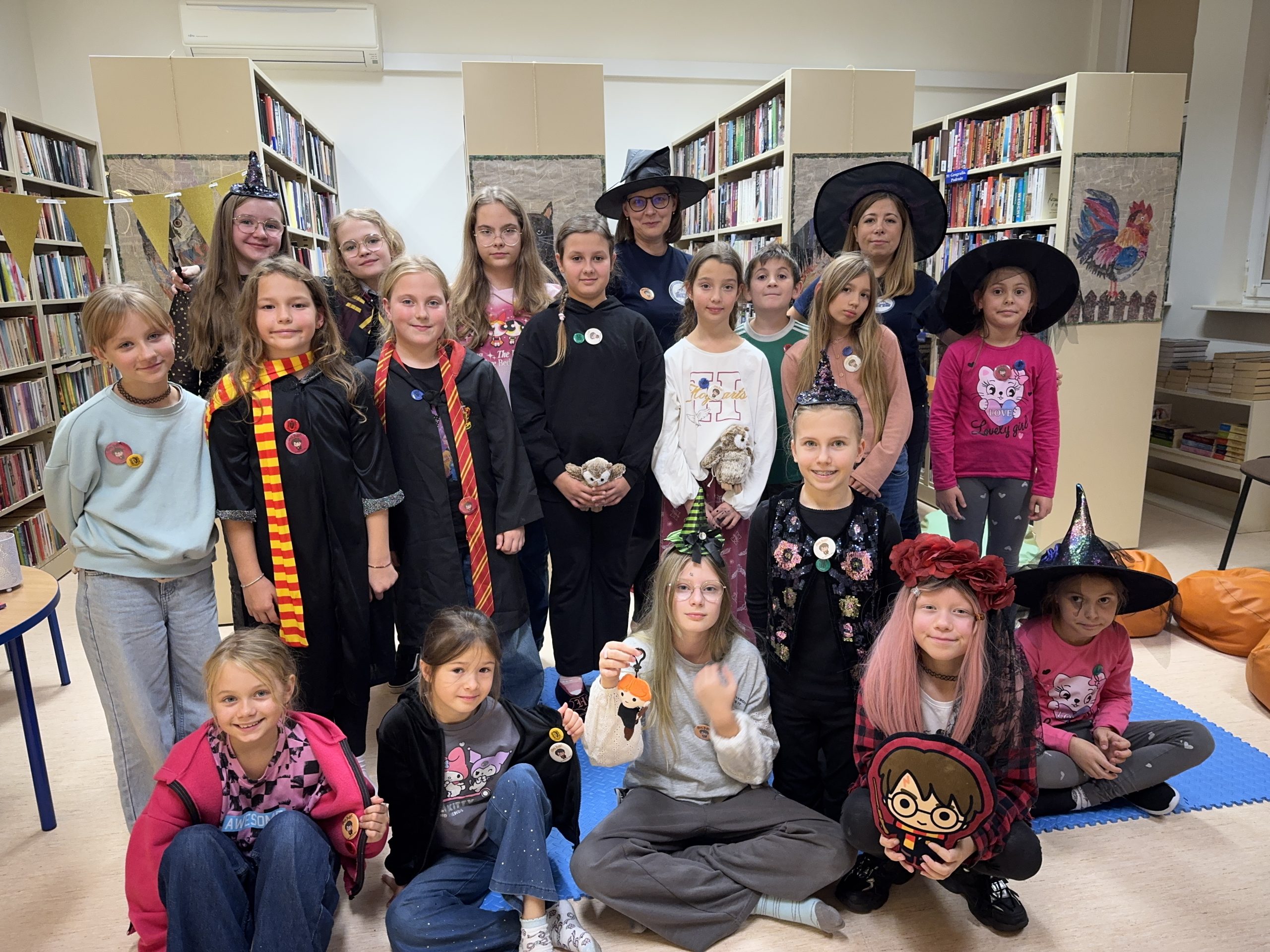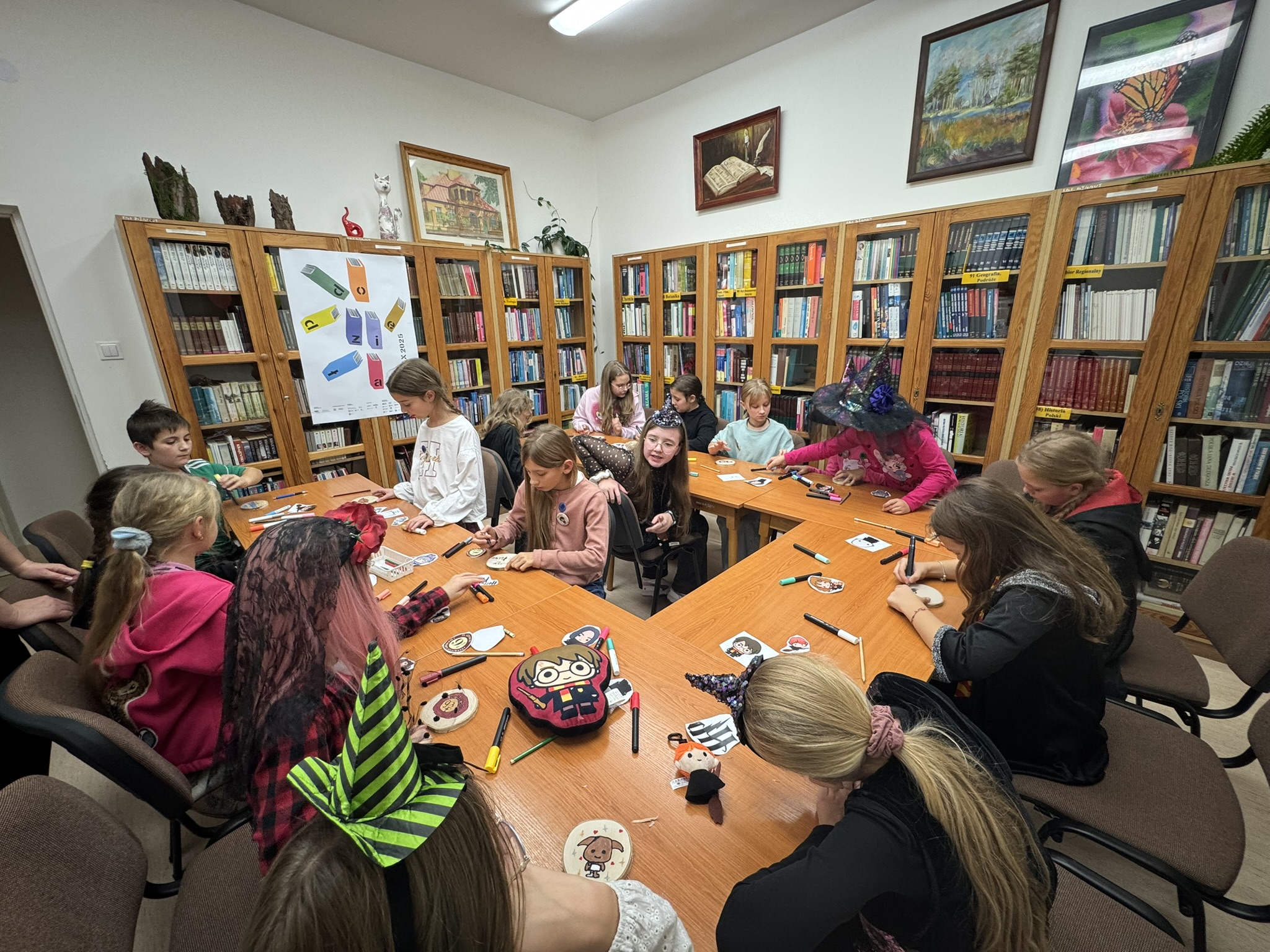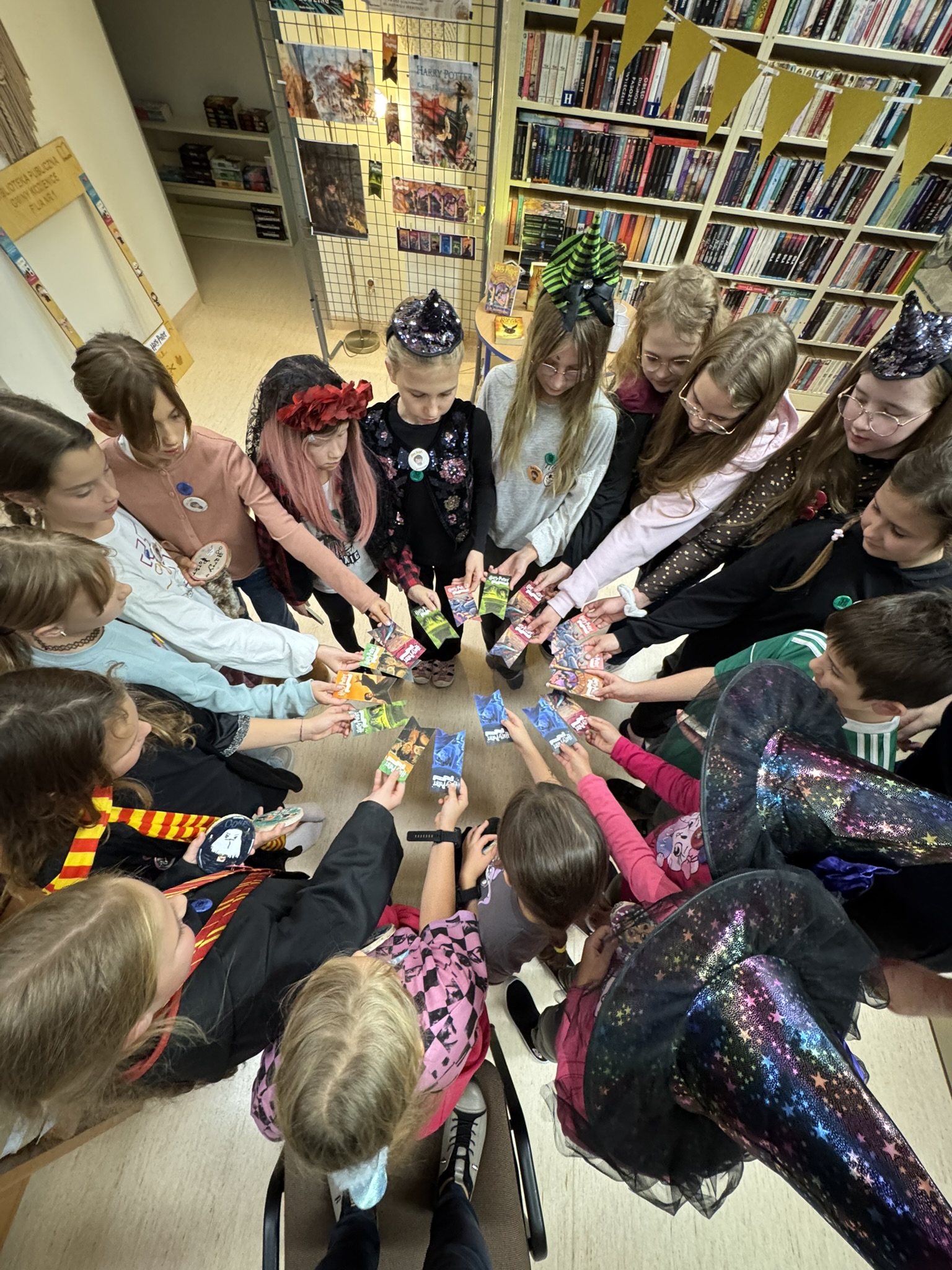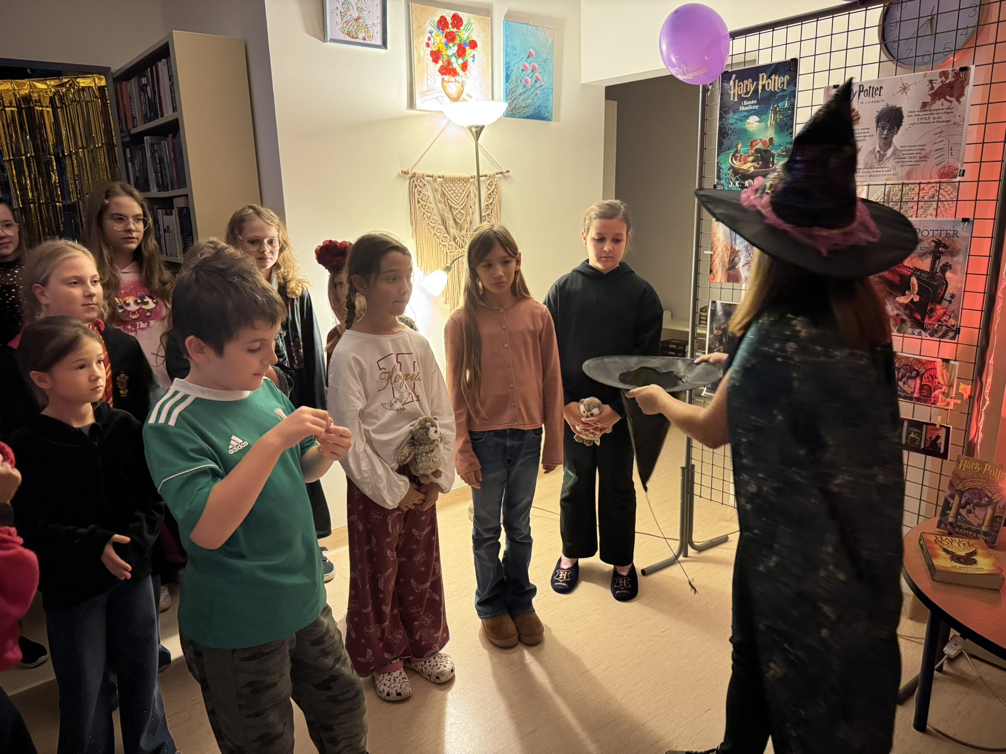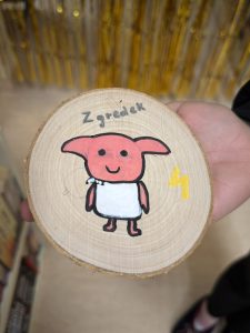 Program był zróżnicowany. Na początek odbyły się quizy i zagadki w „Pokoju Wspomnień Harry’ego Pottera”, które wzbudziły wiele emocji i zaangażowania. Następnie uczestnicy robili sobie zdjęcia w przygotowanej scenerii. W części plastycznej każdy mógł namalować wybraną postać z książki na drewnianym krążku – powstały bardzo pomysłowe prace.