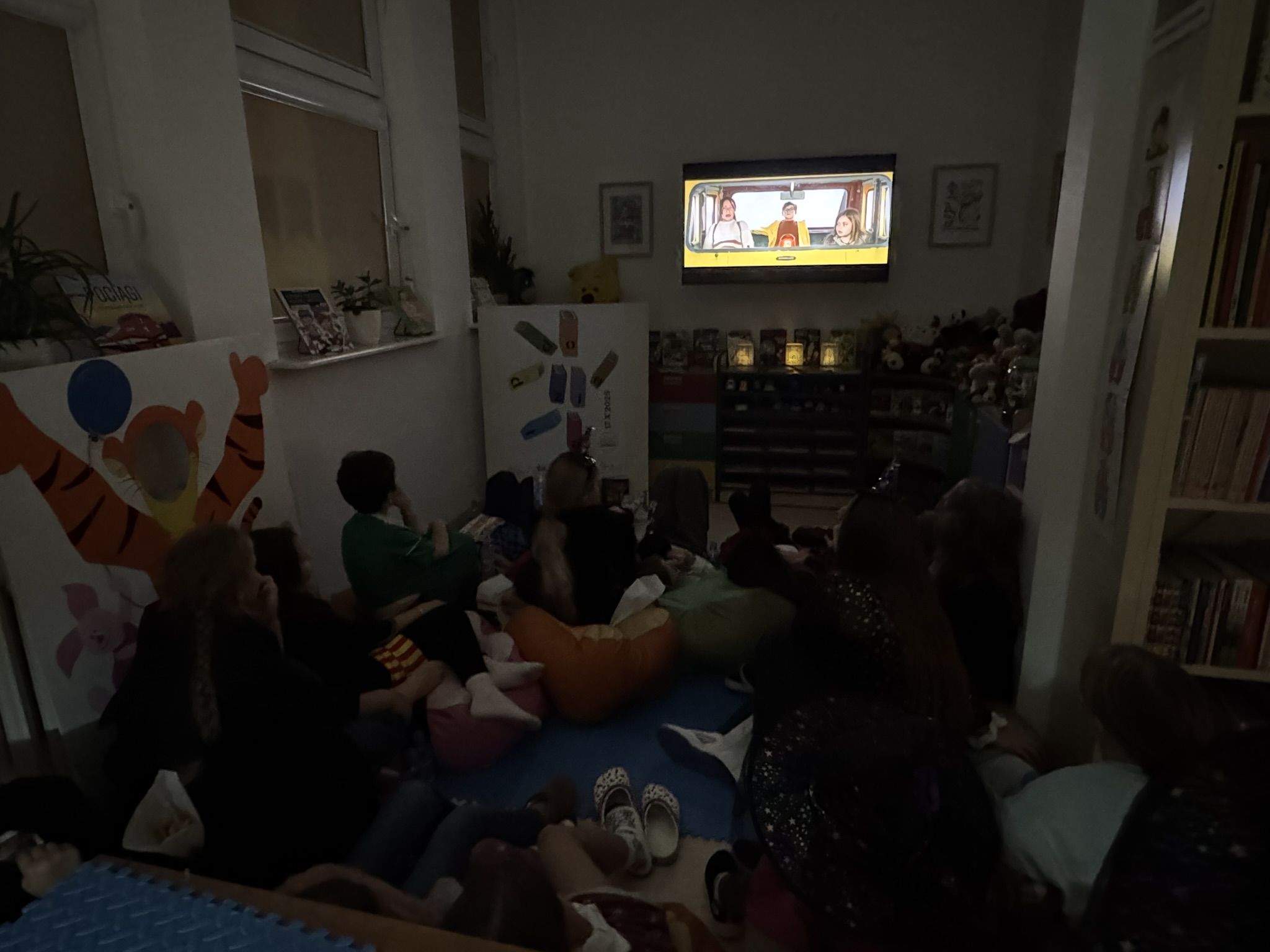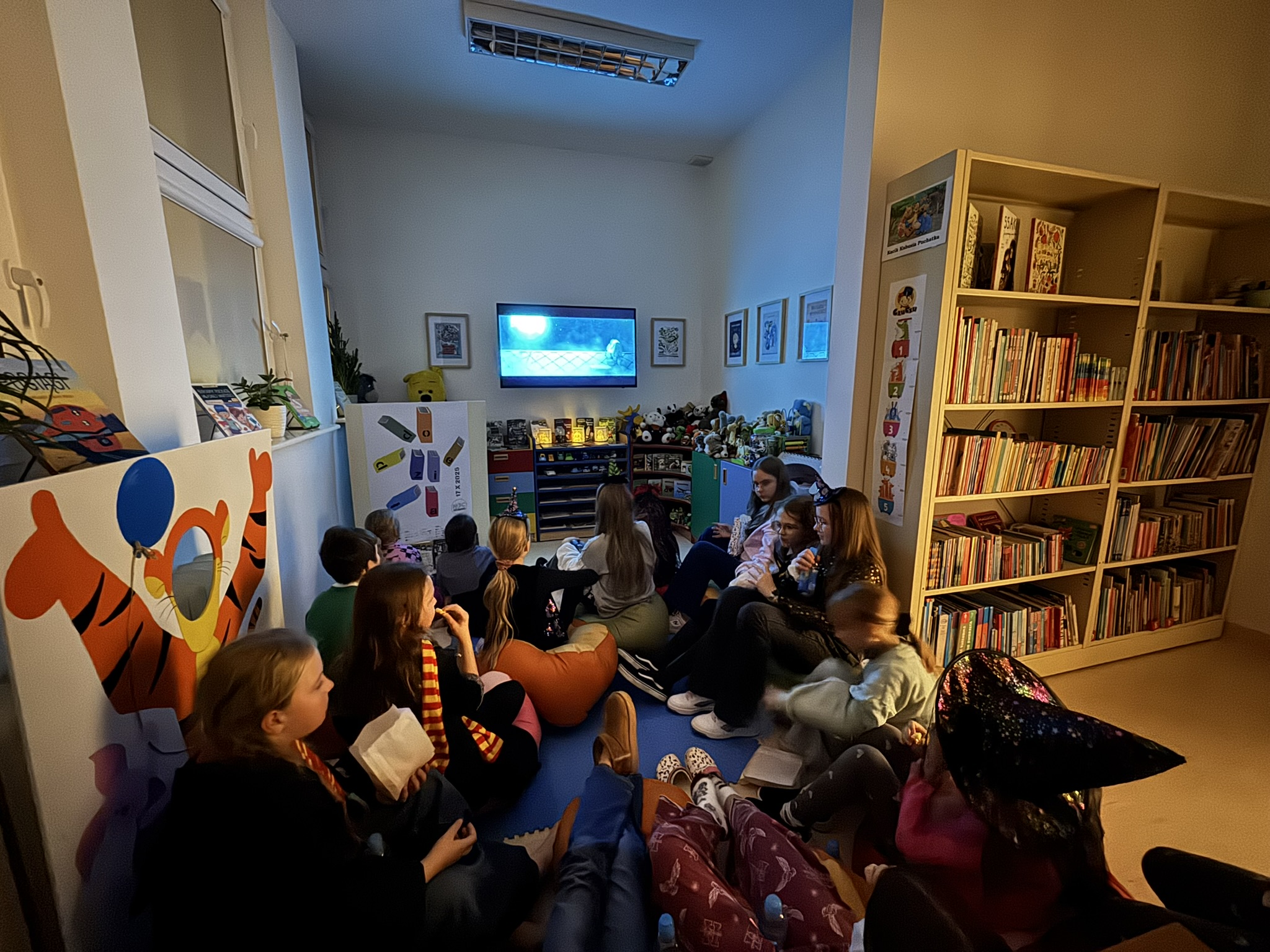 Zwieńczeniem wieczoru był Seans pod Peleryną Niewidką, czyli projekcja filmu „Biuro Detektywistyczne Lassego i Mai. Rabuś z pociągu”. Film powstał na podstawie popularnej serii książek, które cieszą się dużym zainteresowaniem wśród dzieci i są dostępne w naszej bibliotece.