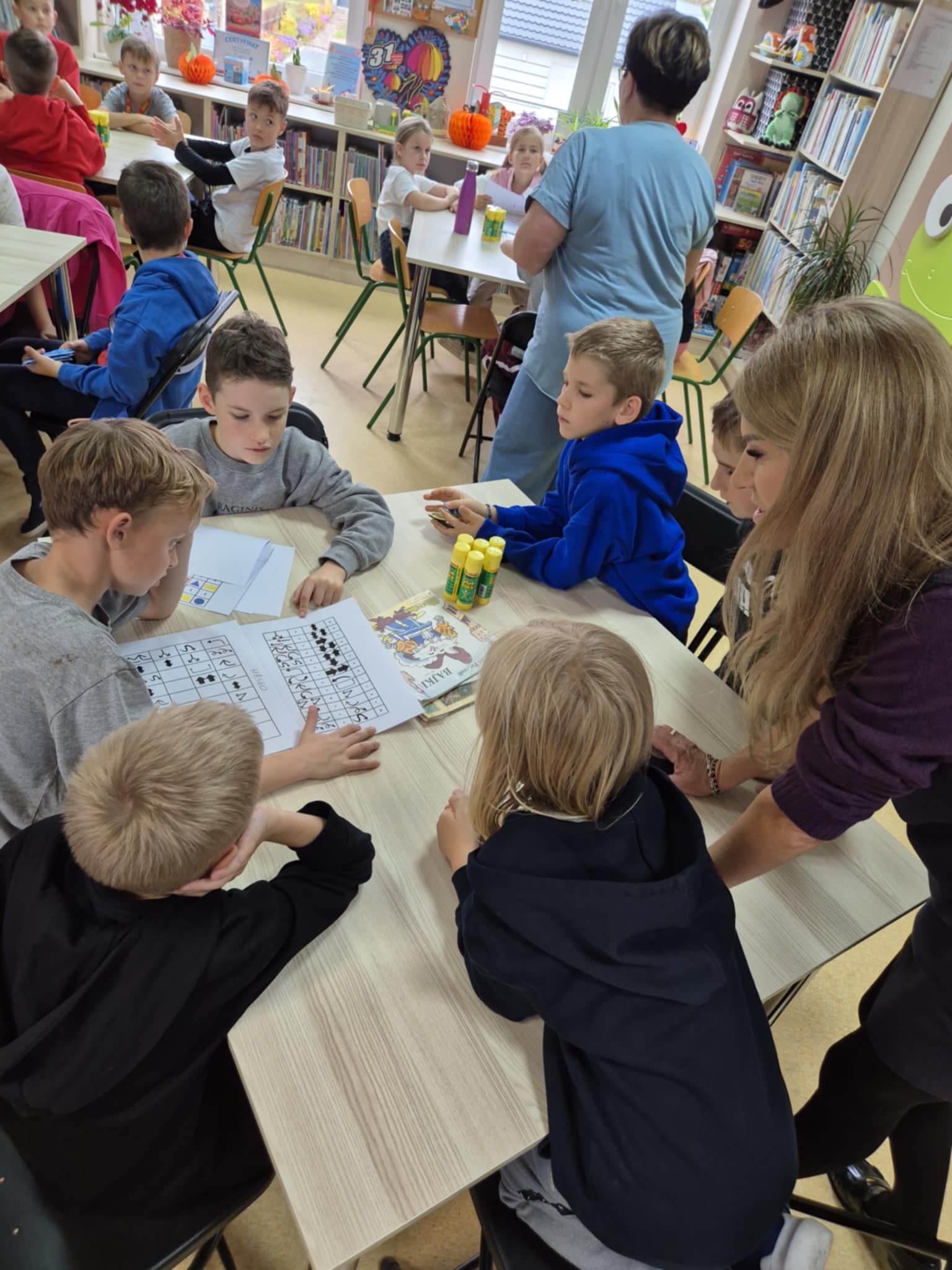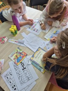 Cztery drużyny uczniów z klasy 2 z zapałem zmagały się z mnóstwem zagadek, szyfrów i złożonych rebusów.