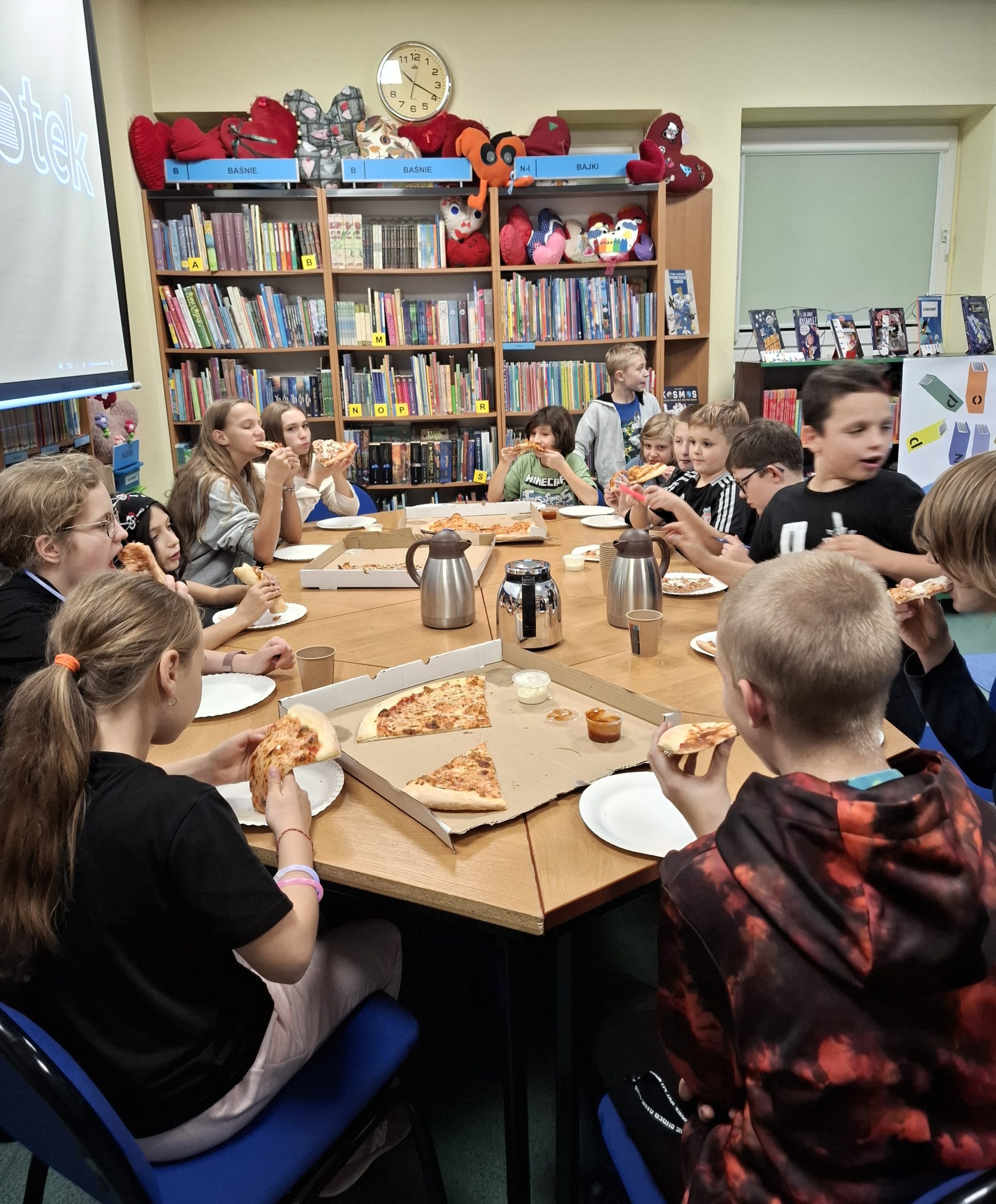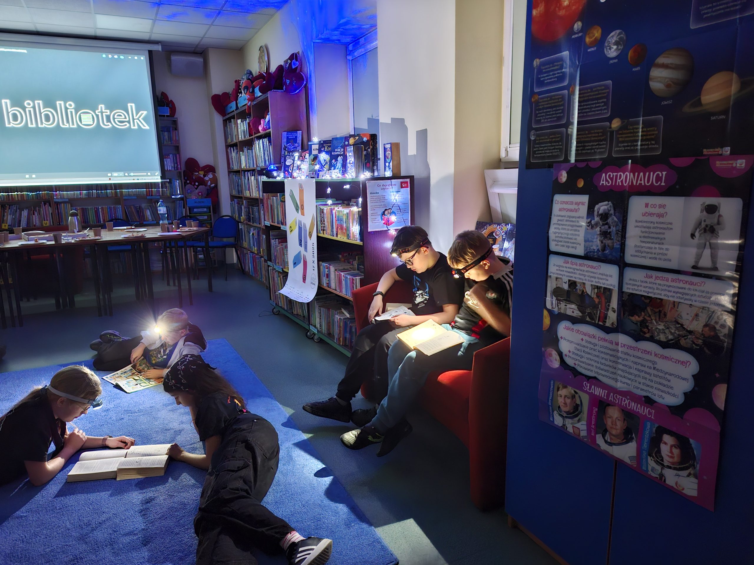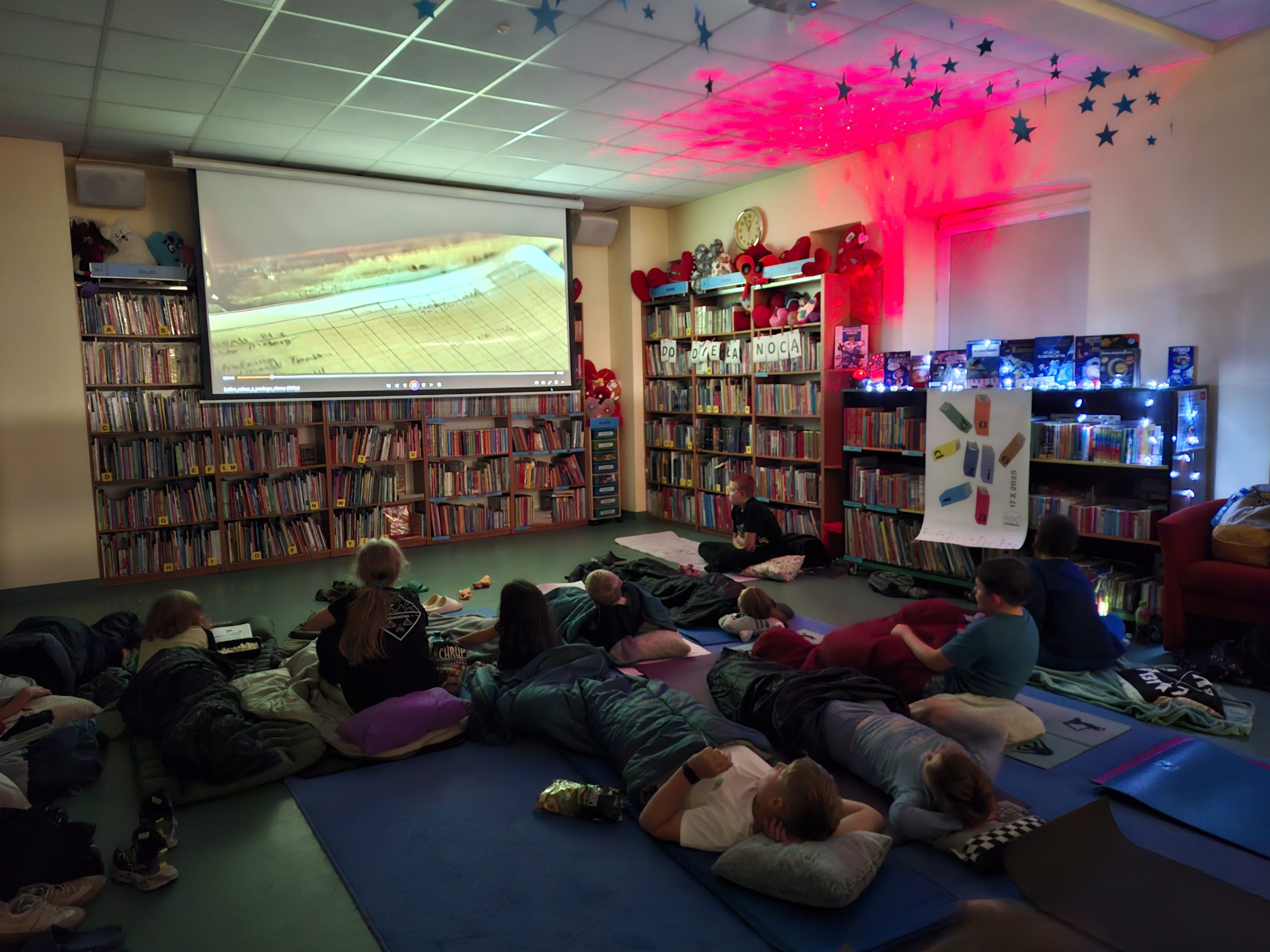 Nieodłącznym punktem nocnych spotkań jest wspólna kolacja – pizza. A tuż po posiłku przyszedł czas na tradycyjne czytanie na dywanie z latarkami w ręku. Ostatnim wyzwaniem czekającym na uczestników nocy była czytelnicza gra „Gwiezdny alfabet”, która wymagała poszukiwania odpowiedzi na dwanaście kosmicznych pytań i rozkodowania haseł.
