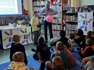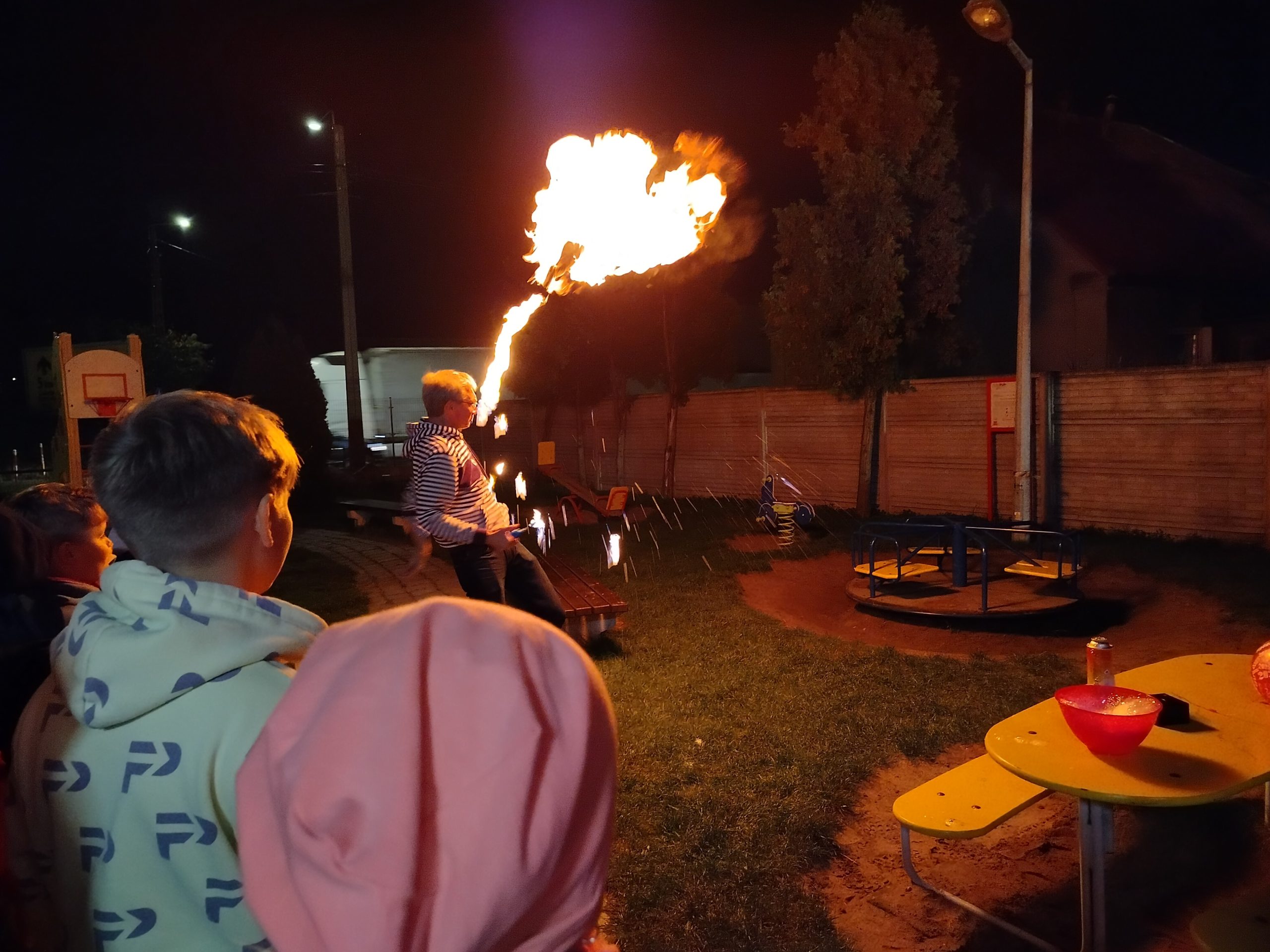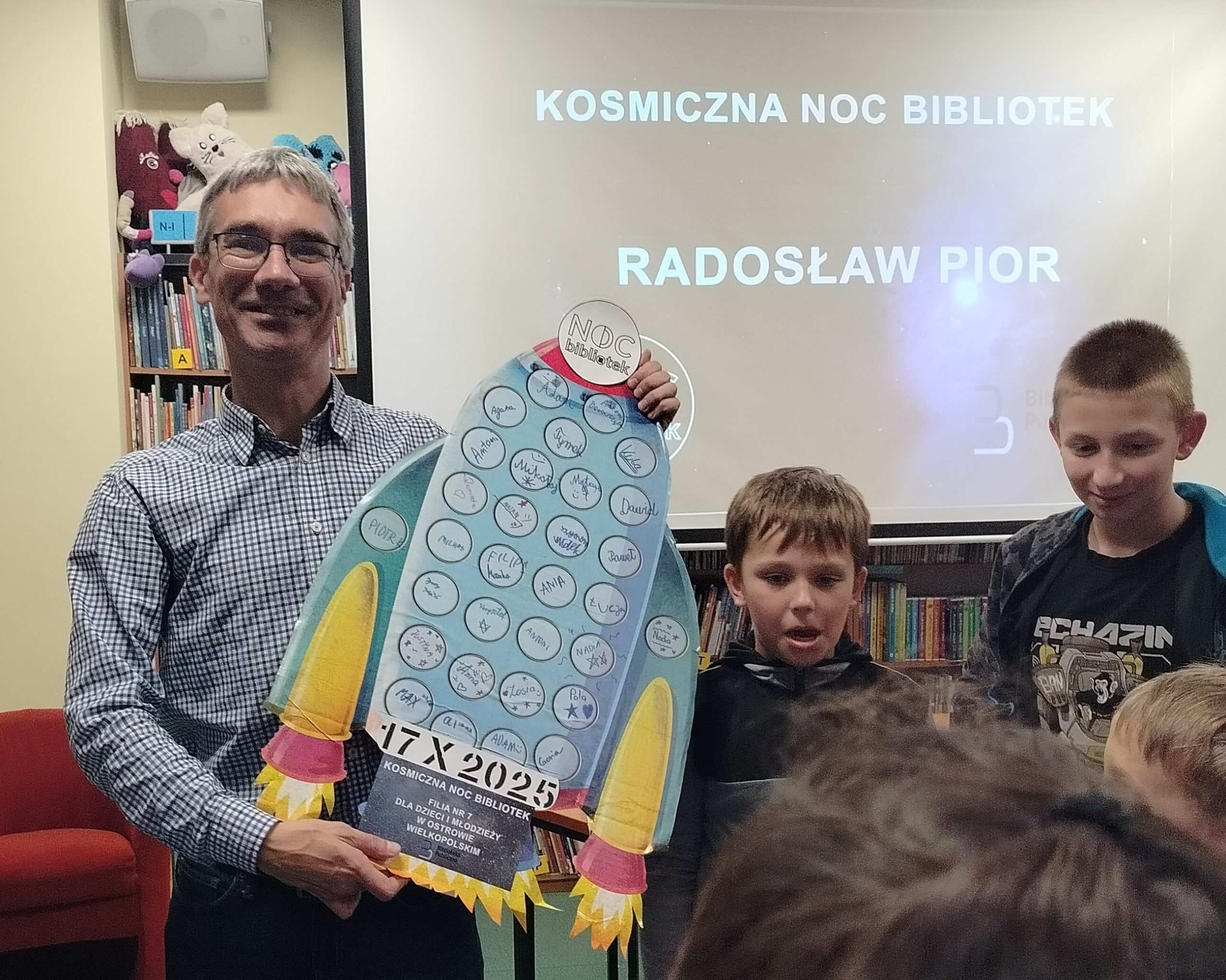 Naszym tegorocznym gościem był fizyk Radosław K. Pior, założyciel Koła Astronomicznego Malapert i AstroAreny Edukacja Astronomiczna z Kalisza, który oczarował wszystkich swoją wiedzą i pasją dotyczącą astronomii i nauk pokrewnych. Ku wielkiej radości dużych i małych nie zabrakło wybuchów i hałasu podczas edukacyjnego spektaklu. Zostały przed nami odkryte tajemnice różnych pierwiastków, na przykład ciekłego azotu i reaktywnego wodoru. Dowiedzieliśmy się, co powstało w momencie Wielkiego Wybuchu, zagraliśmy w gwiezdne bingo i jedliśmy pyszne kosmiczne lody. Po tych pasjonujących warsztatach uczestnicy spotkania przygotowali swoje wyrzutnie i rakiety, które testowali na zewnątrz.