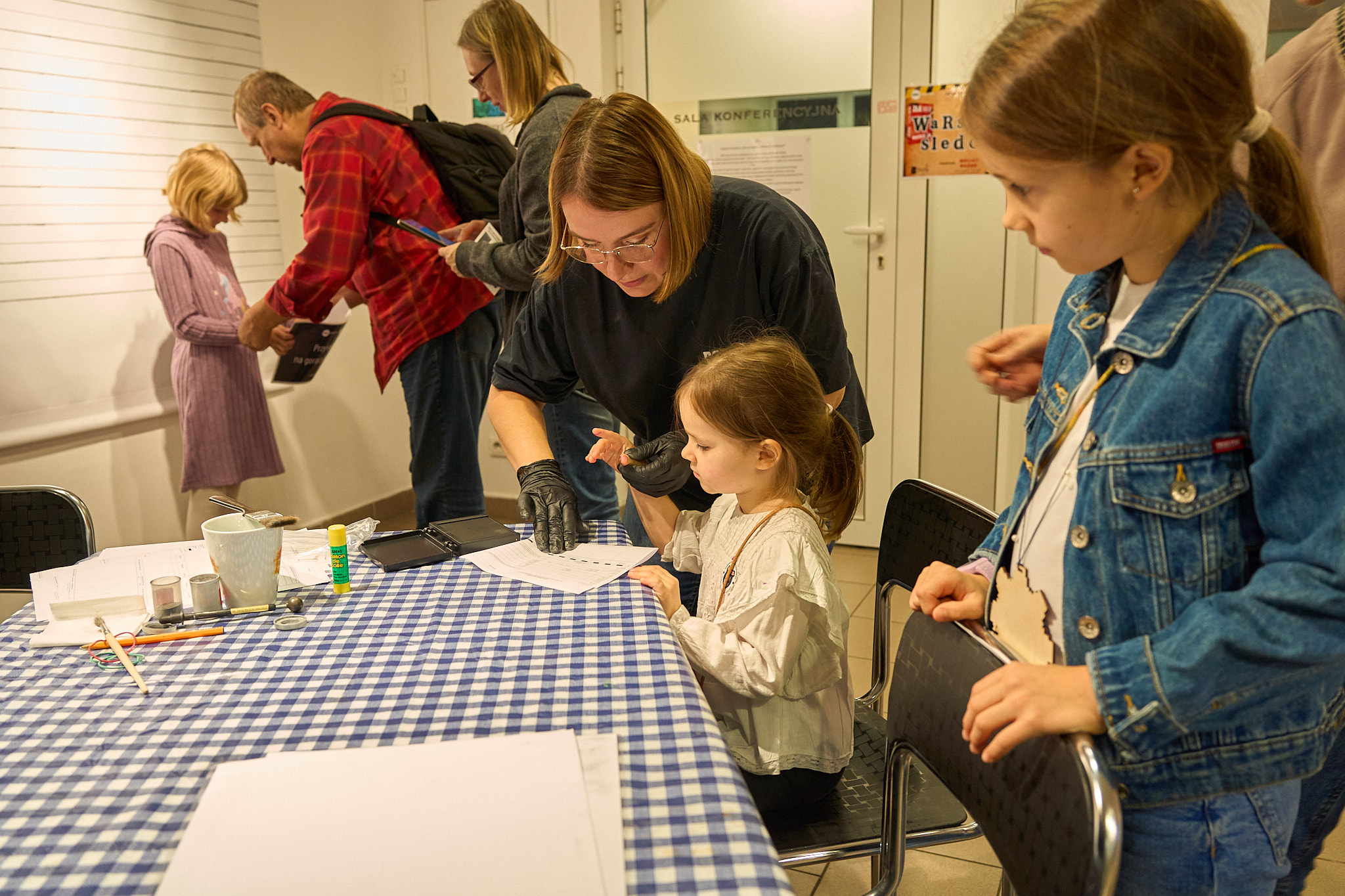 Tego wieczoru wszyscy zamieniliśmy się w policjantów i detektywów prowadzących śledztwo w sprawie zaginionej książki 📖🕵️♂️. Uczestnicy mogli stworzyć własne atrybuty detektywa – lupę, notes czy identyfikator, a także pobrać odciski palców (i to profesjonalnie, bo nasza koleżanka przeszła specjalne szkolenie na komisariacie), rozwiązywać zagadki i łamigłówki oraz tworzyć portrety pamięciowe podejrzanych!