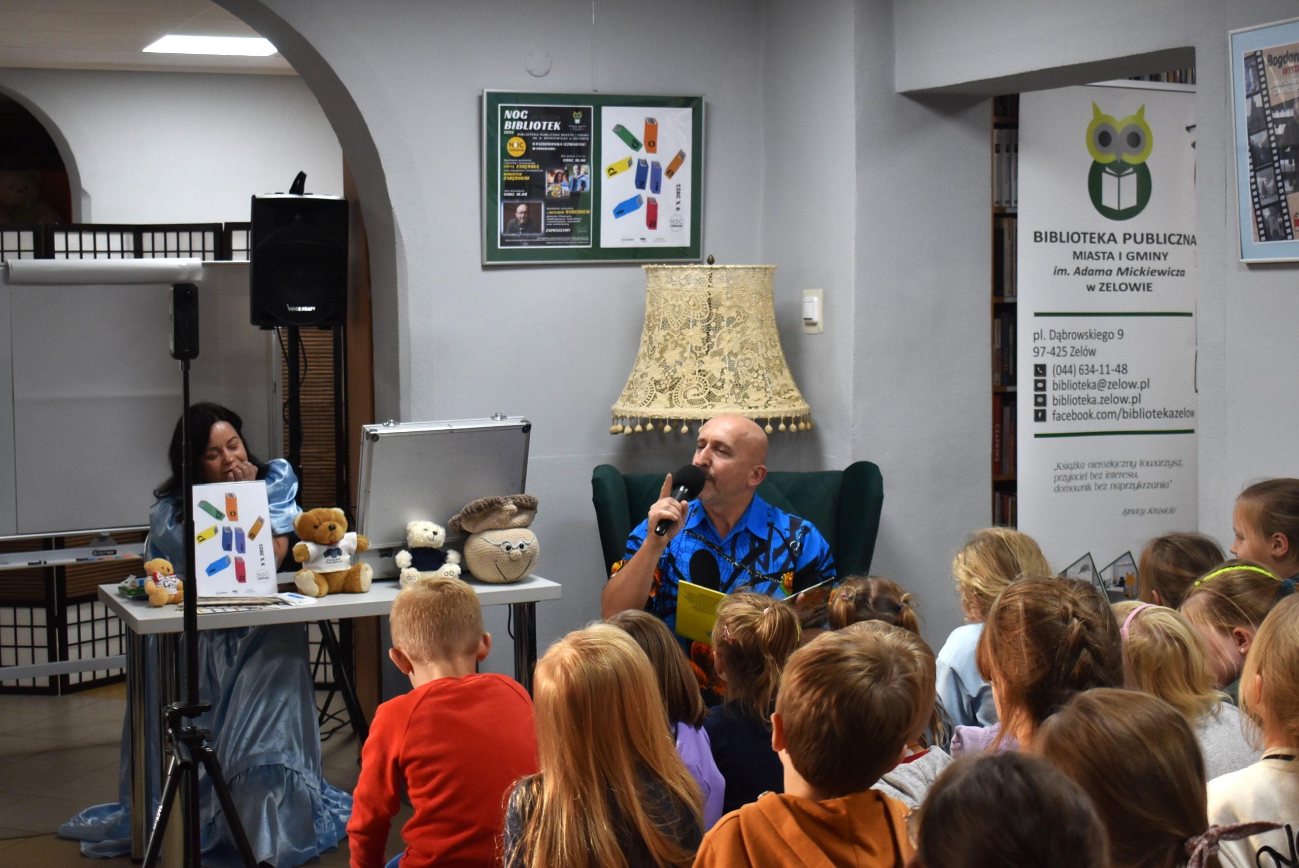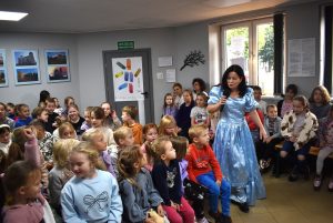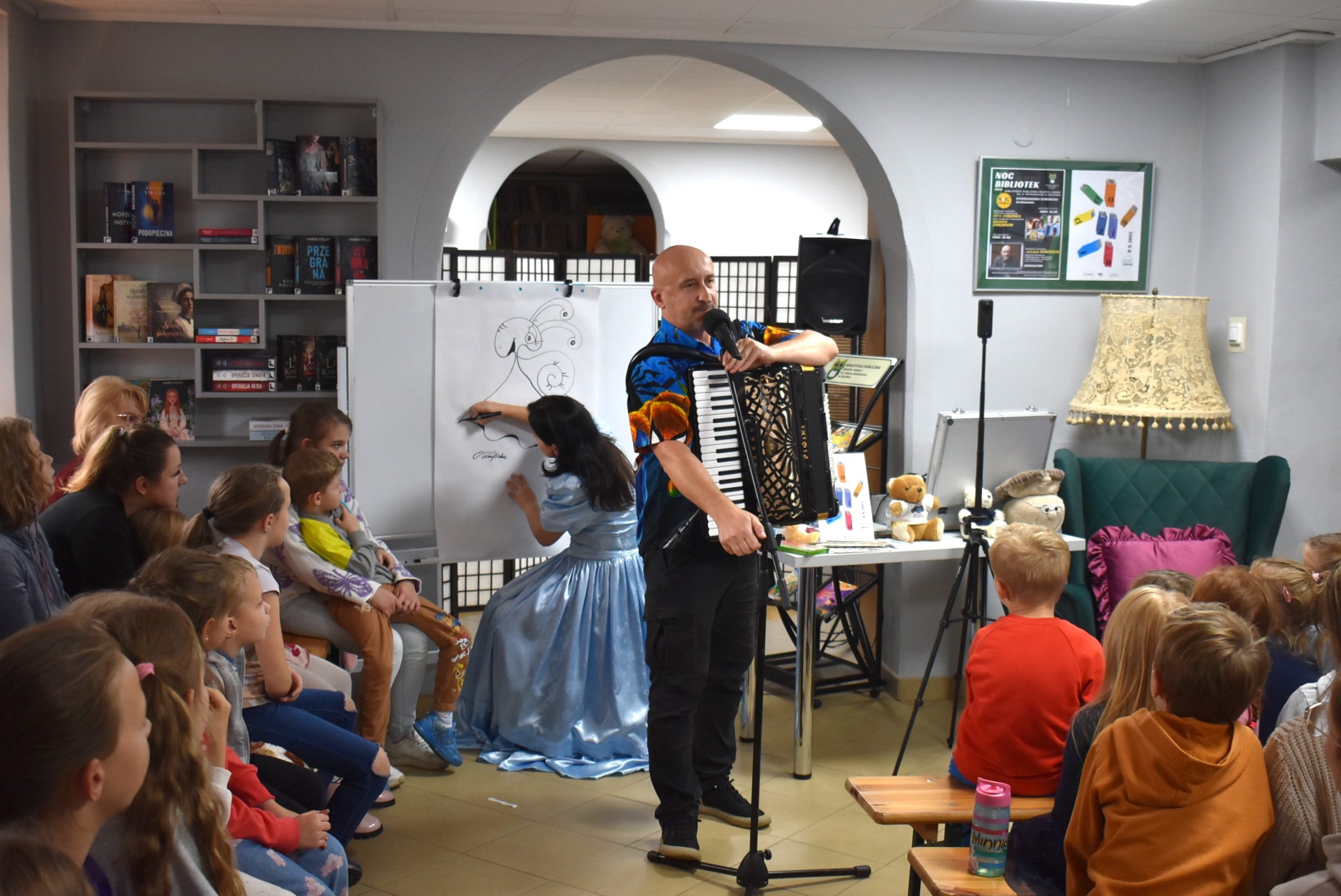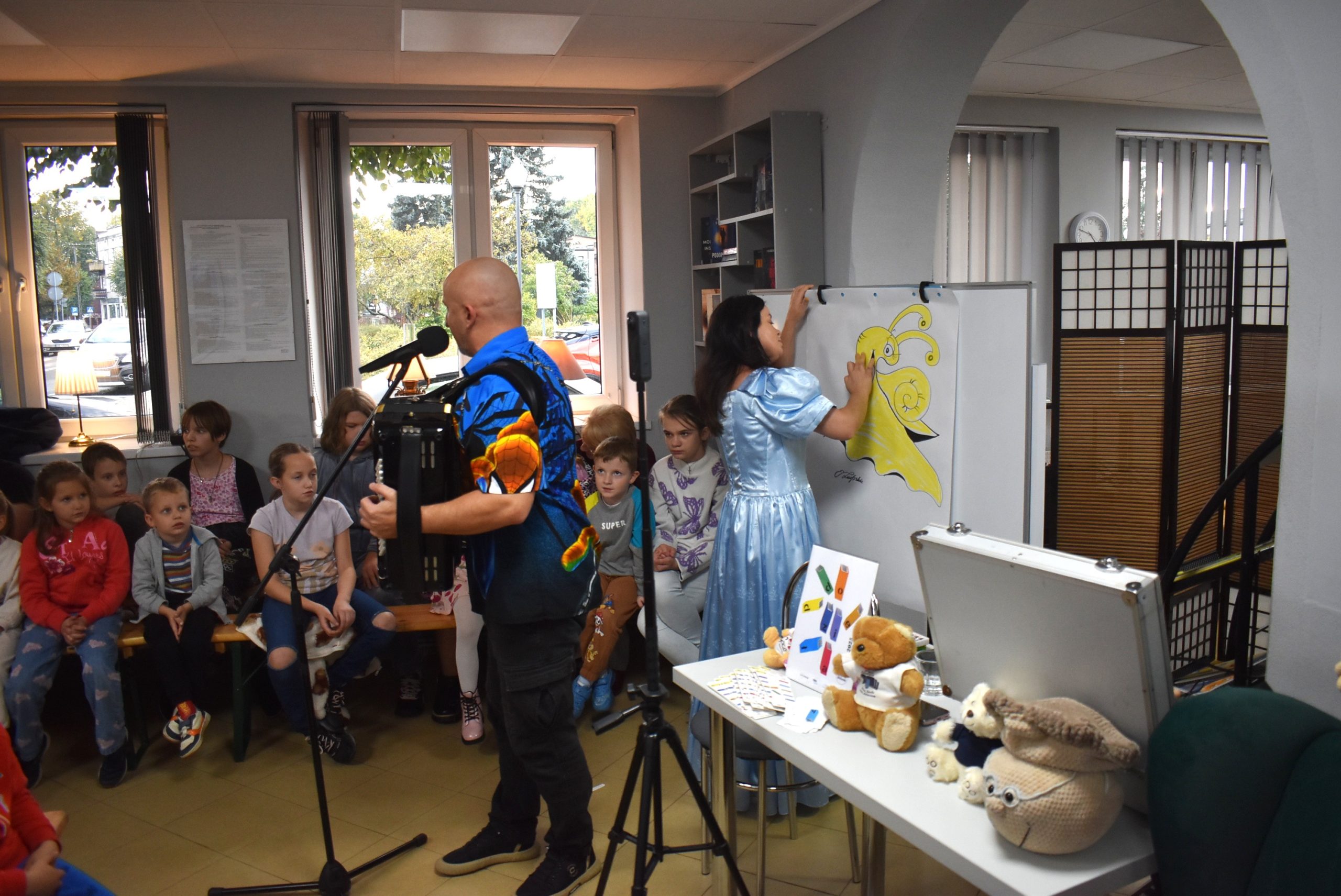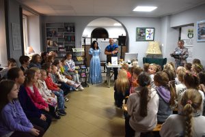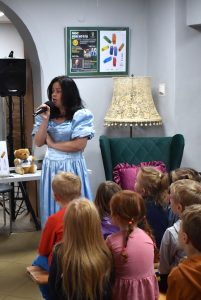W baśniowej scenerii dzieci zostały przeniesione do świata wyobraźni Pani Edyty, która dzieliła się inspiracjami do swojej twórczości. Pan Robert zadbał o muzyczną oprawę wydarzenia – czytał bajki, zadawał zagadki oraz wspólnie z dziećmi zaśpiewał autorską piosenkę pt. „Mądra rzeka”, promującą ideę czytania i odwiedzania biblioteki.