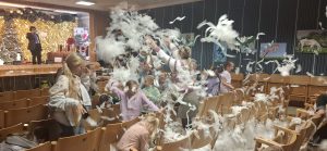 W sobotnie popołudnie Biblioteka Publiczna Miasta i Gminy Jedwabne zamieniła się w magiczną krainę Narnii. Już od progu uczestników witała tajemnicza szafa – przejście do niezwykłego świata. Za nią czekała zimowa sceneria inspirowana Narnią – ośnieżone drzewa, lampion przywodzący na myśl słynną latarnię, nie zabrakło również zamku Białej Czarownicy, labiryntu, mostu Beruna oraz muzyki tworzącej magiczny nastrój.