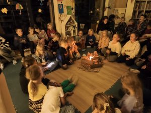 Gdy za oknem zapadł mrok, wśród książek rozbłysły gwiazdki i ciemność rozświetliło ognisko! Zgromadzeni wokół zajadaliśmy przyniesione z domu smakołyki i przygotowane przez siebie piankowe szaszłyki! Smakowały wyśmienicie! Wspólne śpiewanie i rozmowy umiliły czas w blasku "ognia ".