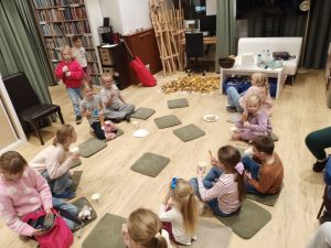 Przeczytaliśmy bajkę „Czerwony Kapturek. 22 możliwe historie i 5 zakończeń”. Dzieci mogły się wcielić w główną postać z bajki czyli Czerwonego Kapturka i same decydować o przebiegu i zakończeniu historii.  A potem chwyciliśmy za kredki i sami  stworzyliśmy własne, unikalne zakończenia tej historii.
