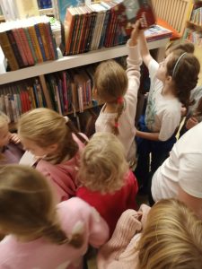 Poszukiwanie skarbu w labiryncie książek to dopiero była frajda. Dzieci podążając za wskazówkami  odnalazły słodki  biblio-skarb.