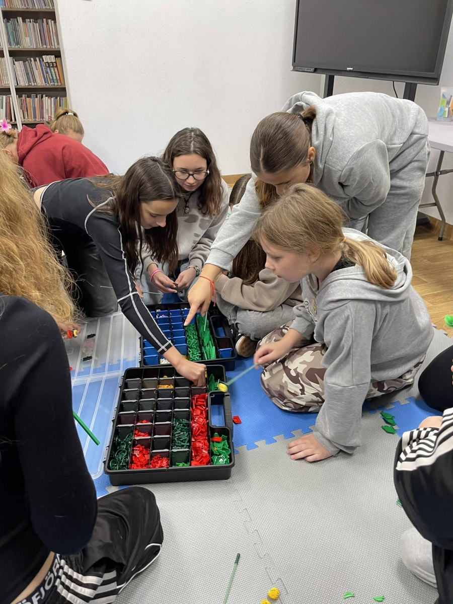 Rozpoczęliśmy więc intensywnie od budowania z klocków Lego! Prowadzącym był Pan Paweł Dobrzelecki – bibliotekarz, animator, pasjonata tworzenia z klocków Lego. Na rozruszanie każdy uczestnik stworzył swojego kwiatka, po czym powstał niezwykły bukiet. Następnie weszliśmy w literacki świat, a dokładniej zagłębiliśmy się w „Czarnoksiężnika z krainy Oz”. Budowania nie byłoby końca, gdyby nie ograniczony czas zajęć.