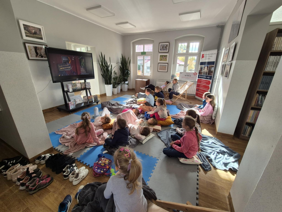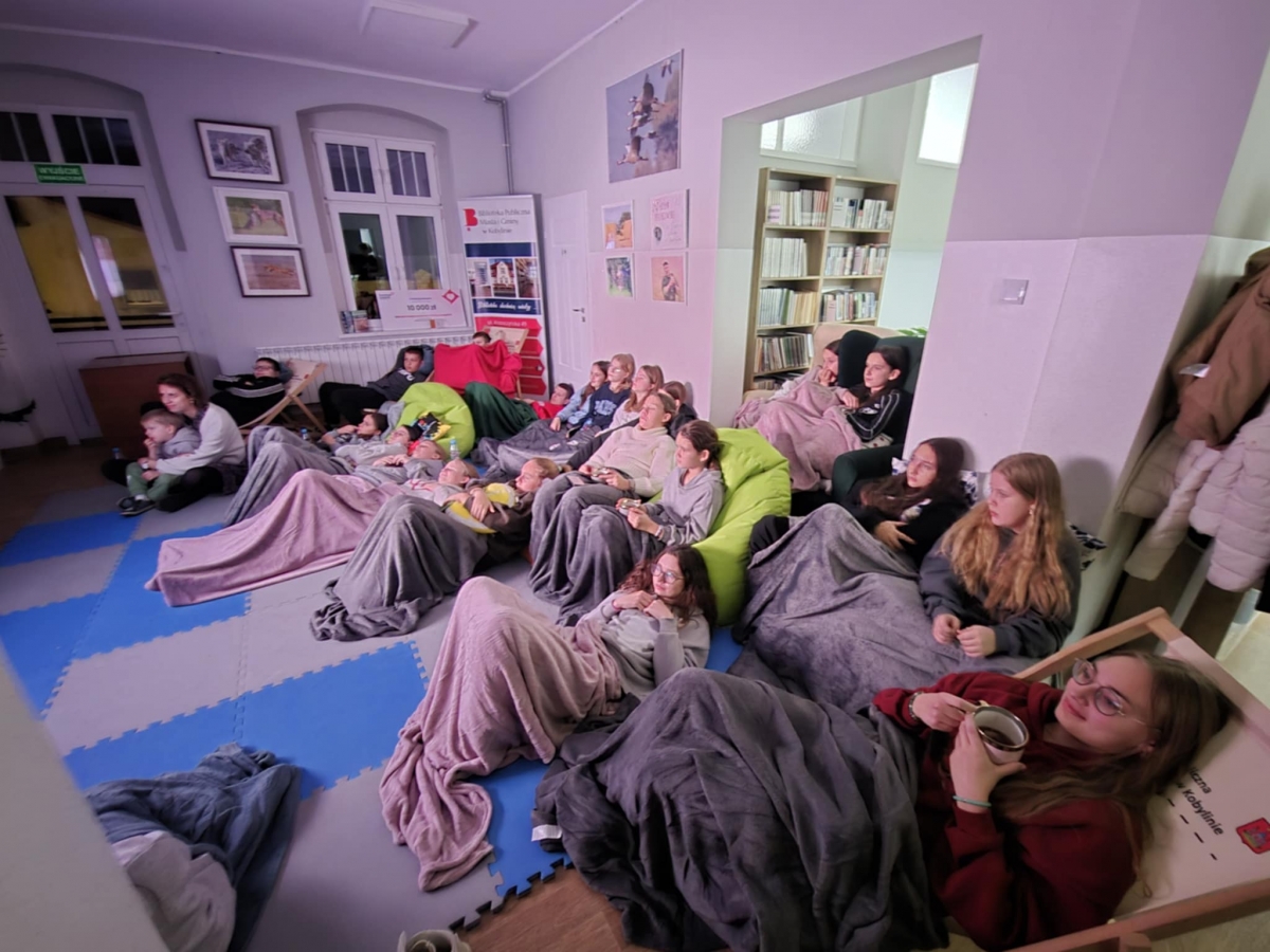 Nadszedł wieczór, a ostatnim punktem NOCY BIBLIOTEK była rekreacja, czyli seans filmowy. Młodzież zaopatrzona w miękkie koce dała się porwać w ciekawą historię.