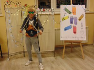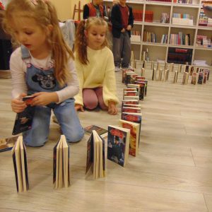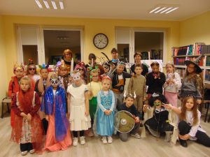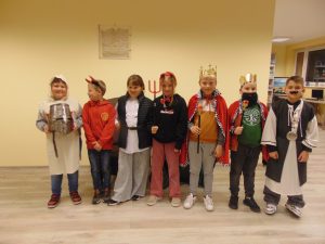 Pierwszym punktem programu był spacer do koźmińskiego muzeum,które mieści się w baszcie zamku. Pani Maria Lewandowicz – polonistka i pracownik muzeum, przeczytała „Legendę o Maćku Borkowicu i diable Borucie” a dr Michał Pietrowski – historyk i kustosz muzeum, pokazał loch z postacią Maćka Borkowica oraz izbę z siedzącym na tronie królem Kazimierzem Wielkim. W jednej z sal muzealnych widzieliśmy kopię wg obrazu Jana Matejki „Maćko Borkowic wchodzi do lochu”. Po powrocie do biblioteki, w ramach warsztatów plastycznych, dzieci wyklejały z papieru wieżę koźmińskiego zamku oraz przedstawiły scenkę z wcześniej zasłyszanej legendy. Potem przyszedł czas na „szalone” przebrania. Sesja zdjęciowa cieszyła się dużym powodzeniem a niektóre pomysły na strój były niesamowite. Na koniec, żeby dać trochę odpocząć rozemocjonowanym uczestnikom, układaliśmy domino z książek.