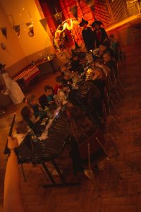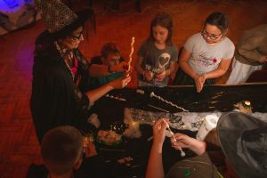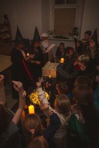 Kulminacyjnym momentem wieczoru było Poszukiwanie Kamienia Filozoficznego rozbitego na części i ukrytego wraz z zagadkami w bibliotece. Nie zabrakło Turnieju Czarodziejów gdzie młodzi czarodzieje mierzyli się w zadaniach wymagających odwagi oraz sprytu.