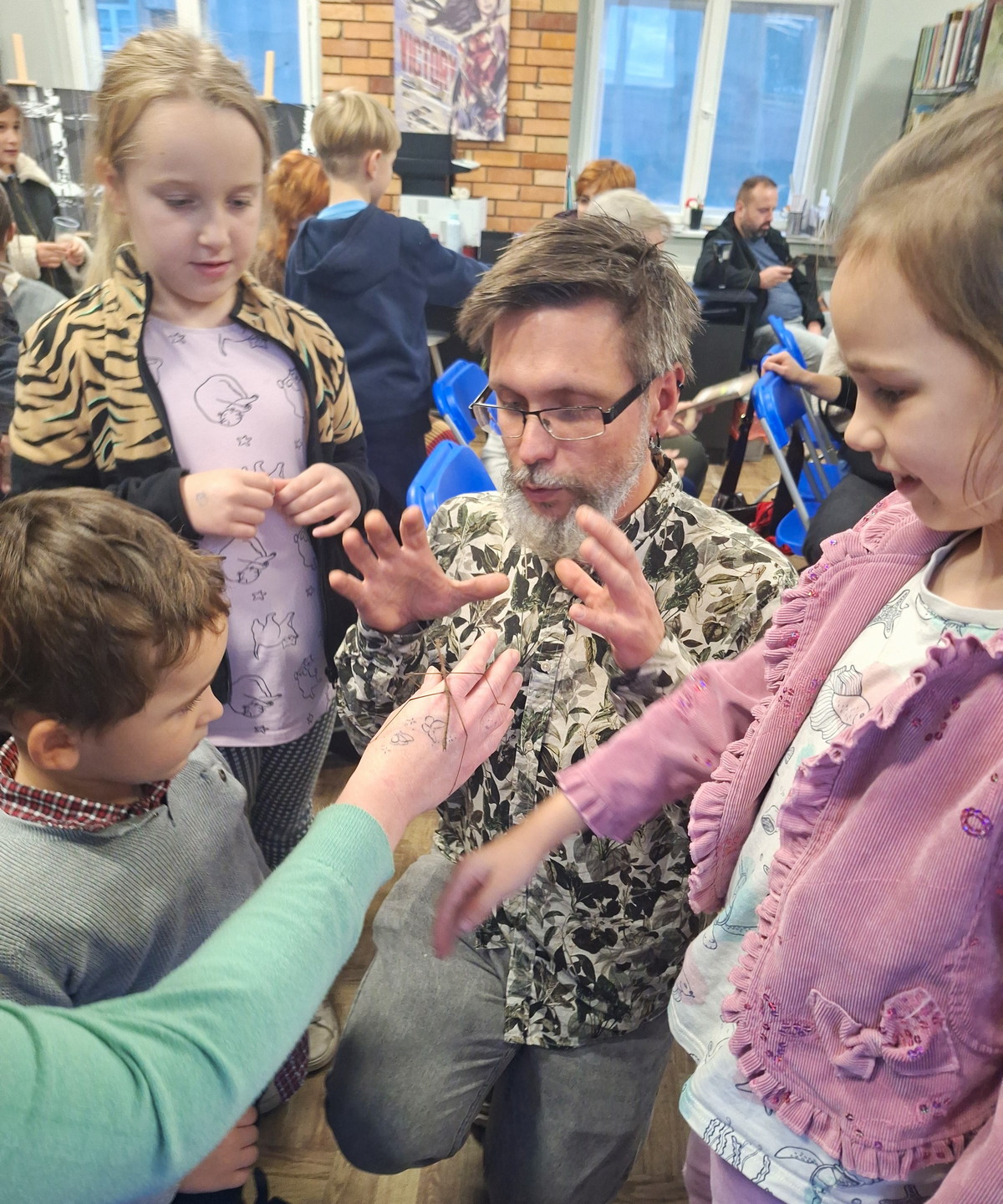 Wieczór rozpoczął się od fascynującego spotkania „Przecież nie takie straszne te ro... owady!”, które poprowadził dr Sebastian Pilichowski. Uczestnicy mieli niecodzienną okazję poznać bliżej niezwykły świat owadów – a nawet zobaczyć z bliska żywe okazy. Dla wielu była to pierwsza tak bliska (i emocjonująca!) styczność z egzotycznymi stworzeniami. Karaczany, patyczaki, straszyki i modliszka wzbudziły ogromne emocje – od zachwytu po lekką niepewność, szybko jednak ustępującą miejsca ciekawości i fascynacji. Spotkanie łączyło elementy edukacyjne z nutą przygody – nikt się nie nudził!