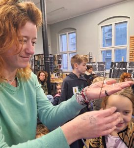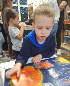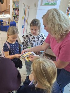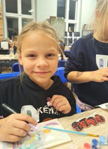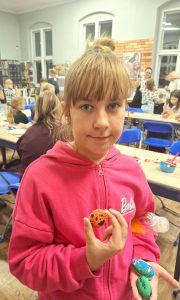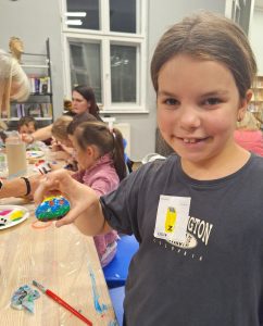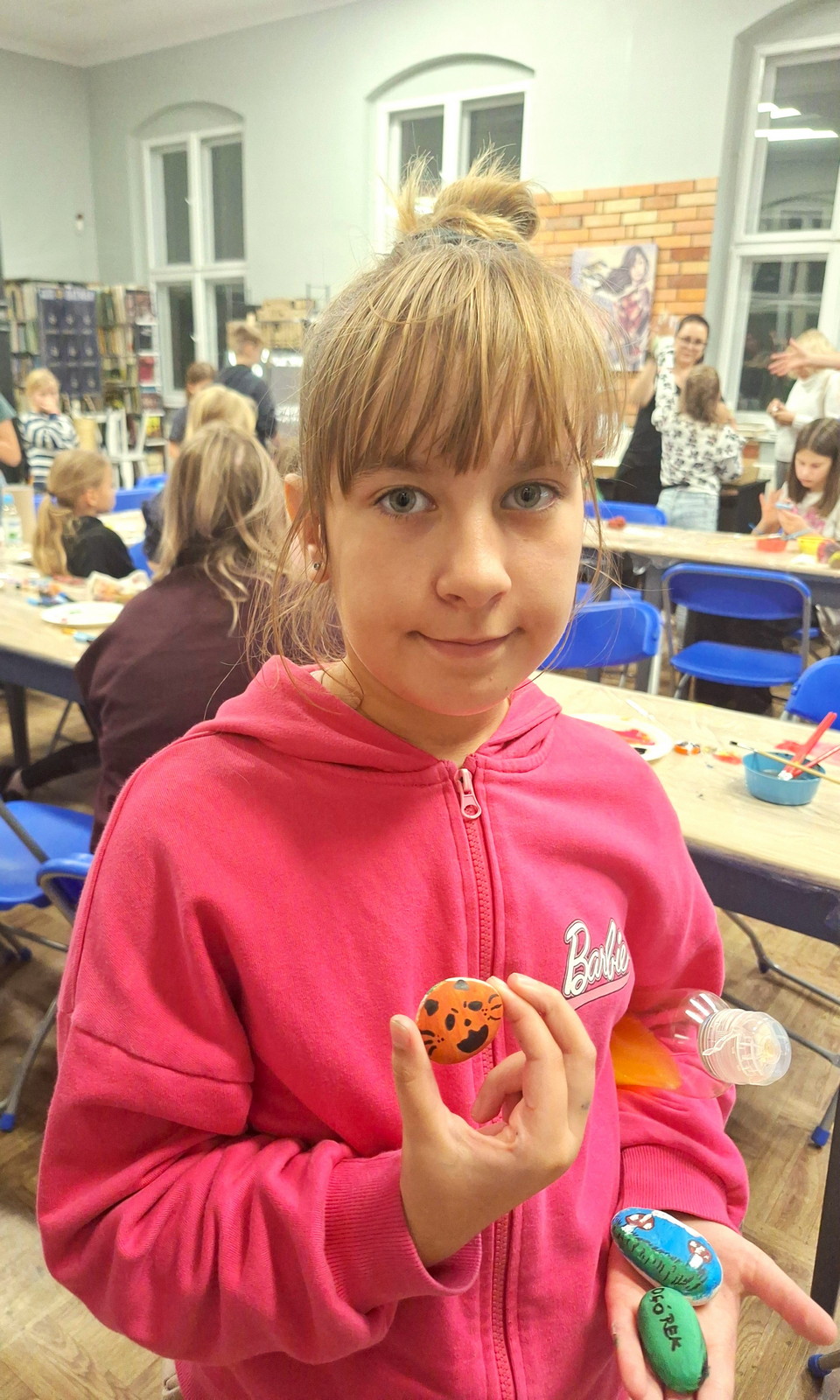 Kolejnym punktem programu były warsztaty artystyczne „Wędrujące kamienie”, prowadzone przez panią Bożenę Bojko – animatorkę kultury i naszą wierną czytelniczkę. Podczas zajęć uczestnicy poznali zasady tej popularnej w Polsce zabawy oraz ozdabiali kamienie, tworząc z nich małe, unikalne dzieła sztuki. Zajęcia pobudzały kreatywność i okazały się świetną okazją do twórczej zabawy zarówno dla dzieci, jak i dorosłych.