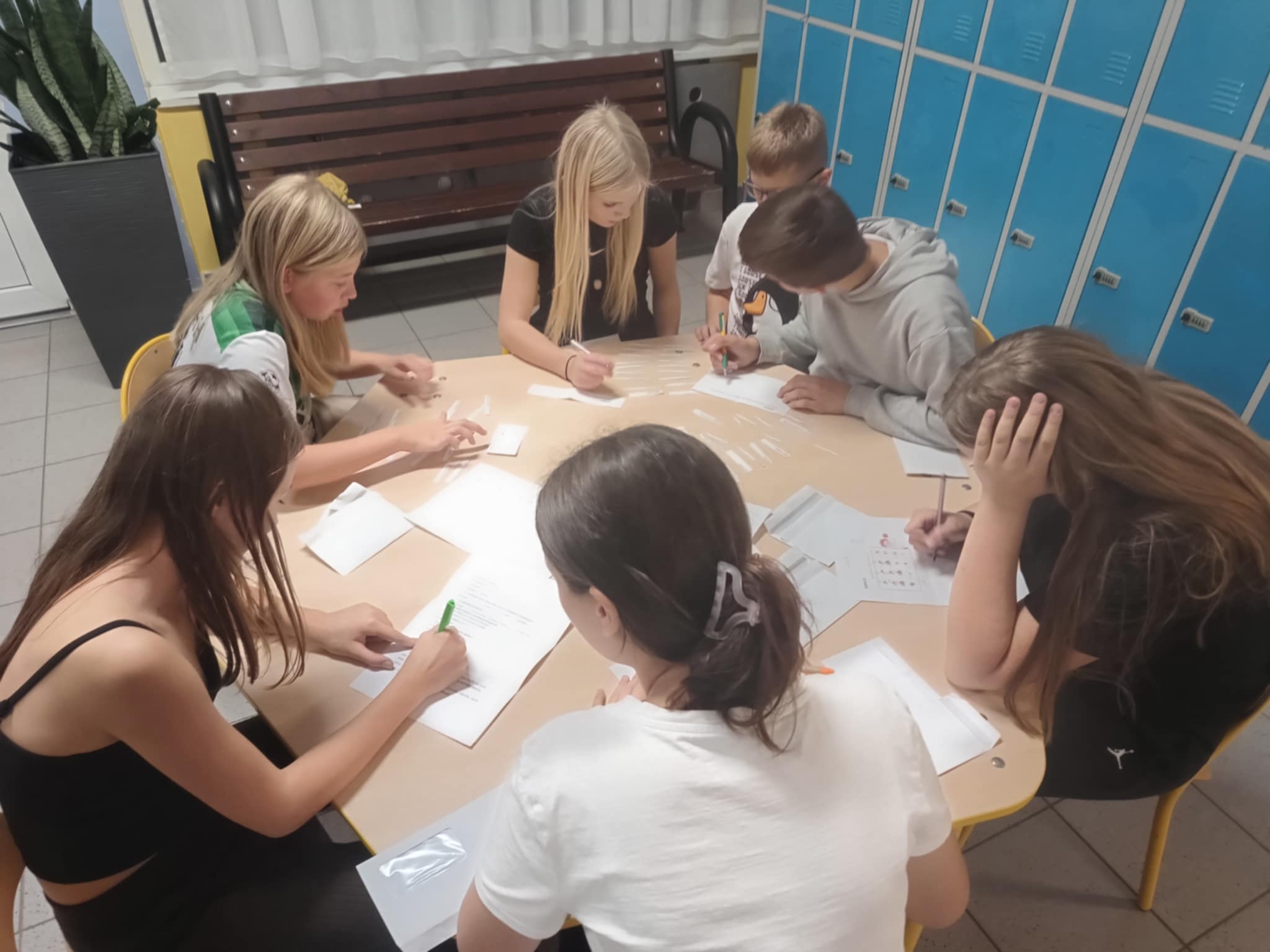 Nie zabrakło również zadań wymagających czytania ze zrozumieniem oraz znajomości podstawowych pojęć literackich i językowych. Dodatkową atrakcją były zadania logiczne, które sprawiły, że uczestnicy musieli połączyć wiedzę z kreatywnym myśleniem. Uczniowie wykazali się ogromnym zaangażowaniem, współpracą oraz pomysłowością. Wspólne rozwiązywanie zagadek nie tylko sprawiło im wiele radości, ale również pokazało, że nauka może być świetną zabawą i to bez telefonu 😊.