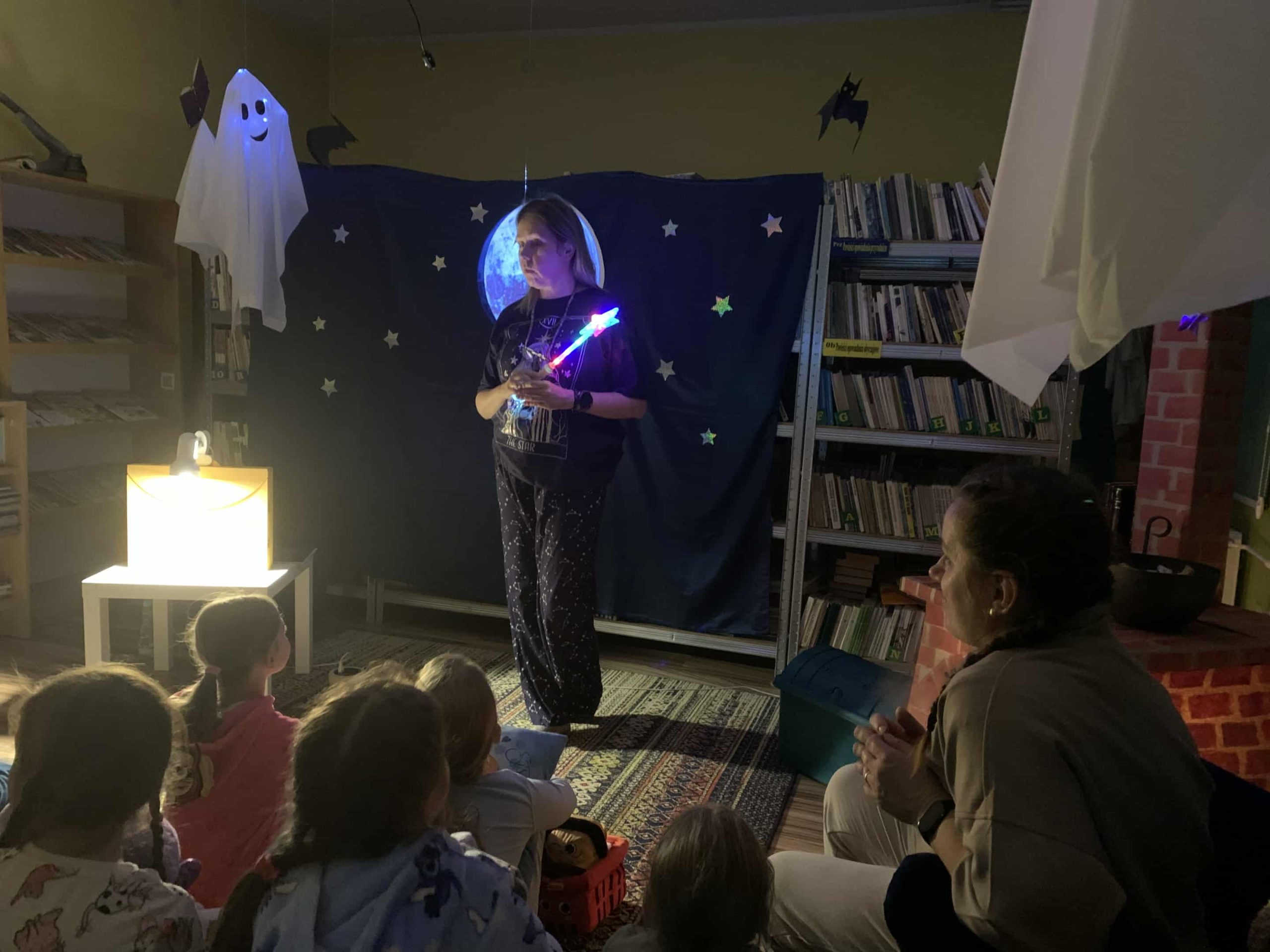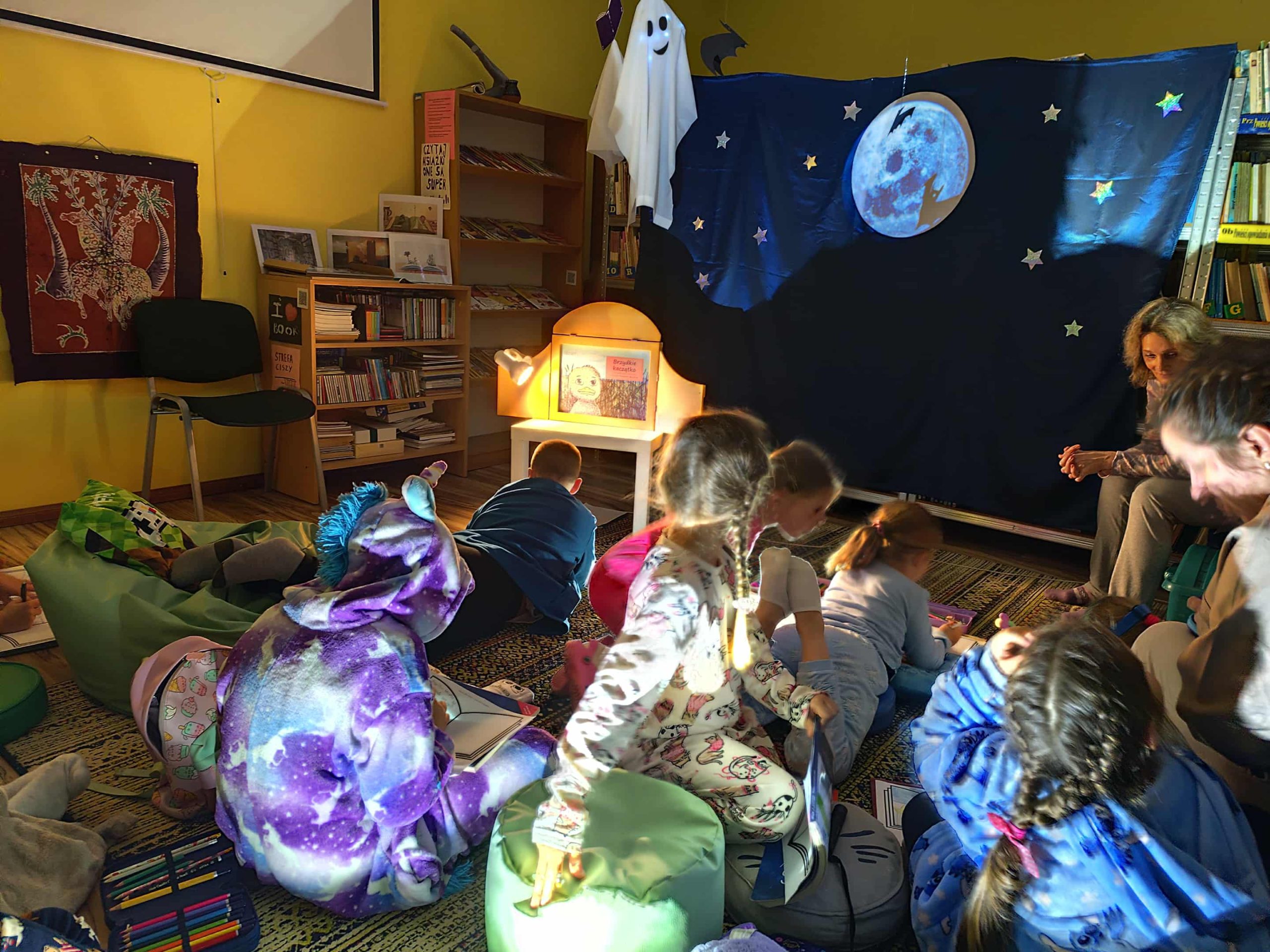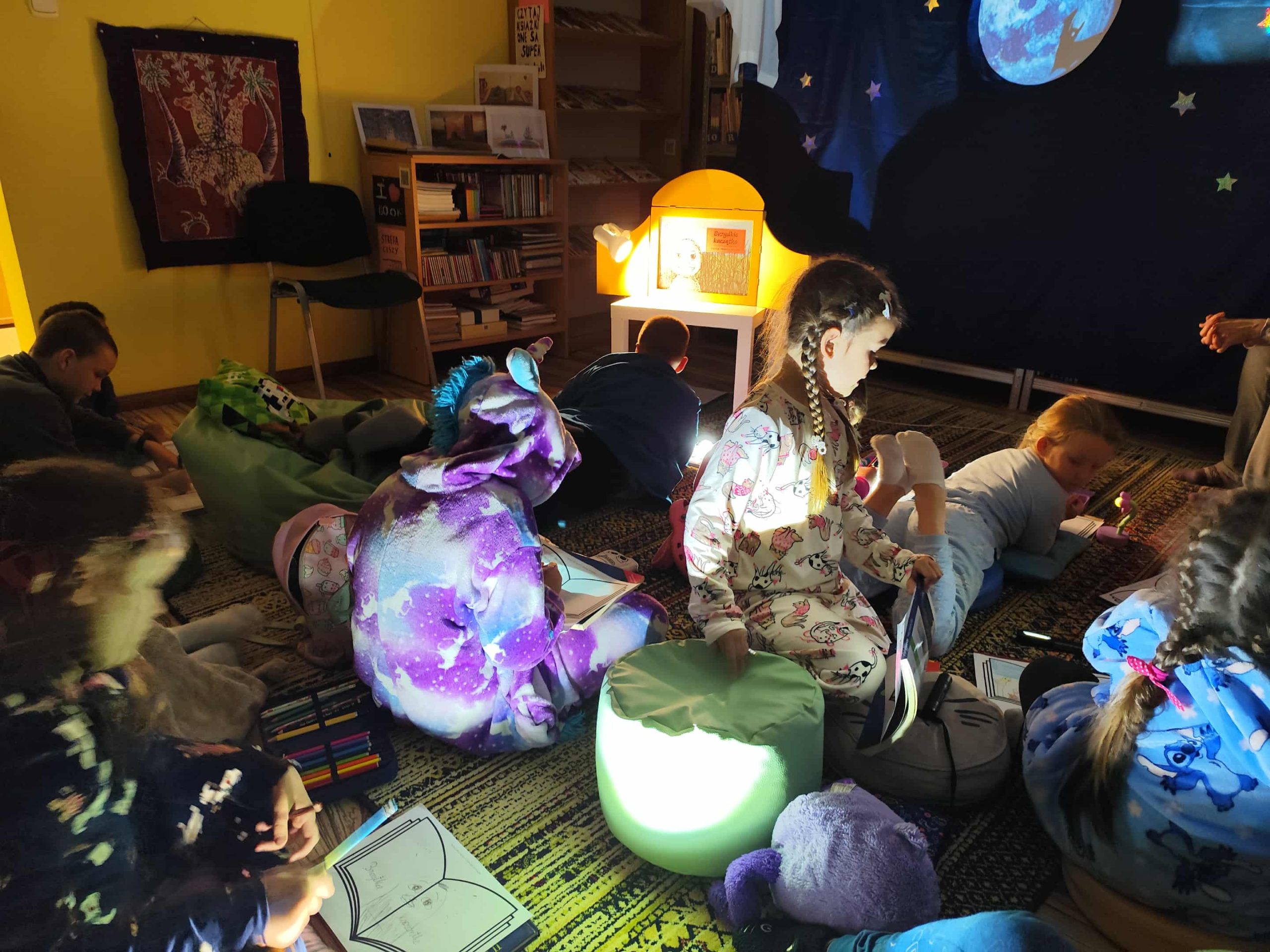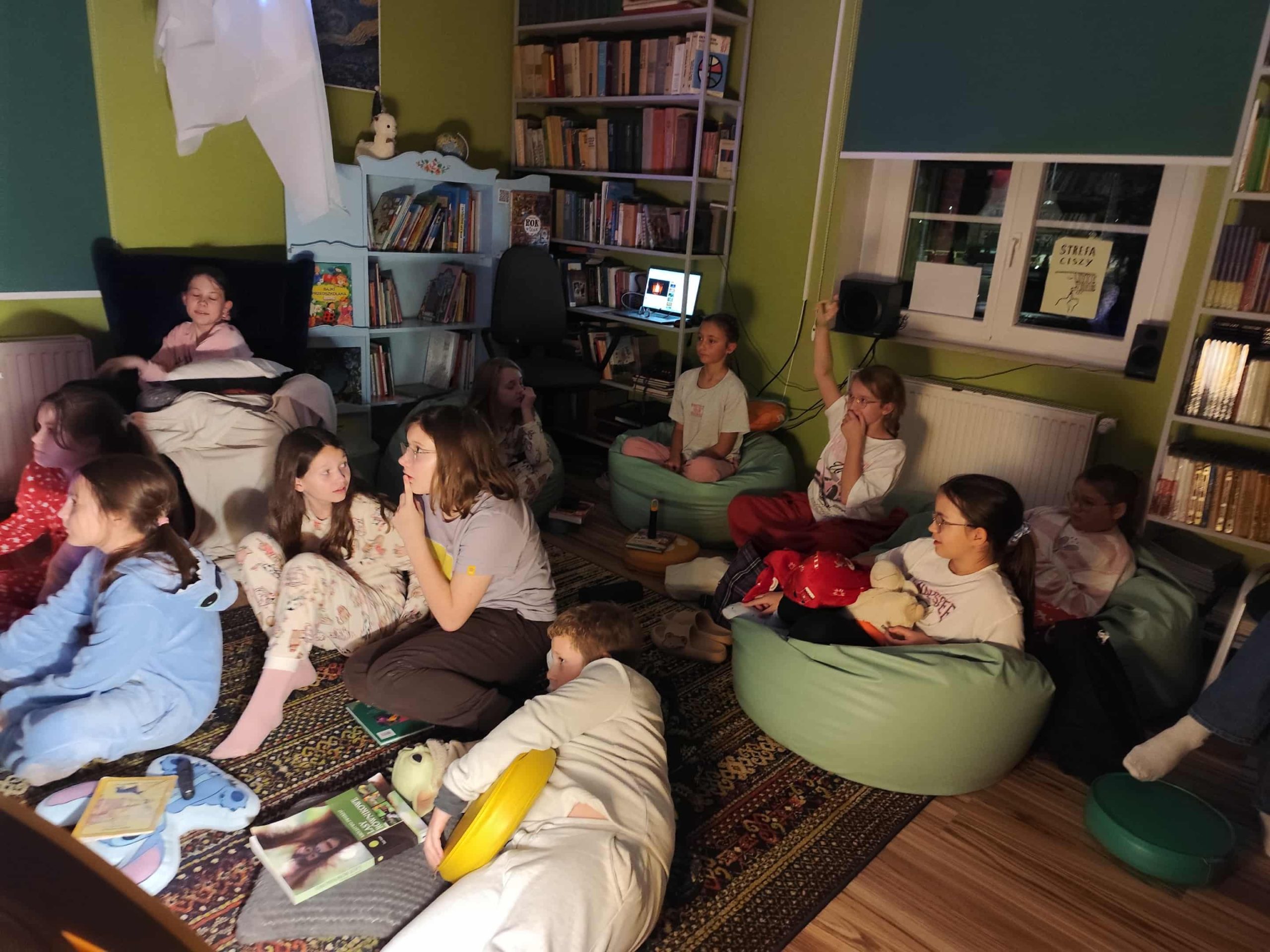 W dniu 17 października w bibliotece szkolnej odbyło się nocne spotkanie czytelnicze. Spotkanie miało na celu propagowanie czytelnictwa wśród naszych uczniów. W akcji wzięło udział 27 uczniów w dwóch grupach wiekowych. Uczniowie klas I-III w godzinach od 18:00 do 19:00, a klasy IV-VII w godz. od 19:00 do 20:00. Na początku spotkania przeprowadzona została relaksacja pt. "Jestem w kosmosie" z książki "Jesteś kimś wyjątkowym" Martyny Brody. Następnie został zaprezentowany teatrzyk Kamishibai z opowieściami pt. „Brzydkie Kaczątko” dla klas młodszych oraz „Pnącza zmartwień” dla starszych uczniów. Uczniowie wykonali karty pracy, w których zadaniem było opisanie lub narysowanie, o czym była ta opowieść. Przeprowadzono również pogadanki na temat tego, jakie ważne treści i wartości niosą ze sobą te utwory. Ponadto starsi uczniowie przynieśli swoje ulubione książki, o których opowiadali lub czytali ich fragmenty, zachęcając rówieśnków do sięgnięcia po nie. Przeprowadzono także zabawy aktywizujące. Na terenie biblioteki umieszczone były kody QR z cytatami do odczytania. W skrzyni pełnej skarbów przygotowane były przedmioty kojarzące się ze znanymi baśniami, wierszami i lekturami, które kolejno dzieci odgadywały. Uczestnicy rozwiązywali również labirynty. Aby oddać nastrój nocy, na tę okazję zostały przygotowane specjalne dekoracje, a uczestnicy spotkania ubrali się w piżamy i przynieśli ze sobą latarki i swoje ulubione przytulanki. Było mnóstwo emocji i dobrej zabawy. Po zakończonym spotkaniu uczniowie otrzymali pamiątkowe zakładki z logo akcji 2025 z hasłem "Do dzieła"