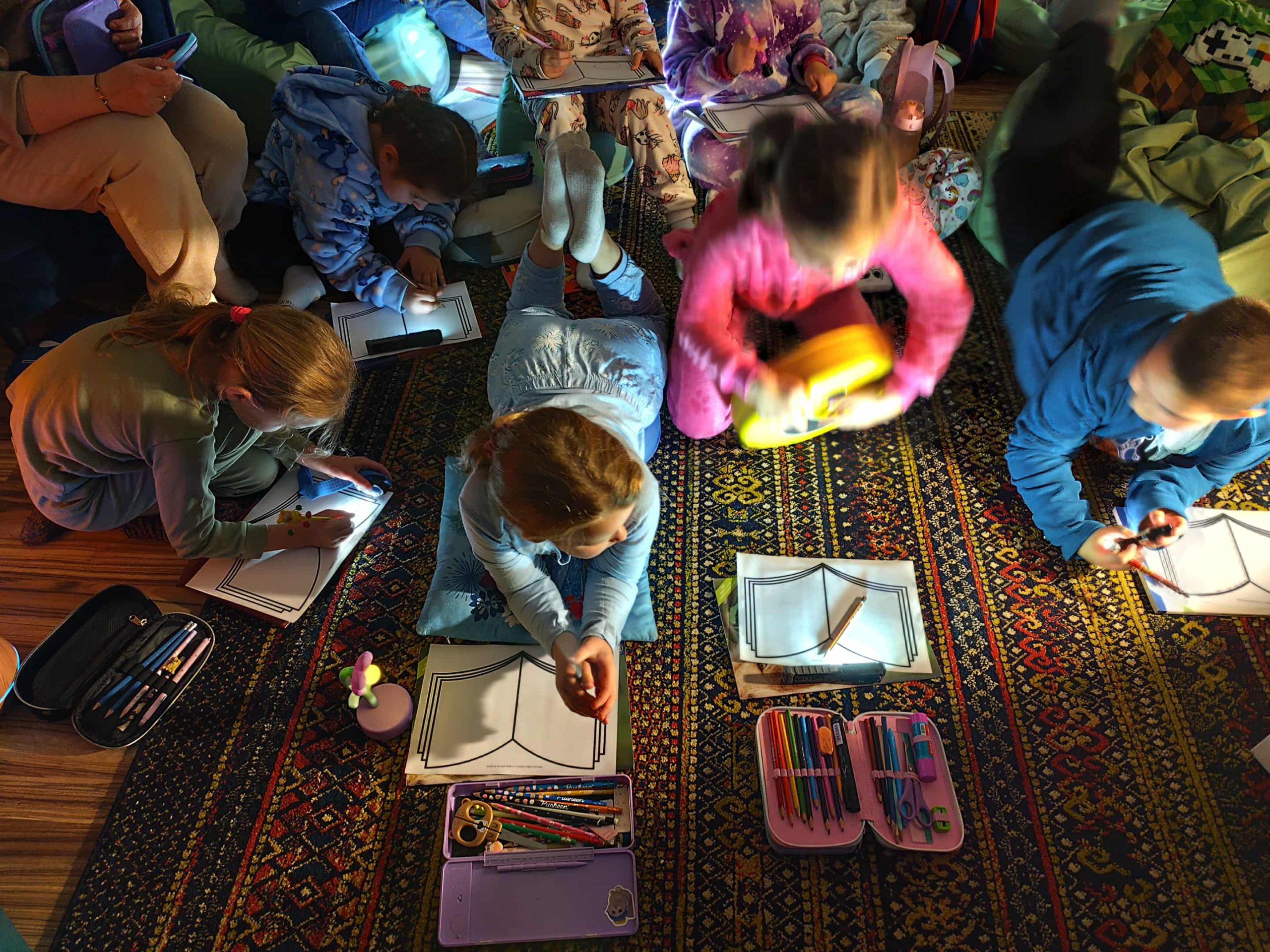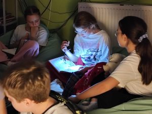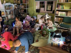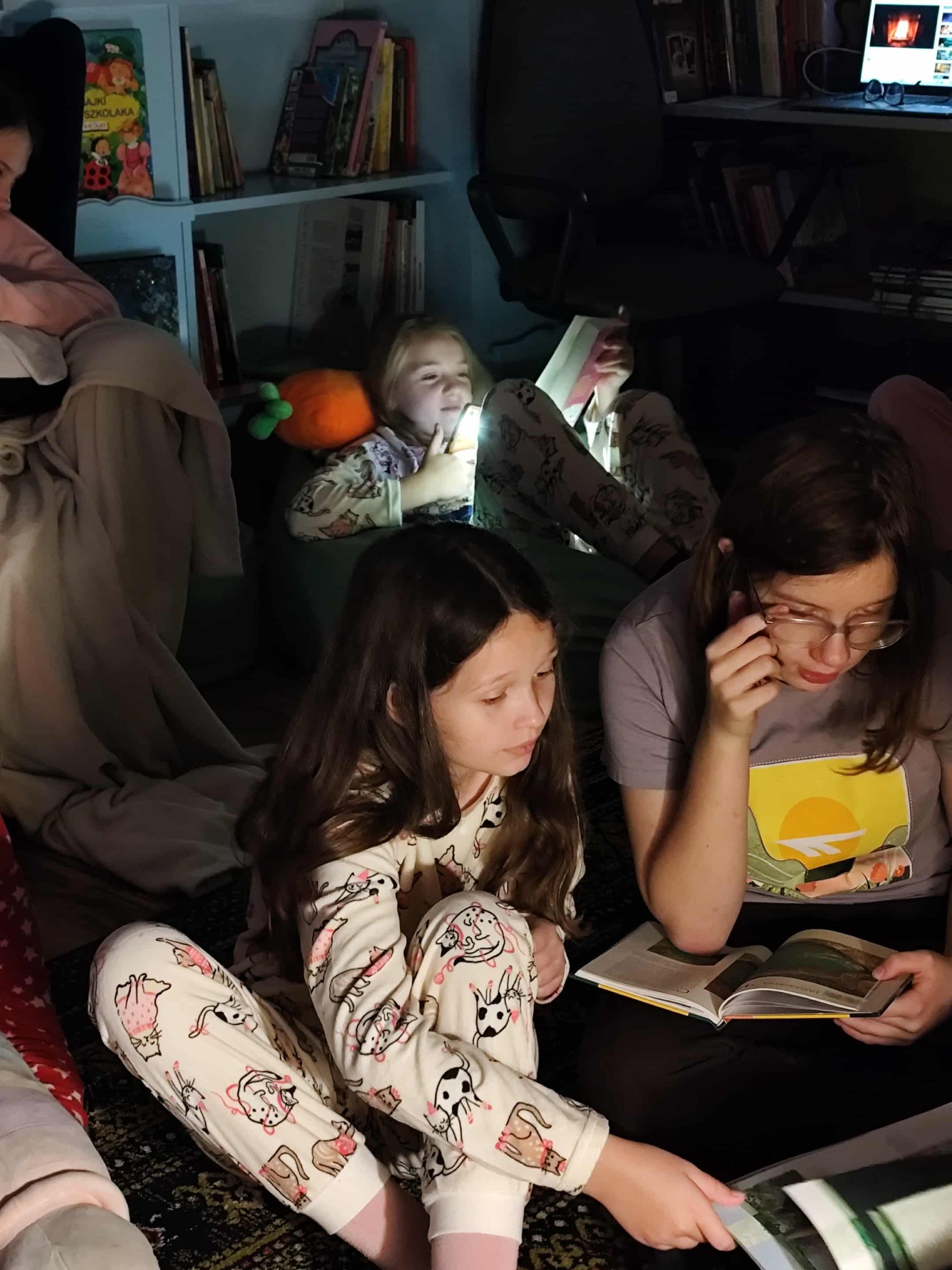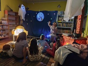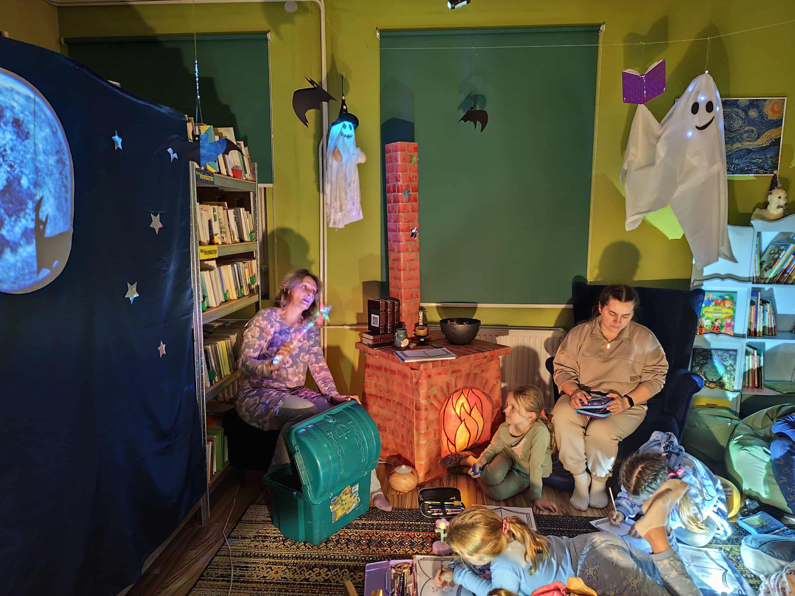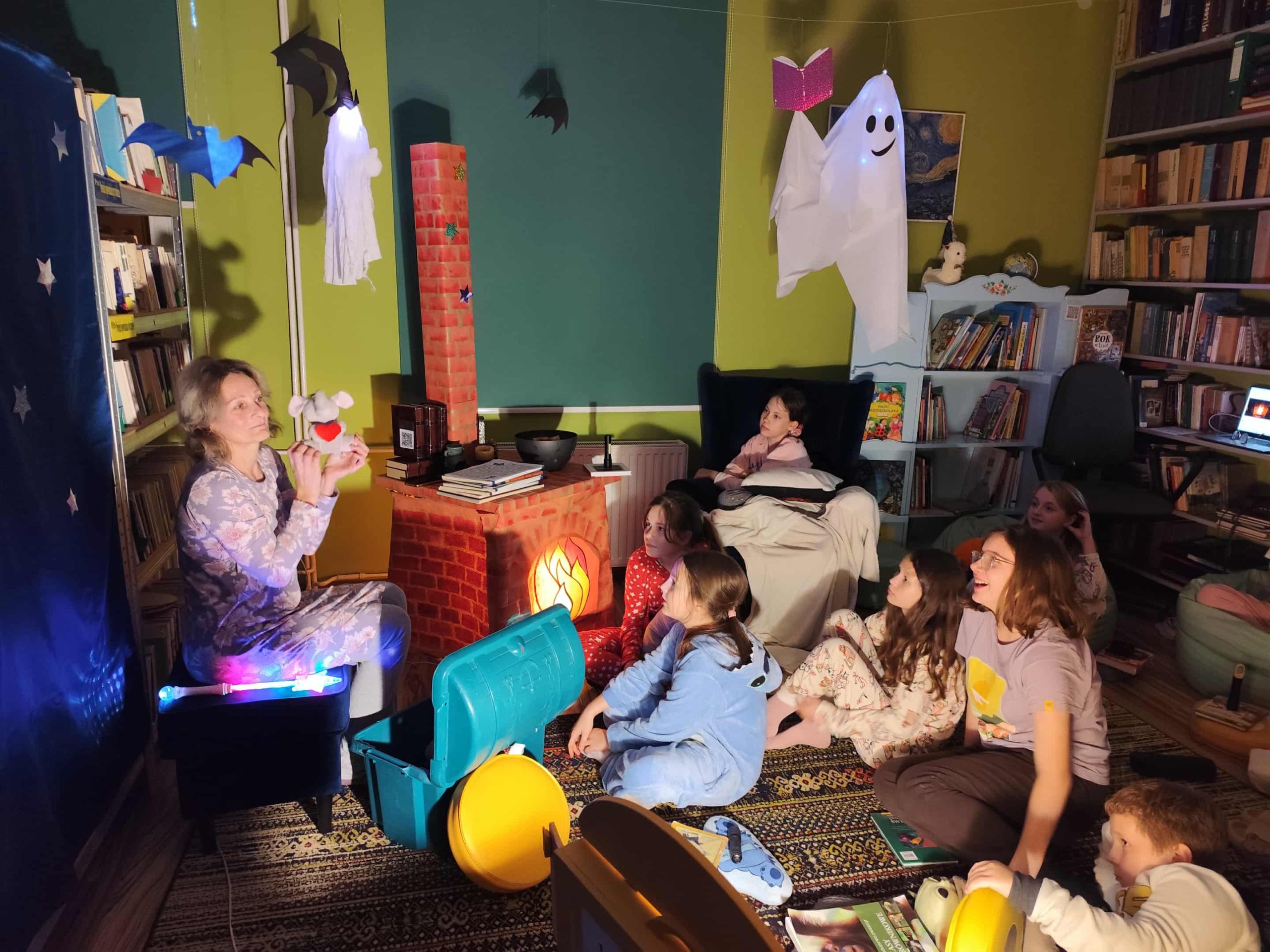 W dniu 17 października w bibliotece szkolnej odbyło się nocne spotkanie czytelnicze. Spotkanie miało na celu propagowanie czytelnictwa wśród naszych uczniów. W akcji wzięło udział 27 uczniów w dwóch grupach wiekowych. Uczniowie klas I-III w godzinach od 18:00 do 19:00, a klasy IV-VII w godz. od 19:00 do 20:00. Na początku spotkania przeprowadzona została relaksacja pt. "Jestem w kosmosie" z książki "Jesteś kimś wyjątkowym" Martyny Brody. Następnie został zaprezentowany teatrzyk Kamishibai z opowieściami pt. „Brzydkie Kaczątko” dla klas młodszych oraz „Pnącza zmartwień” dla starszych uczniów. Uczniowie wykonali karty pracy, w których zadaniem było opisanie lub narysowanie, o czym była ta opowieść. Przeprowadzono również pogadanki na temat tego, jakie ważne treści i wartości niosą ze sobą te utwory. Ponadto starsi uczniowie przynieśli swoje ulubione książki, o których opowiadali lub czytali ich fragmenty, zachęcając rówieśnków do sięgnięcia po nie. Przeprowadzono także zabawy aktywizujące. Na terenie biblioteki umieszczone były kody QR z cytatami do odczytania. W skrzyni pełnej skarbów przygotowane były przedmioty kojarzące się ze znanymi baśniami, wierszami i lekturami, które kolejno dzieci odgadywały. Uczestnicy rozwiązywali również labirynty. Aby oddać nastrój nocy, na tę okazję zostały przygotowane specjalne dekoracje, a uczestnicy spotkania ubrali się w piżamy i przynieśli ze sobą latarki i swoje ulubione przytulanki. Było mnóstwo emocji i dobrej zabawy. Po zakończonym spotkaniu uczniowie otrzymali pamiątkowe zakładki z logo akcji 2025 z hasłem "Do dzieła"