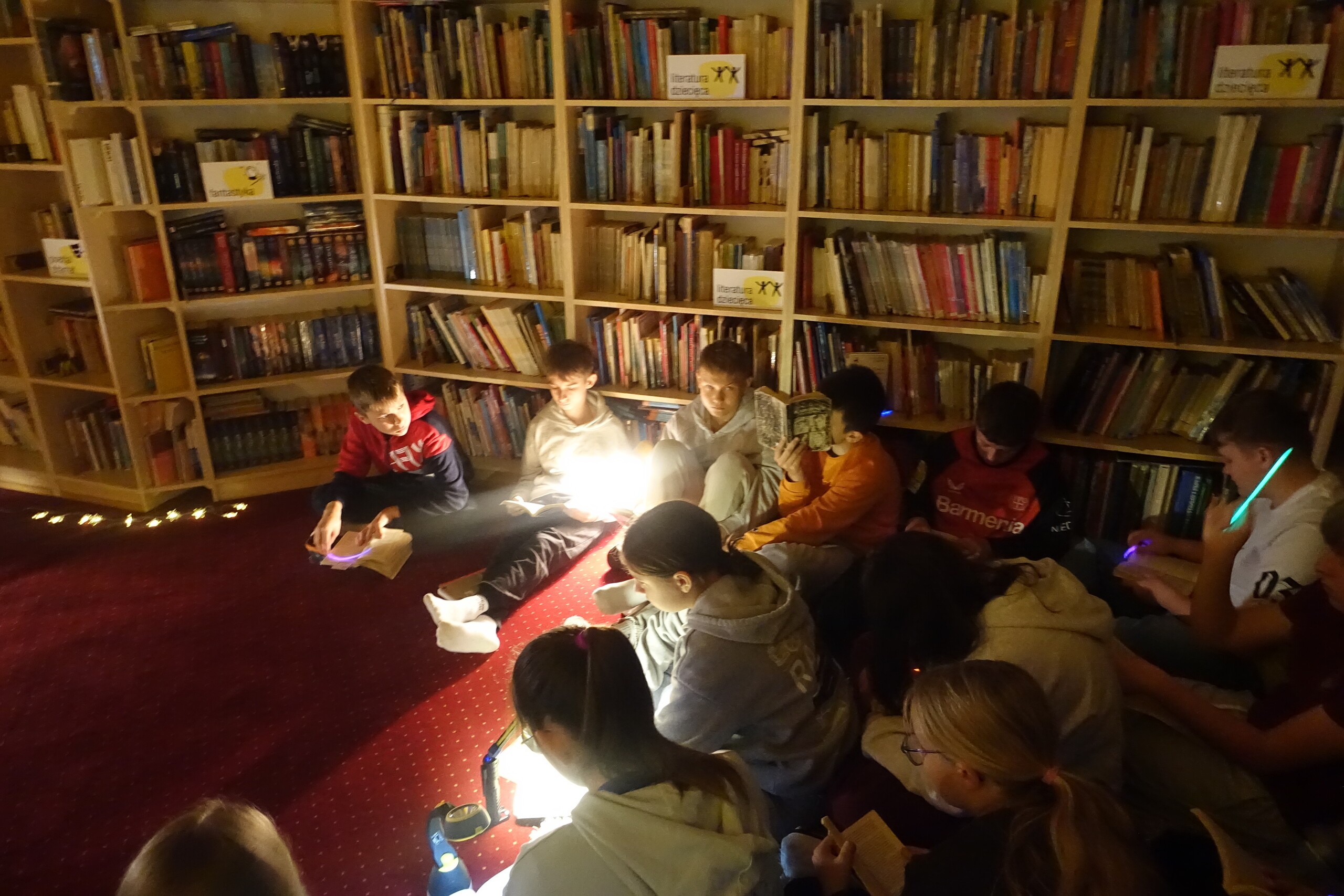 Z kolei na dodatkowych zajęciach z języka polskiego uczniowie z towarzyszeniem latarek i małych lampek czytali w naszej Mediatece "Tajemnicę biblioteki" z popularnej serii "Biuro detektywistyczne Lassego i Mai" Martina Widmarka, a na zajęciach bibliotecznych w zaciemnionym pomieszczeniu naszej "Narnii" - czytelni Biblioteki Szkolnej w Wicku - klasa VIB przeczytała również tego autora fragmenty jednej z książek z gatunku fantasy ulubionej serii młodszych nastolatków: "Nelly Rapp i Noc Czarownic".