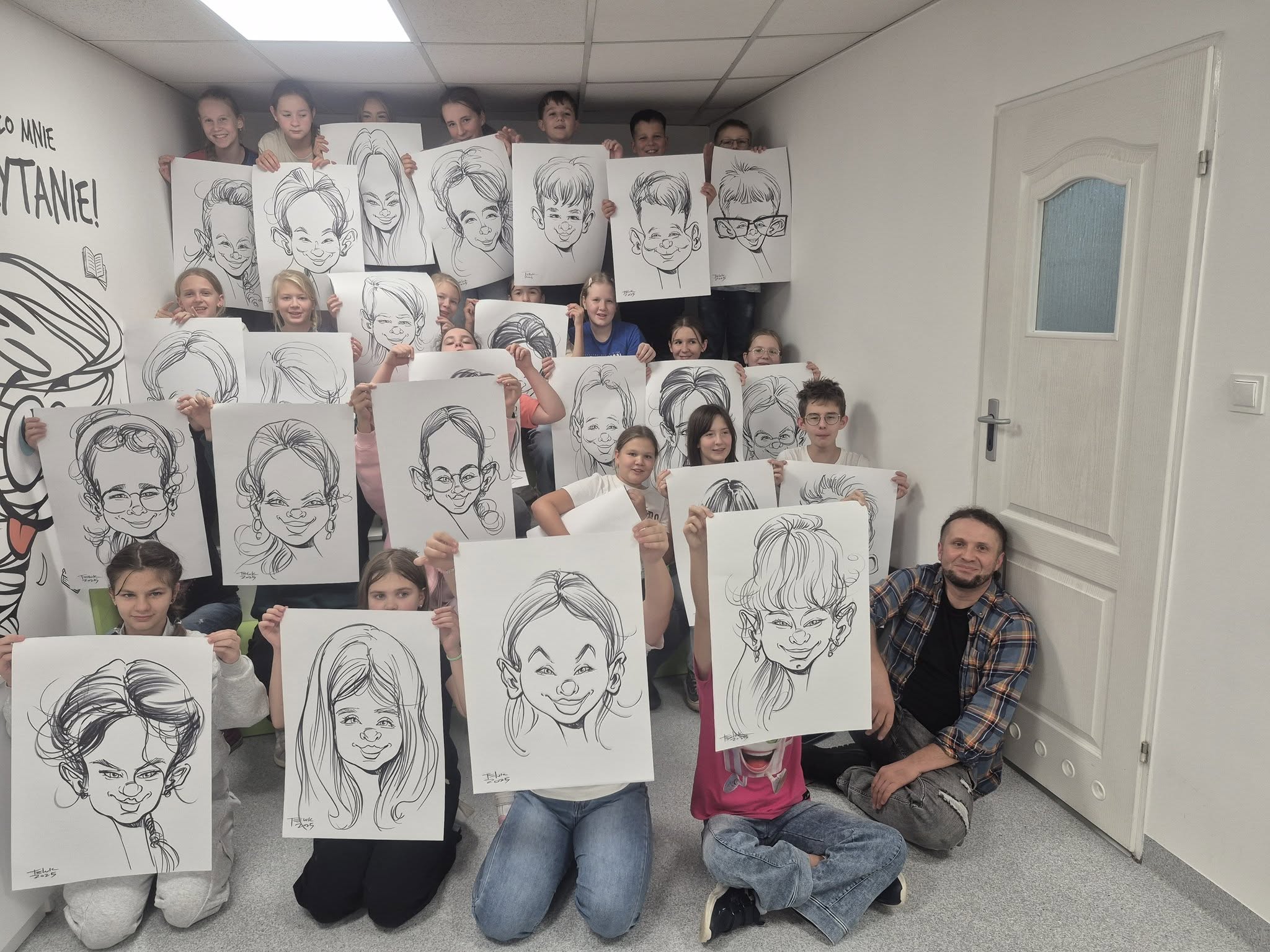 🎭 To jednak nie koniec atrakcji! Gościem specjalnym wieczoru był Szymon Teluk – karykaturzysta, który stworzył dla każdego uczestnika zabawną i przepiękną karykaturę 🎨🖌️.
