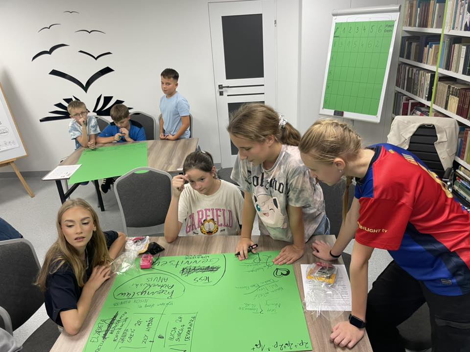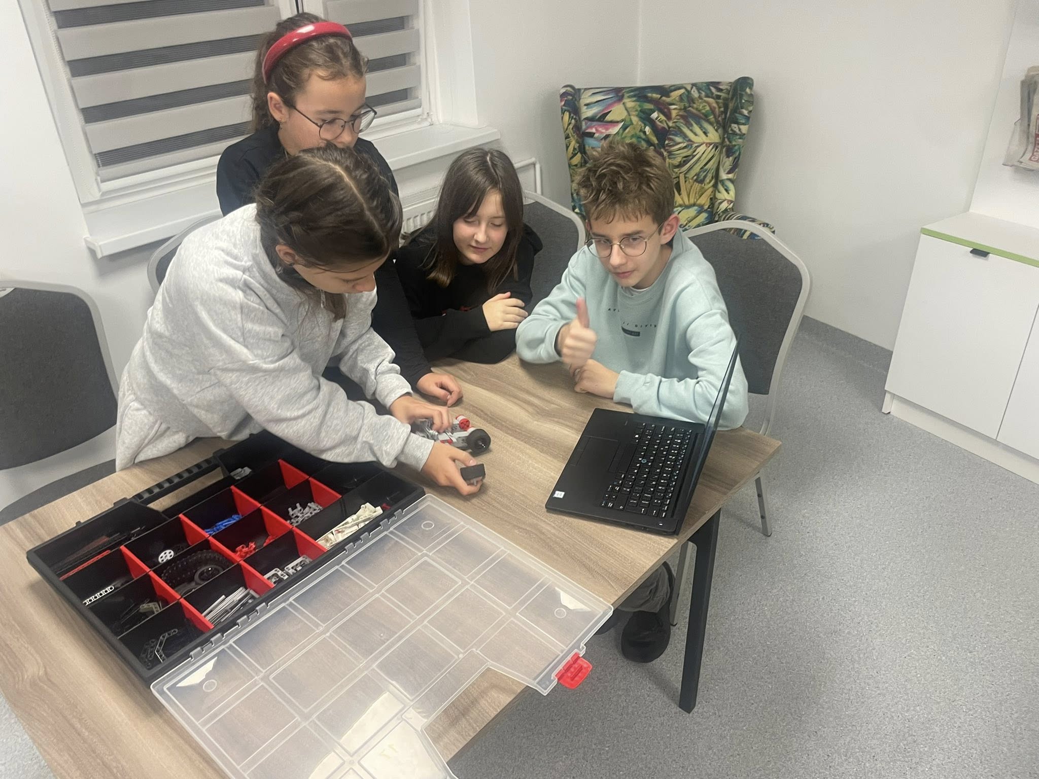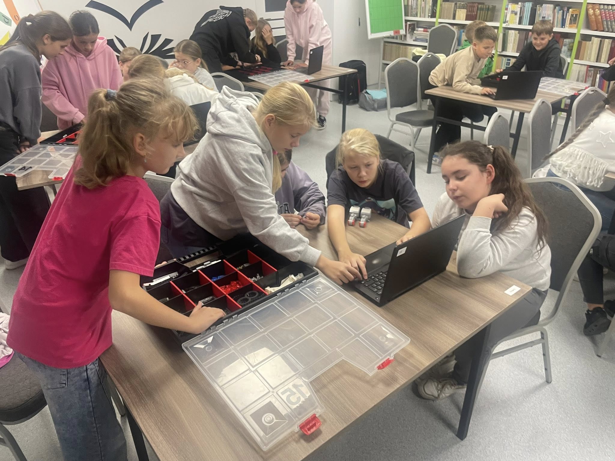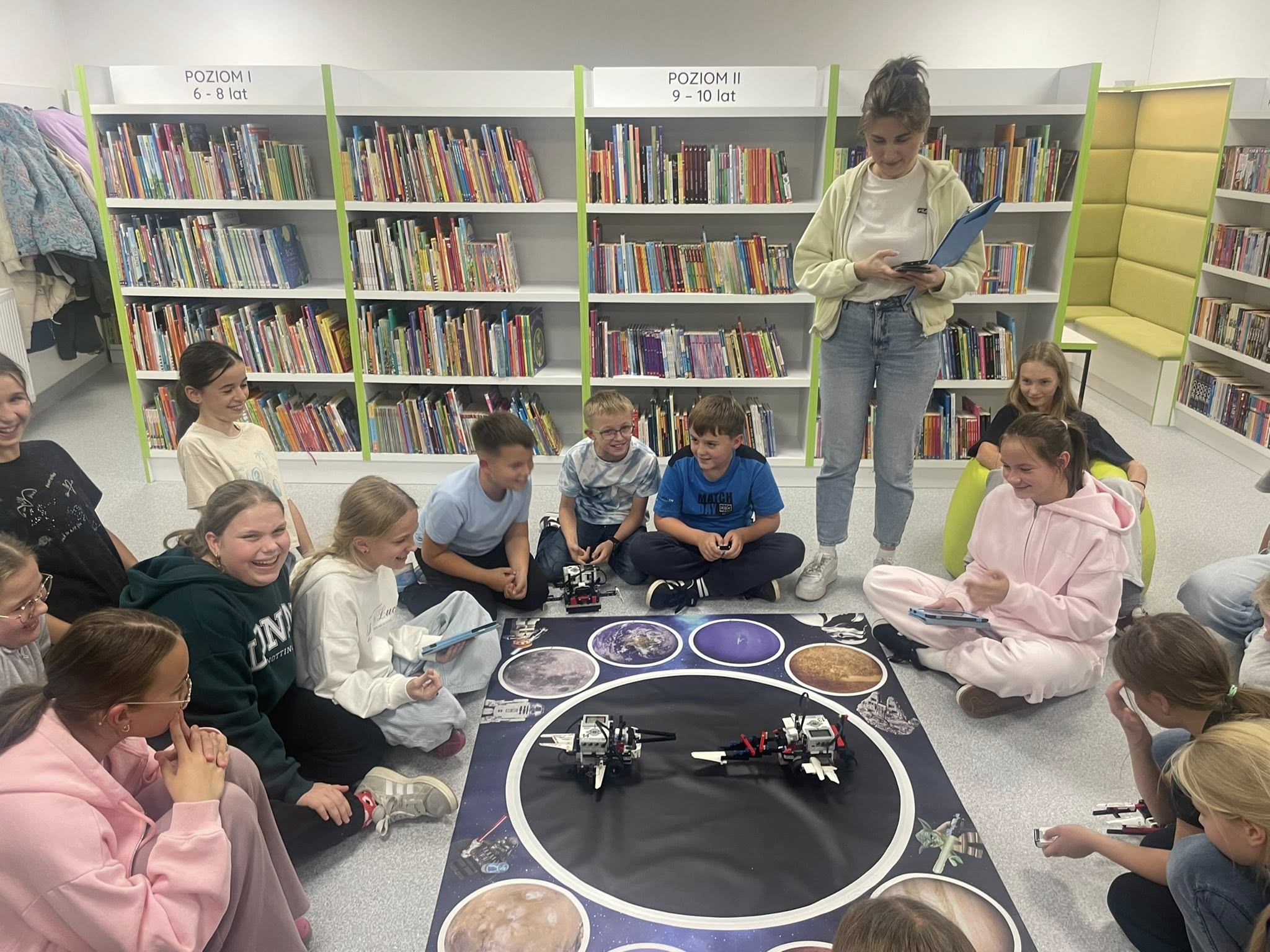 🤖 Następnie przenieśliśmy się do Gminnej Biblioteki Publicznej w Dobrzycy, gdzie czekały fascynujące warsztaty z LEGO Robotyki poprowadzone przez panią Magdalenę Rosińską. Budowanie i programowanie własnych robotów sumo wciągnęło dzieci bez reszty! Ogromną frajdą były również walki robotów na specjalnym ringu – emocje sięgały zenitu!