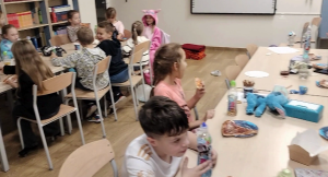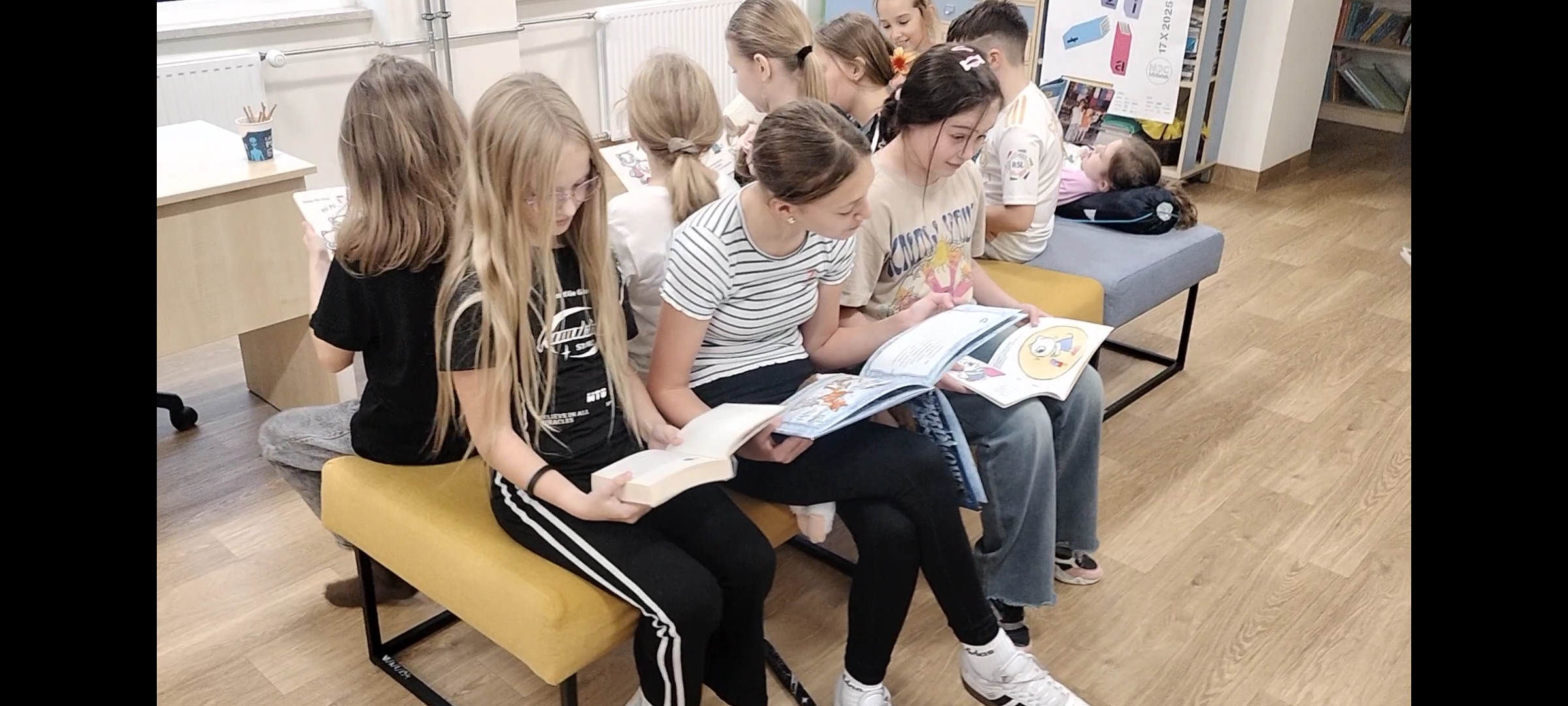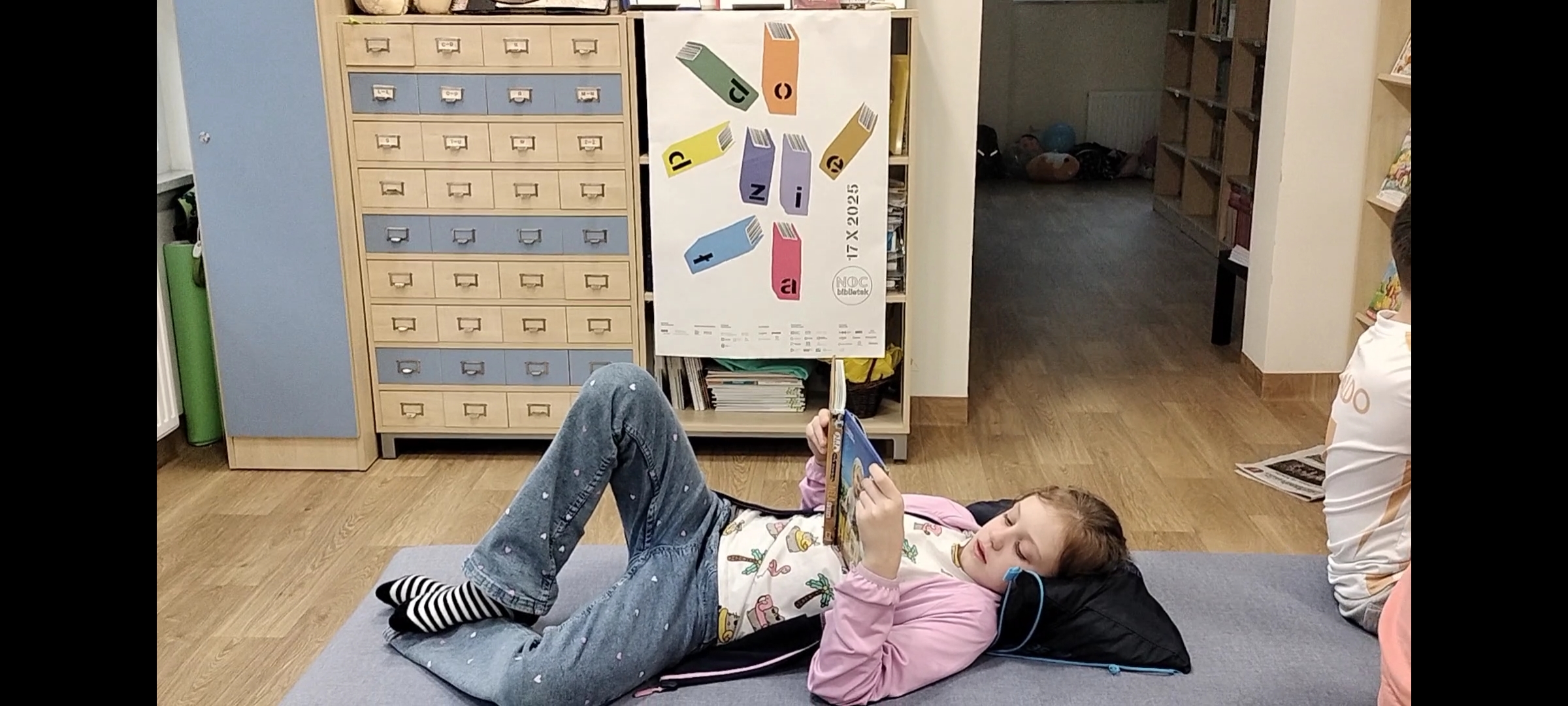 Pomimo deszczu, tradycyjne „czytanie pod chmurką” odbyło się w bibliotece. Uczestnicy wybrali dowolne książki, czytali ich fragmenty, a następnie tworzyli alternatywne zakończenia osadzone w tematyce kosmosu – powstały zabawne, futurystyczne i zaskakujące wersje znanych historii.