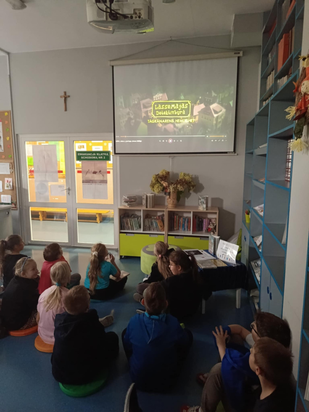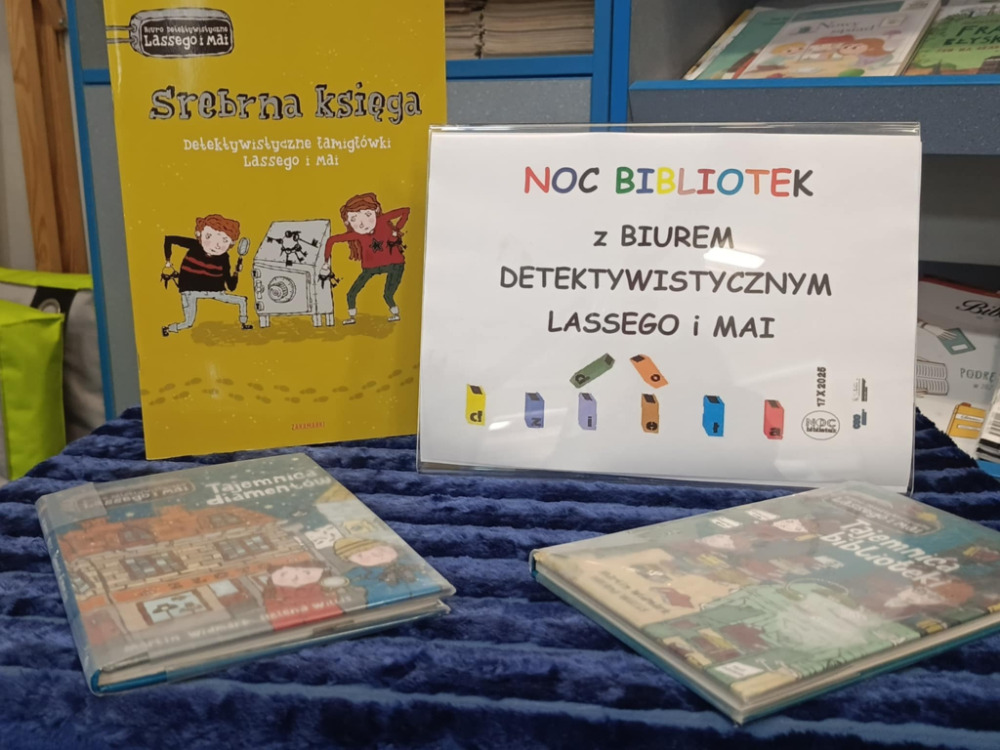 17 października nasza biblioteka szkolna zmieniła się w biuro detektywistyczne Lassego i Mai. Naszą przygodę rozpoczęliśmy z udziałem uczniòw kl. 3b, 5b i 8c. W tegoroczny klimat Nocy Bibliotek wprowadziły nas wiersze Joanny Muller pt."Jest taki portal" i "Wezwanie". Po rozszyfrowaniu hasła "Do dzieła", wspólnie czytaliśmy fragmenty przygód młodych detektywów Lassego i Mai oraz rozwiązywaliśmy łamigłówki ze Złotej i Srebrnej Księgi. Kolejnym punktem programu była projekcja filmu pt."Biuro detektywistyczne Lassego i Mai.Rabuś z pociągu". Tegoroczna "Noc Bibliotek" pokazała, że biblioteka to nie tylko miejsce książek, ale także wspaniałe miejsce do spotkań, rozmów, odpoczynku i twórczej zabawy.