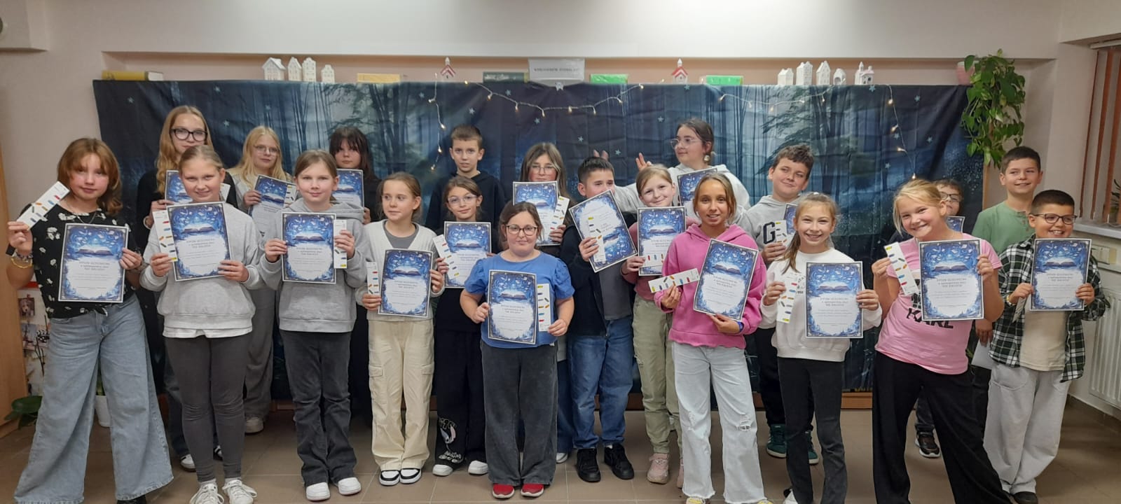 Wieczór rozpoczął się od uroczystego powitania uczestników, przedstawienia krótkiej prezentacji idei Nocy Bibliotek oraz odczytania wiersza poetki Joanny Mueller pt: „Jest taki portal” napisanego specjalnie na tegoroczną edycję. Następnie odbyło się wspólne czytanie książki pt: Biuro Detektywistyczne Lassego i Mai, Tajemnica pożarów, którą nasza biblioteka otrzymała w ramach akcji. Książka o młodych detektywach wprowadziła uczestników w klimat kreatywnego działania i współpracy. Przy czytaniu należało zasiąść na fotelu bujanym😊 Każdy uczeń przyniósł również swoją ulubioną książkę, opowiedział o niej i zainspirował innych do sięgnięcia po nią. Kilku uczestników również przyniosło książki do akcji „ Podziel się książką”. Następnie uczniowie mieli okazję wspólnie stworzyć barwny mural, inspirowany motywem przewodnim wydarzenia. Jednym z najbardziej emocjonujących punktów programu była gra biblioteczna czyli poszukiwanie w półmroku, z użyciem latarek, ukrytych zagadek. Pomiędzy regałami i nie tylko ukryto koperty z zagadkami literackimi. Po odnalezieniu uczestnicy musieli odgadnąć o jaką książkę chodzi i odszukać ją w bibliotece, ponieważ był w niej umieszczony szyfr Offendorfa. Każda poprawnie rozwiązana łamigłówka prowadziła młodych detektywów coraz bliżej celu - odnalezienia klucza ukrytego w bibliotece do szkatułki ze słodką nagrodą. Radość z odkrycia była ogromna! Nie zabrakło również filmowych emocji - uczestnicy obejrzeli fragment filmu: Biuro Detektywistyczne Lassego i Mai. Rabuś z pociągu, który doskonale wpisał się w detektywistyczny nastrój wieczoru. Podczas imprezy panowała przyjazna, wesoła i twórcza atmosfera. Uczniowie chętnie brali udział w zabawach logicznych, rozwiązywali łamigłówki i wymieniali się pomysłami w trakcie słodkiego poczęstunku i herbatki. Na koniec otrzymali dyplom uczestnictwa oraz zakładki.