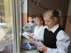 W młodszych klasach I–III atmosfera była pełna twórczej energii. Uczniowie tworzyli własne wersje słynnego dzieła „Mona Lisa”, bawiąc się kolorem, fakturą i wyobraźnią. Z zainteresowaniem obejrzeli film „Rabuś w pociągu”, a następnie uczestniczyli w zabawach i quizach związanych z książkami. Najważniejsze jednak, że każde z dzieci miało książkę w dłoni – czytanie było obecne przez cały czas w zabawie, rozmowie i działaniu.