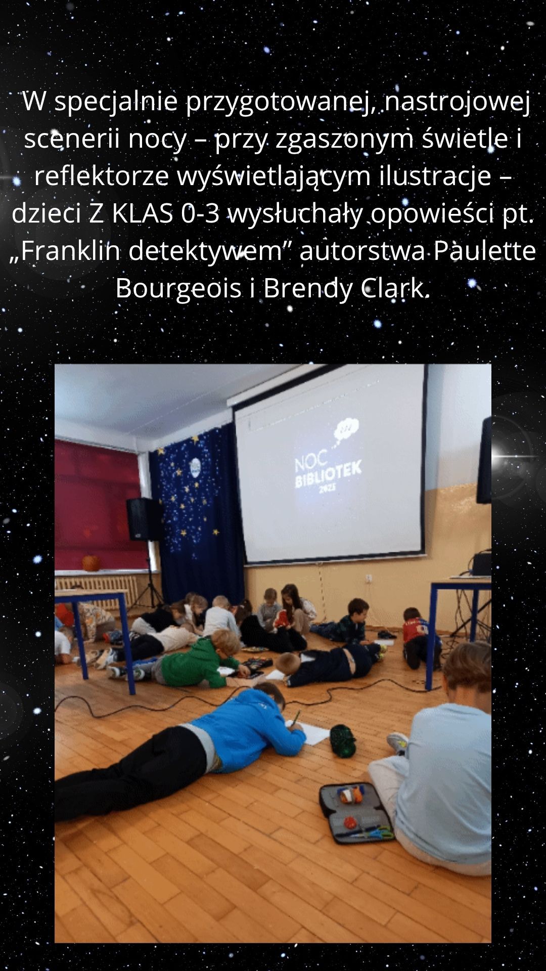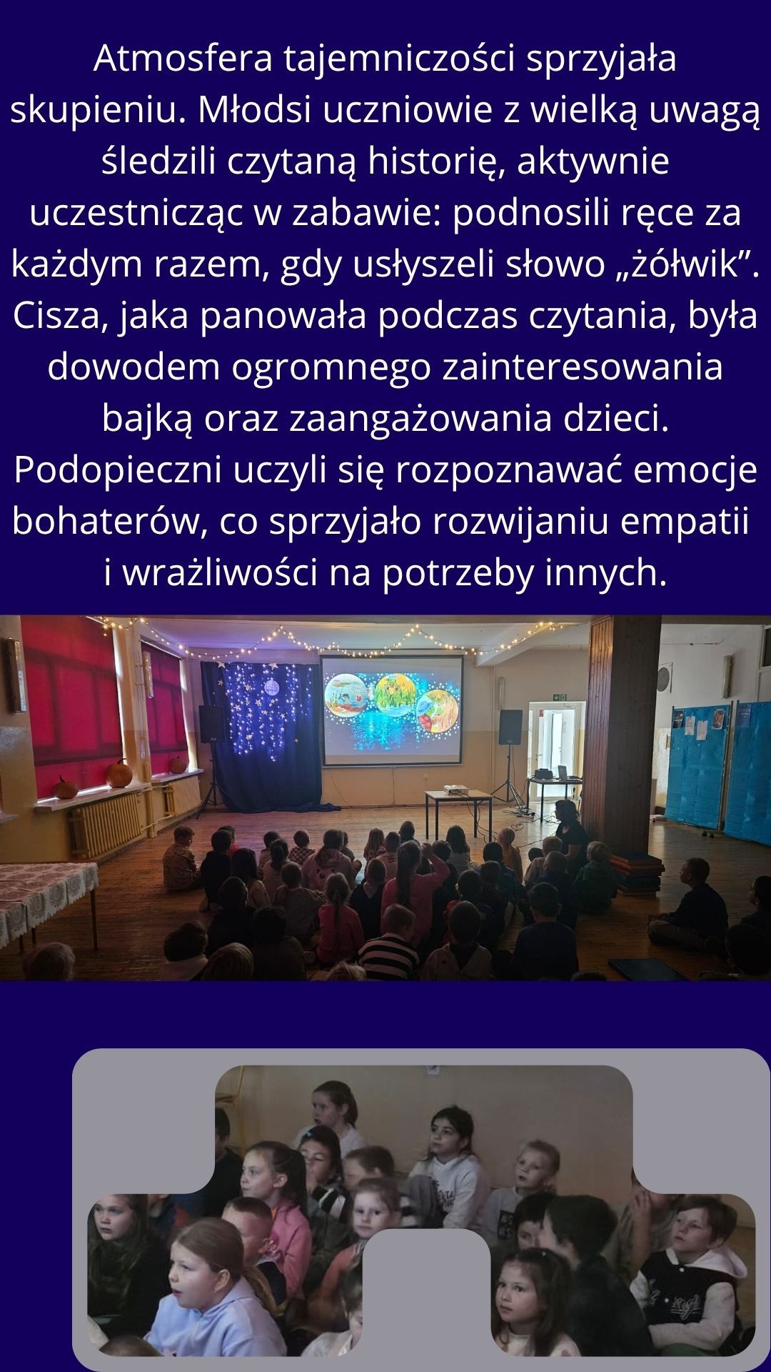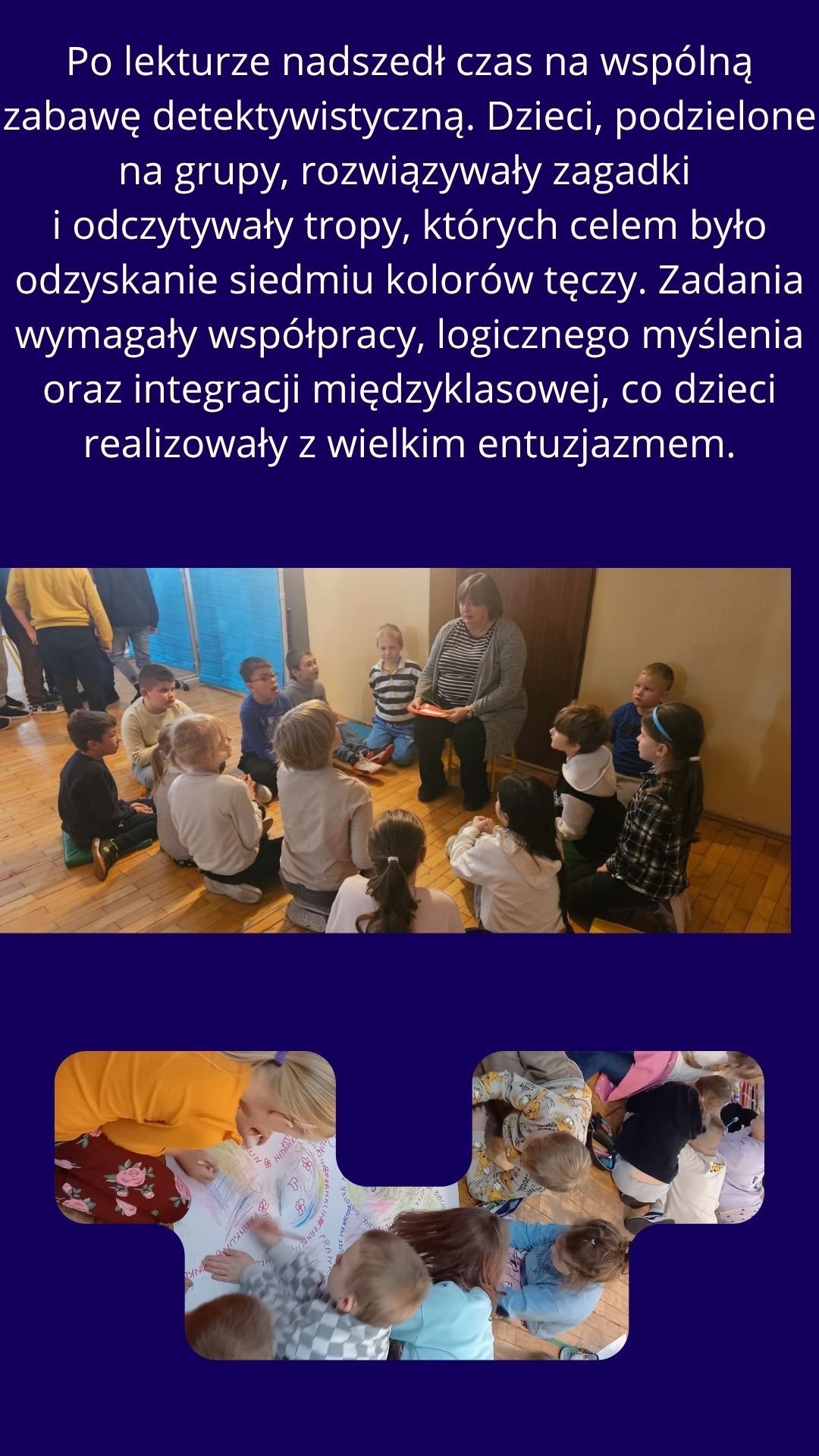 W specjalnie przygotowanej, nastrojowej scenerii nocy – przy zgaszonym świetle i reflektorze wyświetlającym ilustracje – dzieci Z KLAS 0-3 wysłuchały opowieści pt. „Franklin detektywem” autorstwa Paulette Bourgeois i Brendy Clark. Atmosfera tajemniczości sprzyjała skupieniu. Młodsi uczniowie z wielką uwagą śledzili czytaną historię, aktywnie uczestnicząc w zabawie: podnosili ręce za każdym razem, gdy usłyszeli słowo „żółwik”. Cisza, jaka panowała podczas czytania, była dowodem ogromnego zainteresowania bajką oraz zaangażowania dzieci. Podopieczni uczyli się rozpoznawać emocje bohaterów, co sprzyjało rozwijaniu empatii i wrażliwości na potrzeby innych. Po lekturze nadszedł czas na wspólną zabawę detektywistyczną. Dzieci, podzielone na grupy, rozwiązywały zagadki i odczytywały tropy, których celem było odzyskanie siedmiu kolorów tęczy. Zadania wymagały współpracy, logicznego myślenia oraz integracji międzyklasowej, co dzieci realizowały z wielkim entuzjazmem. Zwieńczeniem spotkania było stworzenie kaligramów – oryginalnych dzieł plastycznych zbudowanych z liter i słów, inspirowanych zdobytymi kolorami tęczy. Na zakończenie wszyscy uczestnicy zostali zaproszeni na poczęstunek przygotowany przez rodziców, który był miłym dopełnieniem tego pełnego wrażeń wydarzenia.