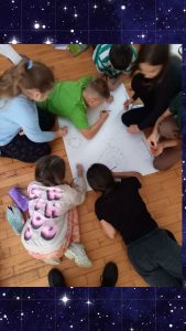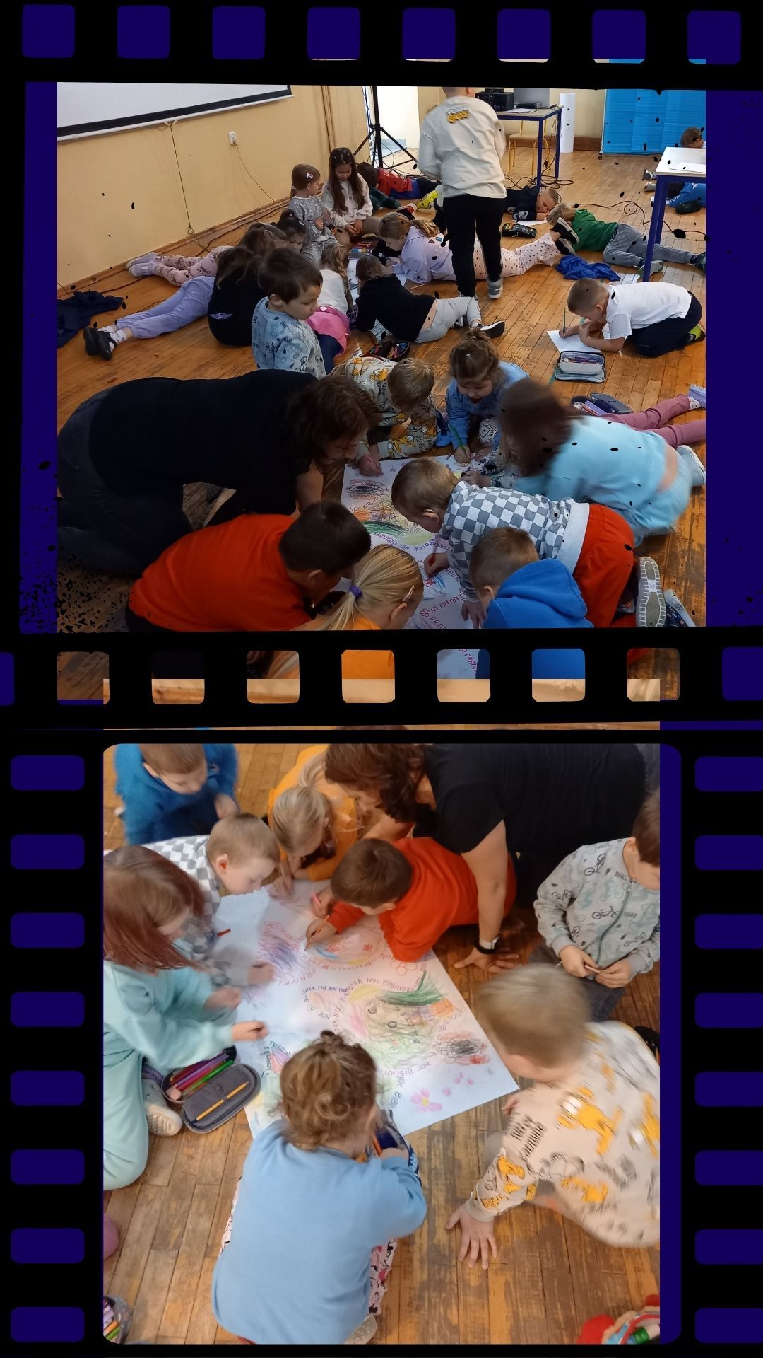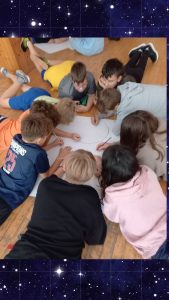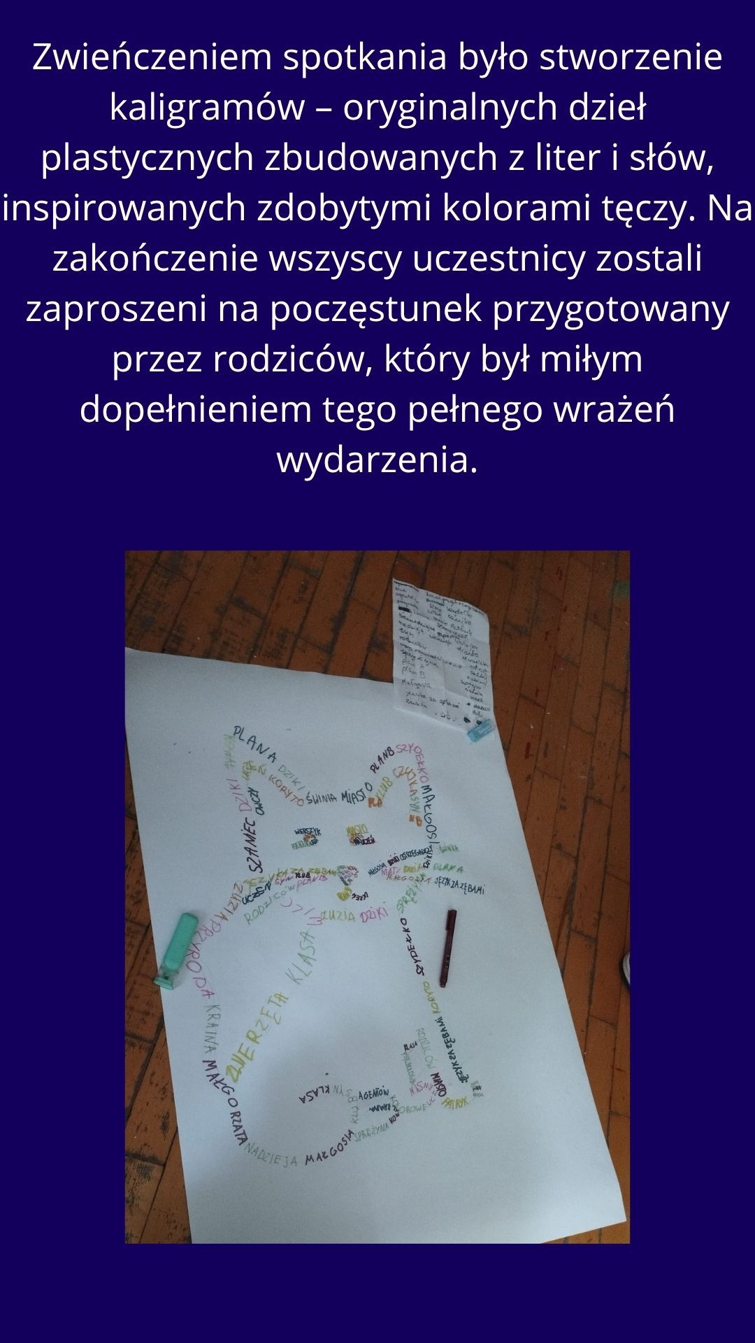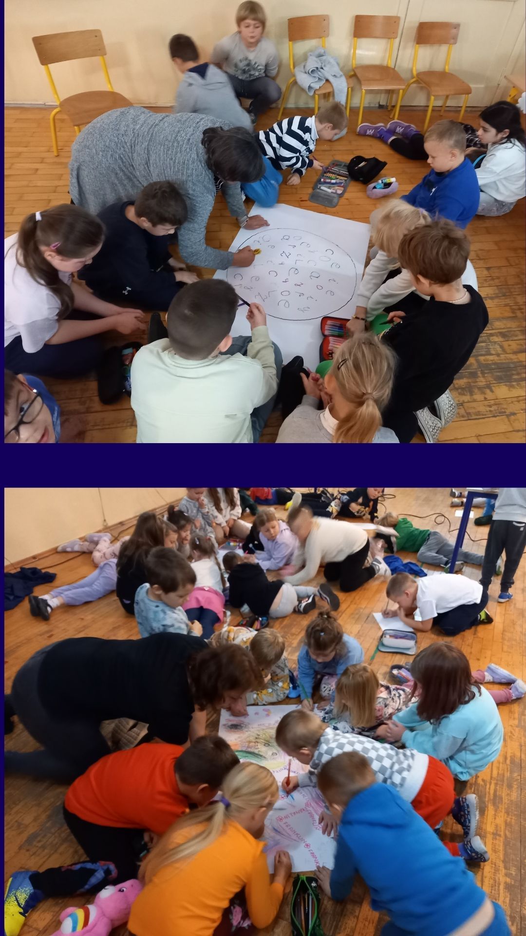 W specjalnie przygotowanej, nastrojowej scenerii nocy – przy zgaszonym świetle i reflektorze wyświetlającym ilustracje – dzieci Z KLAS 0-3 wysłuchały opowieści pt. „Franklin detektywem” autorstwa Paulette Bourgeois i Brendy Clark. Atmosfera tajemniczości sprzyjała skupieniu. Młodsi uczniowie z wielką uwagą śledzili czytaną historię, aktywnie uczestnicząc w zabawie: podnosili ręce za każdym razem, gdy usłyszeli słowo „żółwik”. Cisza, jaka panowała podczas czytania, była dowodem ogromnego zainteresowania bajką oraz zaangażowania dzieci. Podopieczni uczyli się rozpoznawać emocje bohaterów, co sprzyjało rozwijaniu empatii i wrażliwości na potrzeby innych. Po lekturze nadszedł czas na wspólną zabawę detektywistyczną. Dzieci, podzielone na grupy, rozwiązywały zagadki i odczytywały tropy, których celem było odzyskanie siedmiu kolorów tęczy. Zadania wymagały współpracy, logicznego myślenia oraz integracji międzyklasowej, co dzieci realizowały z wielkim entuzjazmem. Zwieńczeniem spotkania było stworzenie kaligramów – oryginalnych dzieł plastycznych zbudowanych z liter i słów, inspirowanych zdobytymi kolorami tęczy. Na zakończenie wszyscy uczestnicy zostali zaproszeni na poczęstunek przygotowany przez rodziców, który był miłym dopełnieniem tego pełnego wrażeń wydarzenia.