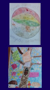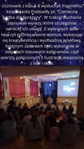 Uczniowie z klas 4-8 wysłuchali fragmentu książki Jacka Podsiadły pt. “Czerwona kartka dla Sprężyny”. W trakcie słuchania zapisywali wyrazy, które szczególnie zwróciły ich uwagę. Z wybranych słów tworzyli później własne wiersze, wykazując się kreatywnością i wyobraźnią językową. Kolejnym zadaniem było wykonanie w zespołach klasowych kaligramów, czyli wierszy połączonych z ilustracją utworzoną z liter i słów.