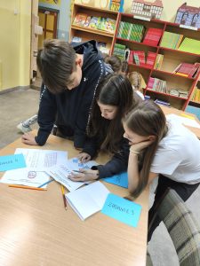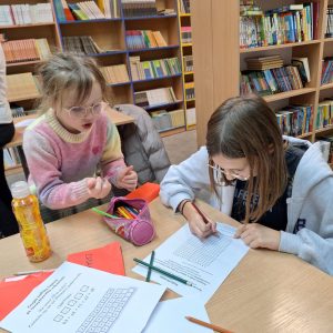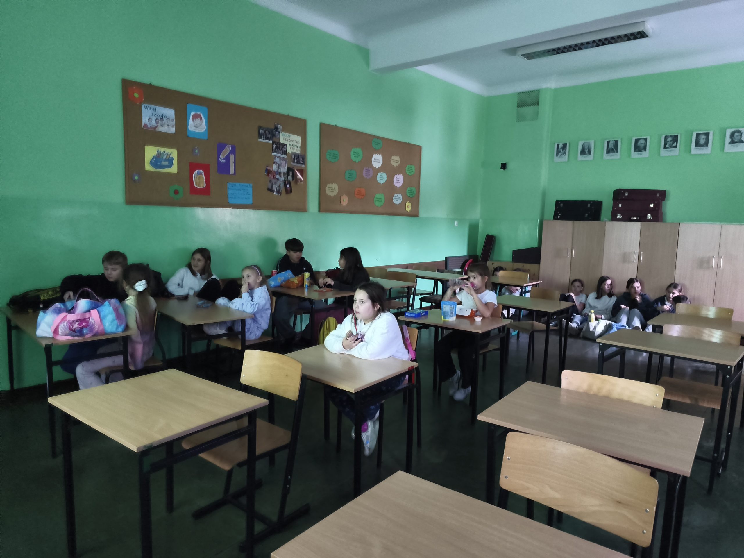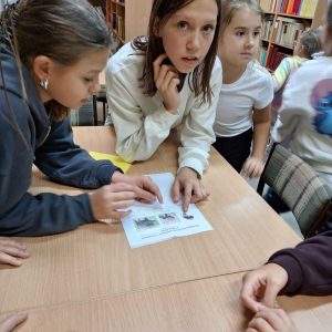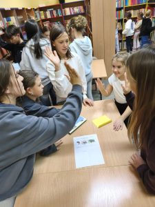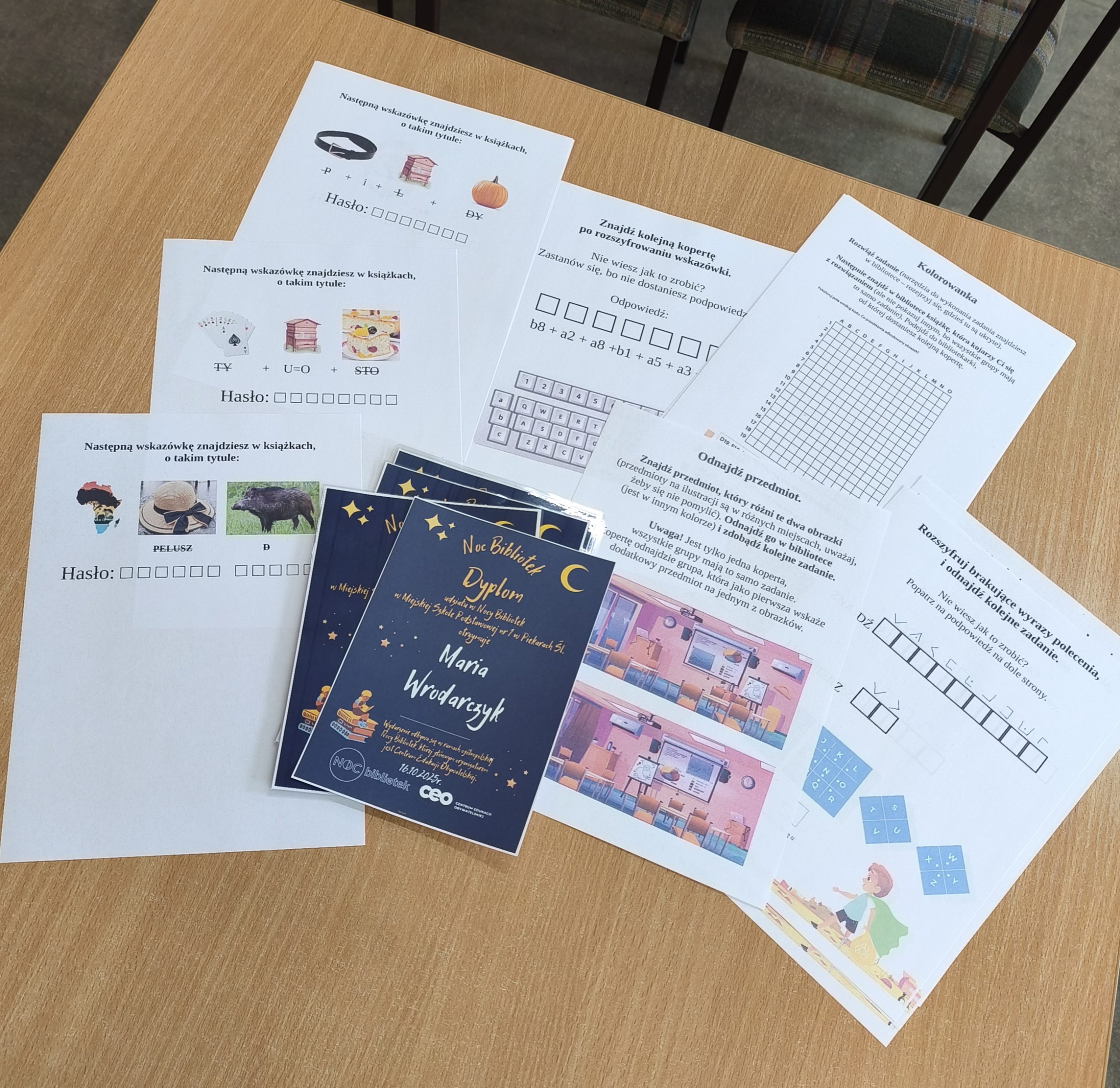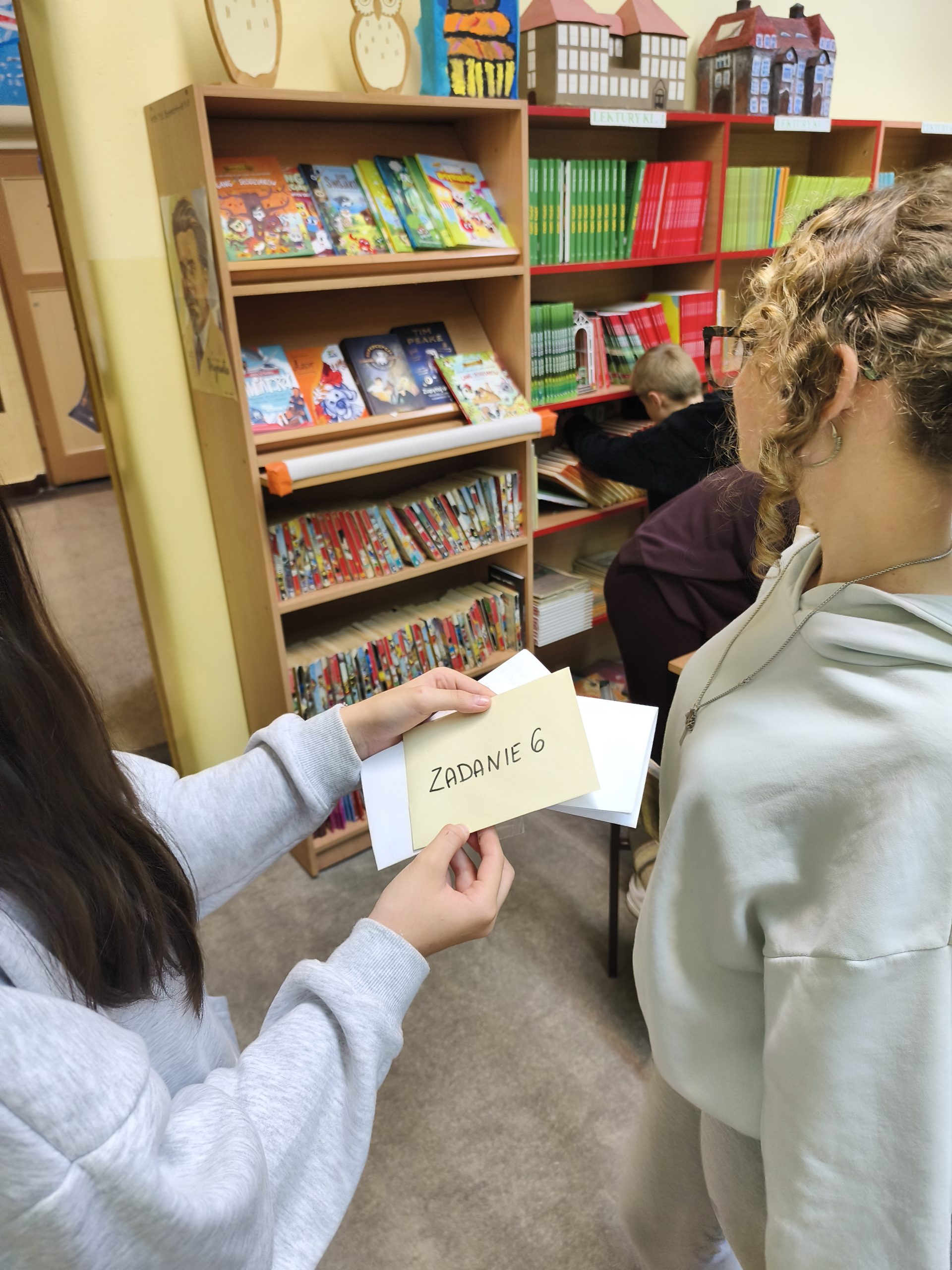 Uczniowie na początku spotkania grali w gry integracyjne. Wspólna gra sprawiła, że uczniowie z młodszych klas poznali starszych uczestników, nawiązali nić porozumienia i zaufania. Następnie w sali obok biblioteki obejrzeli film pt. "Biuro Detektywistyczne Lassego i Mai. Rabuś z pociągu" zagryzając przekąski. Po filmie uczniowie wrócili do biblioteki gdzie był już przygotowany "pokój zagadek " i zadaniem uczestników (podzielonych na 4 grupy) było ich rozwiązanie. Uczniowie byli wymieszani wiekowo, ale świetnie się dogadywali i współpracowali ze sobą. Nie poddawali się nawet przy trudniejszych zadaniach. Konkurencje były różne, głównie opierały się na różnego rodzaju szyfrach do rozwiązania, by odgadnąć wskazówkę do kolejnego zadania. Rywalizację wygrała dwuosobowa grupa - Wiktoria Sołony i Natalia Kapica.