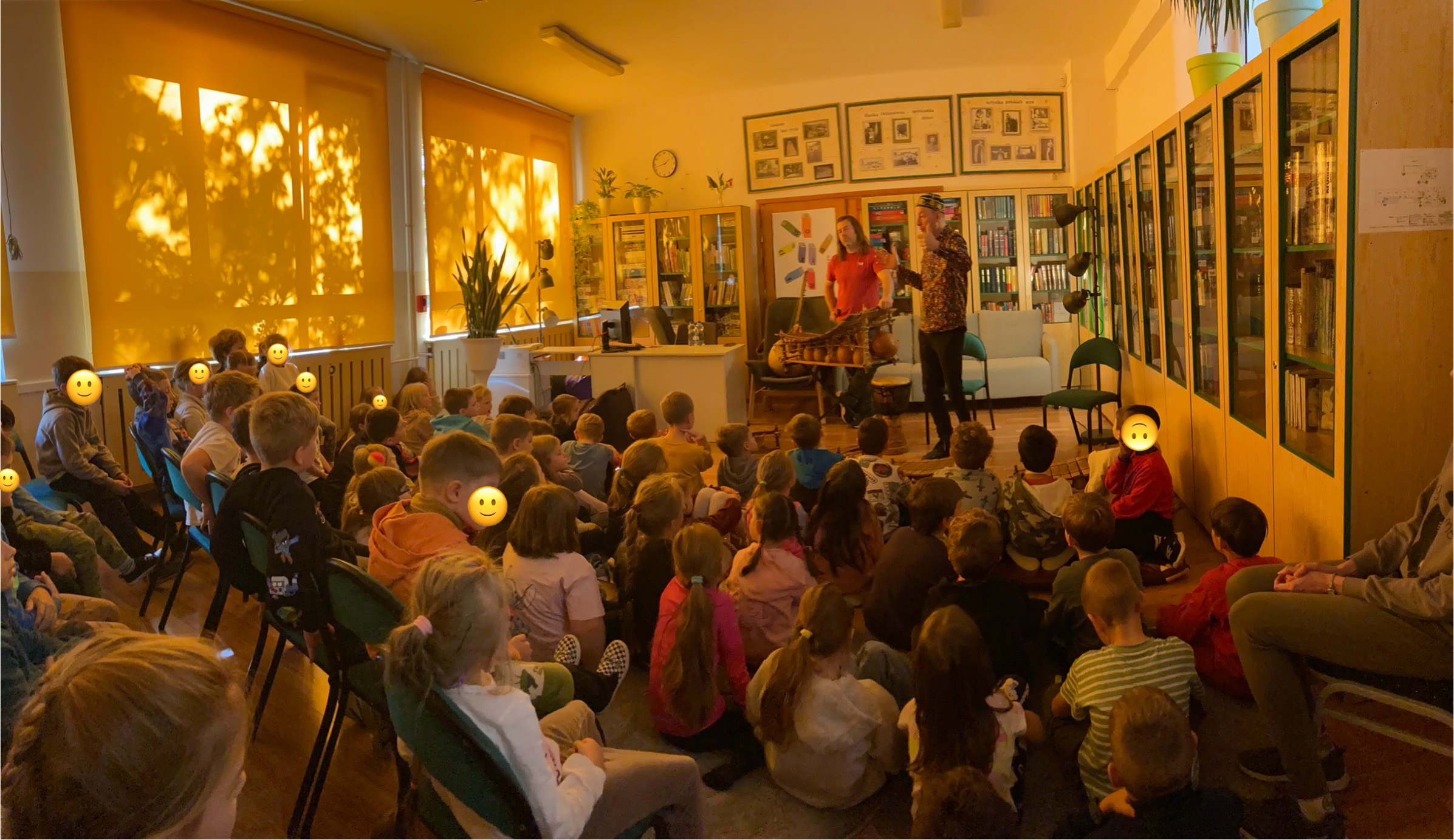 6. 17 października nasza biblioteka zorganizowała dla klas 1 i 2 spektakl narracyjny "Rytmy Afryki" w wykonaniu opowiadacza i muzyka ze stowarzyszenia Studnia opowieści "o". Były to afrykańskie bajki ilustrowane muzyką na etnicznych instrumentach: balafonie, ngoni, djembe, kalimbie. Powtarzalna, muzyczna struktura opowieści sprawiała, że dzieci brały udział we współtworzeniu akcji – dopowiadały ich dalszy ciąg, odgadywały zakończenie, rozwiązywały zagadki, grały na instrumentach i śpiewały. W finale warsztatów zaprezentowały wspólnie przygotowaną muzyczną bajkę (projekt finansowany przez miasto stołeczne Warszawa).