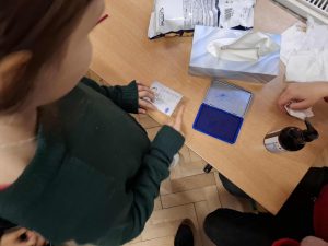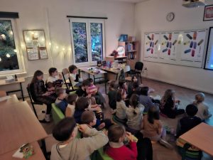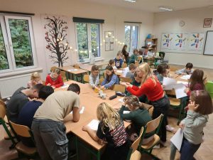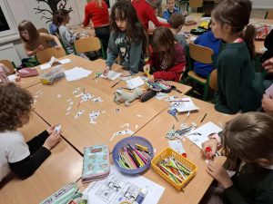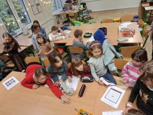 Wieczór rozpoczął się od warsztatów detektywistycznych, które przeniosły uczestników w świat tajemnic i zagadek. Uczniowie z zapałem rozwiązywali łamigłówki i zadania logiczne, które wymagały sprytu, spostrzegawczości i współpracy. Każdy z młodych detektywów wykonał również własną legitymację detektywa, ozdabiając ją odciskiem swojego palca, co sprawiło dzieciom ogromną frajdę i pozwoliło poczuć się jak prawdziwi śledczy.
