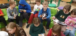 Nasza biblioteka stara się zadbać o dobrostan czytelników. W tym celu organizujemy zmysłoczułe przerwy z wykorzystaniem aromatoterapii, projektora gwiazd oraz piłeczek masujących. Używamy przenośnych stref ciszy dla dzieci ze spektrum autyzmu. Dysponujemy bogatą biblioteczką książek w języku ukraińskim dla dzieci z doświadczeniem migracji, których jest w naszej szkole ok. 80 osób. Mamy też sporo gier planszowych. Dzięki trzykrotnemu udziałowi w NPRCz oraz dobrej współpracy z Radą Rodziców mamy sporą ilość nowości książkowych.