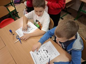 Kolejnym punktem programu było tworzenie leporello – tajemniczych, harmonijkowych książeczek, w których uczniowie umieszczali rysunki i opisy niezbędnego ekwipunku detektywa. Kreatywność uczestników nie miała granic – pojawiły się lupy, latarki, notesy, a nawet peleryny niewidki!