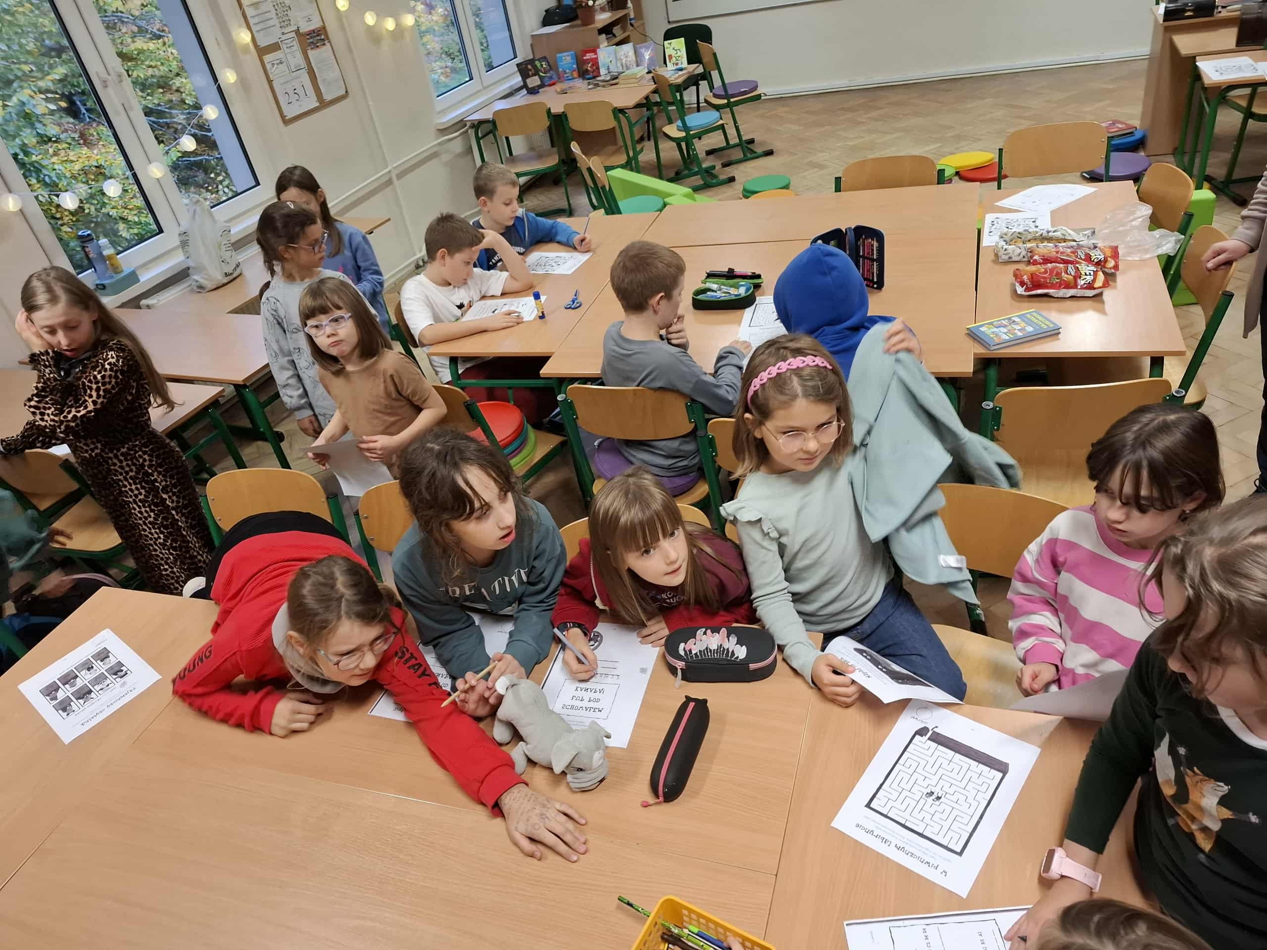 W piątek, 17 października 2025 roku, szkolna biblioteka zamieniła się w prawdziwe centrum detektywistycznych przygód. Wszystko za sprawą ogólnopolskiej akcji Noc Bibliotek, która w tym roku odbyła się pod hasłem „Do dzieła!”. W wydarzeniu wzięło udział 25 uczniów z klas 1–5, a także 3 uczniów z klasy 8A, którzy aktywnie wspierali nauczycieli bibliotekarzy w ramach szkolnego wolontariatu.