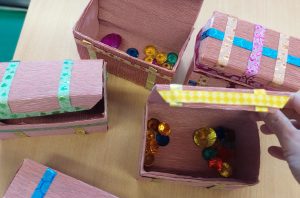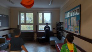 Po trudach związanych z szukaniem skarbu dzieci z wielką radością ułożyły się w bibliotece w specjalnie do tego przygotowanej przestrzeni i obejrzały w ciszy oraz napięciu film "Biuro detektywistyczne Lassego i Mai. Rabuś z pociągu".