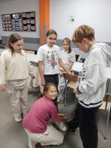 Ostatnim punktem programu było rozwiązywanie szyfrów z wykorzystaniem szachownicy Polibiusza. Czwartoklasiści świetnie poradzili sobie z odczytywaniem zaszyfrowanych wiadomości – wśród których znalazły się cytaty z ulubionych książek oraz hasła zachęcające do czytania.
