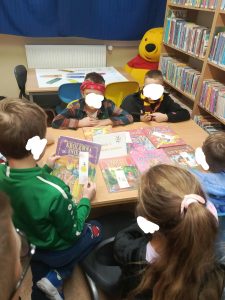 Dzieci muszą znaleźć komplet i przyporządkować do prawidłowych tytułów książek leżących na stoliku.
