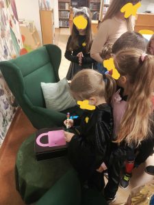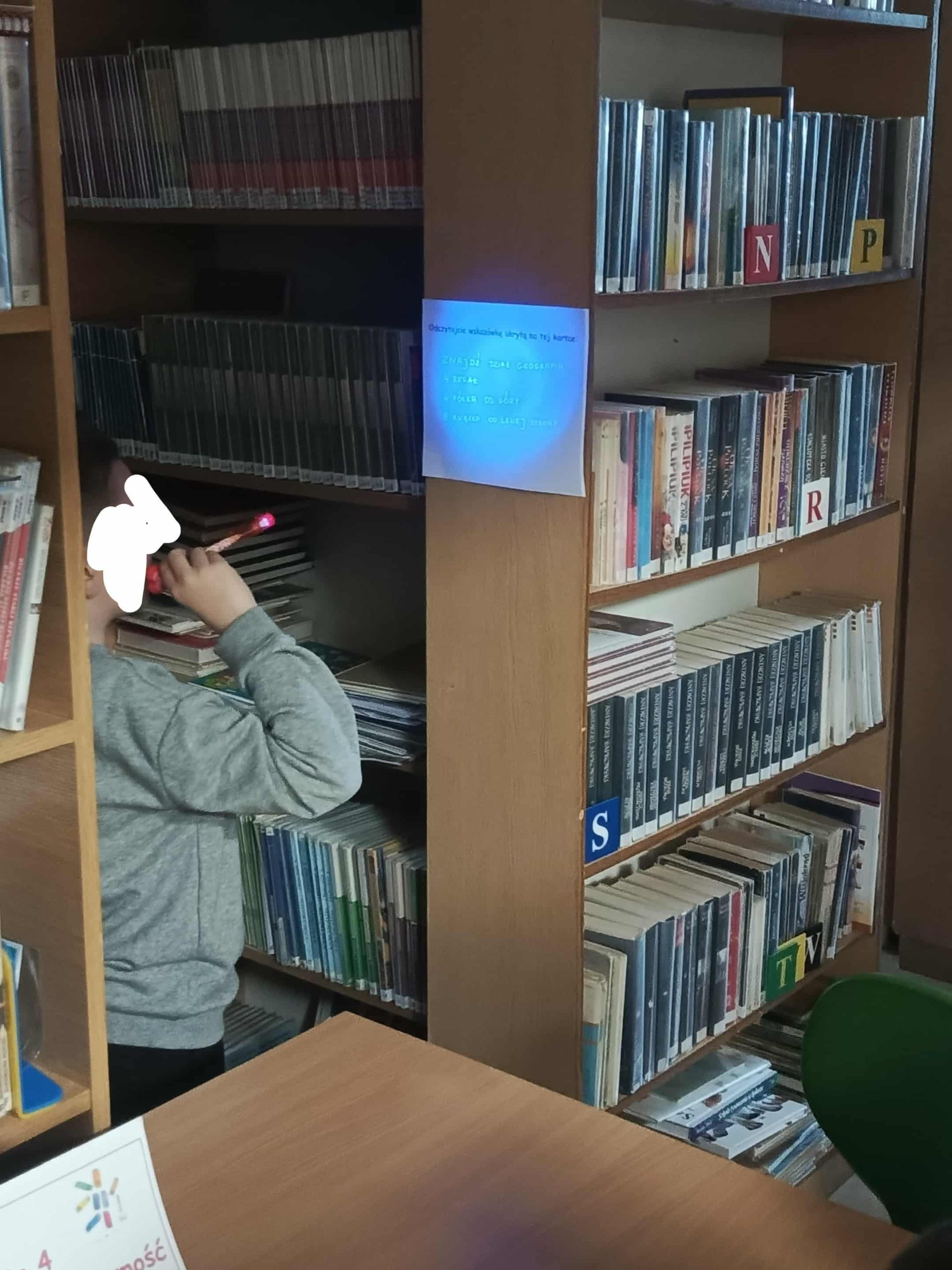 Latarką UV dzieci odczytują kolejną wskazówkę – np. „Szukaj w dziale Podróże, druga półka od dołu”.