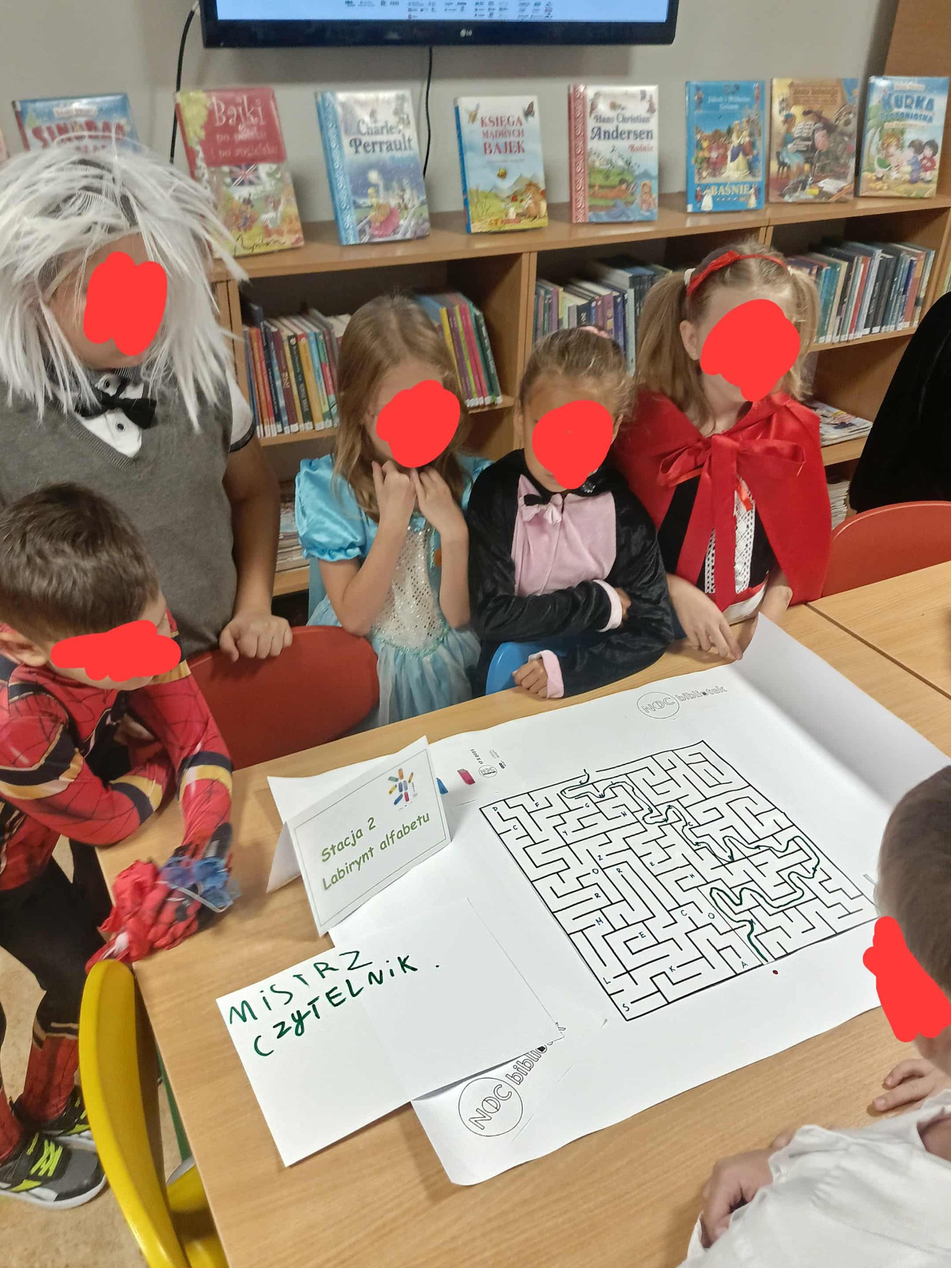 W bibliotece ukryte są zakładki z ilustracjami (np. Czerwony Kapturek, Kot w Butach).
