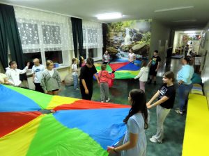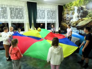 Po intensywnej grze uczniowie spędzili czas na zabawach integracyjnych z wykorzystaniem chusty animacyjnej i gier planszowych, które pozwoliły na wzajemne poznanie się i integrację w miłej atmosferze. Zajęcia te przyciągnęły wielu uczestników, którzy bawili się doskonale, ciesząc się wspólnym czasem.