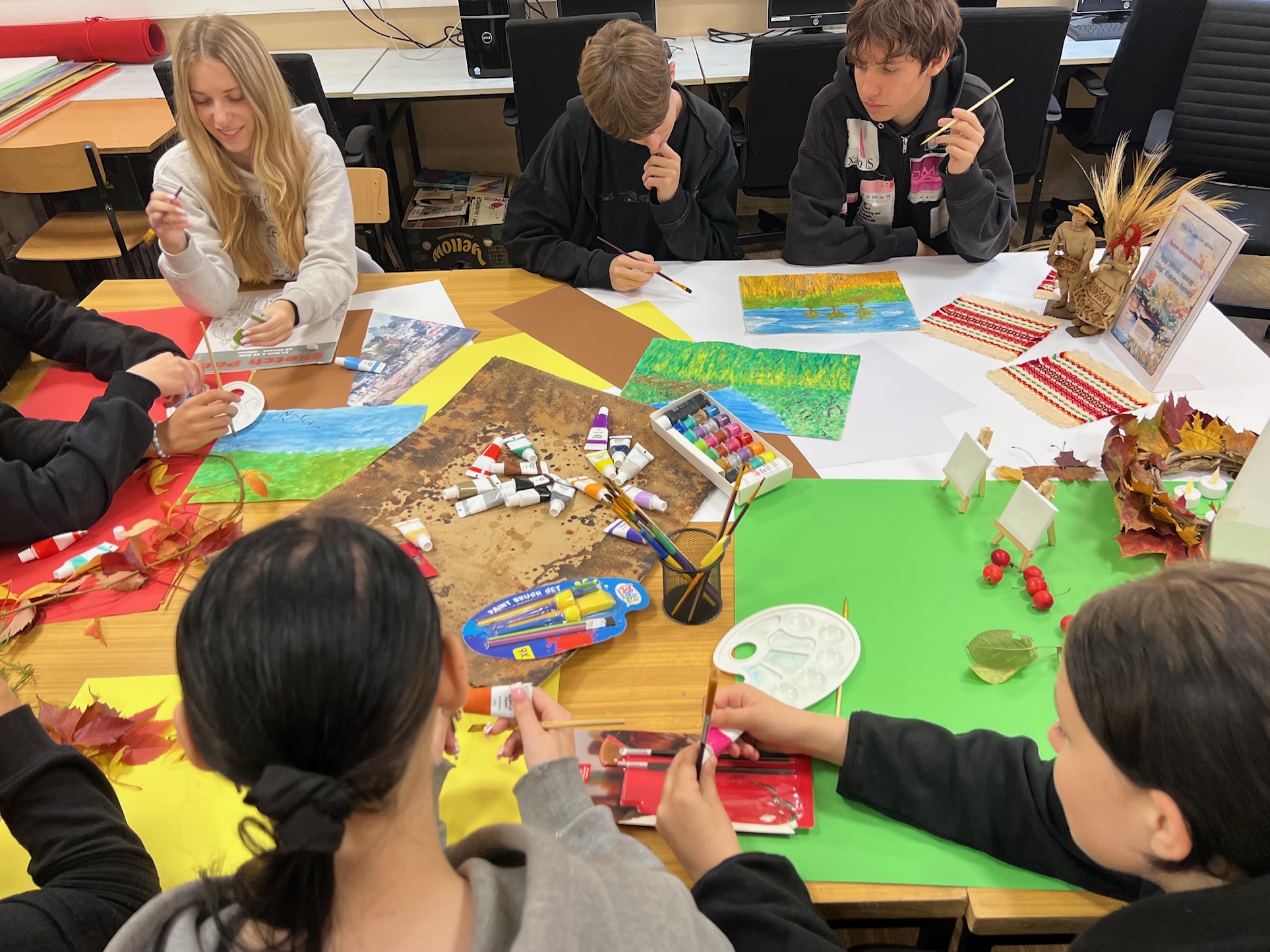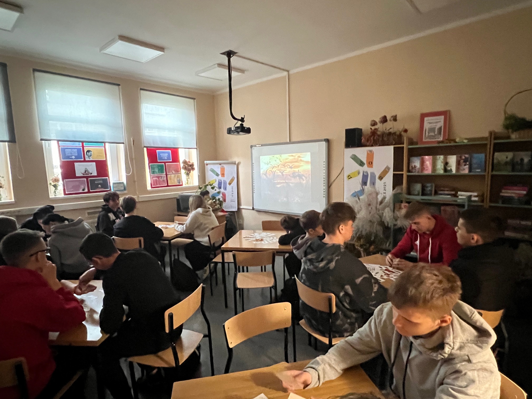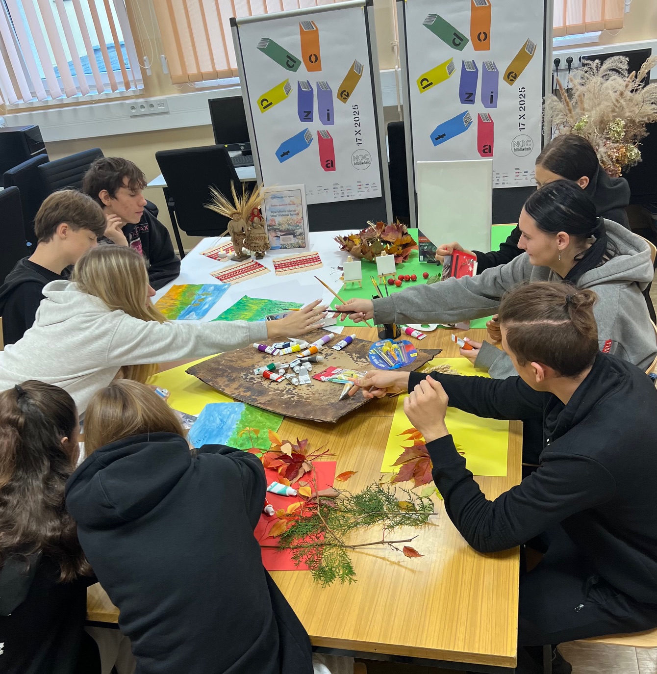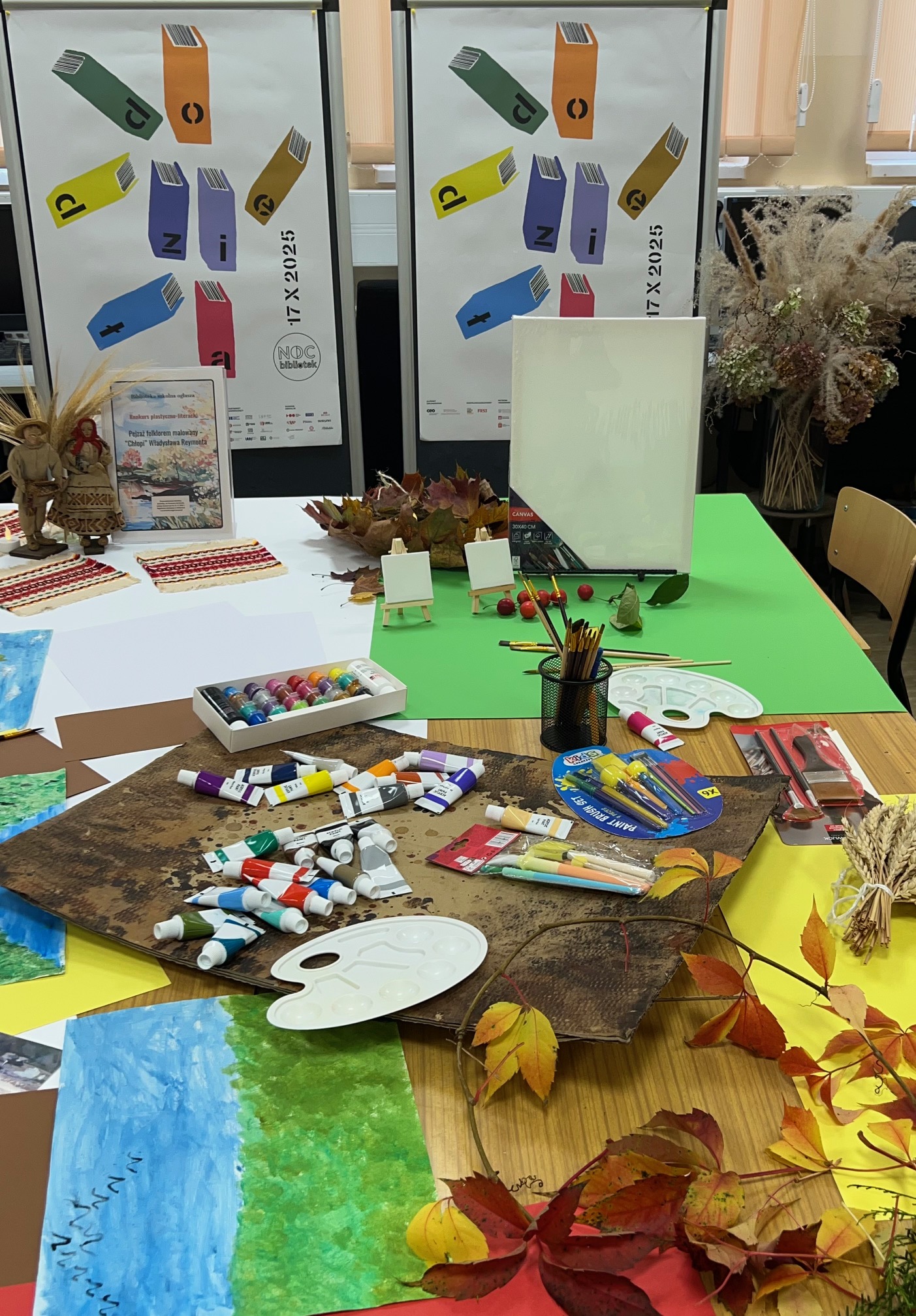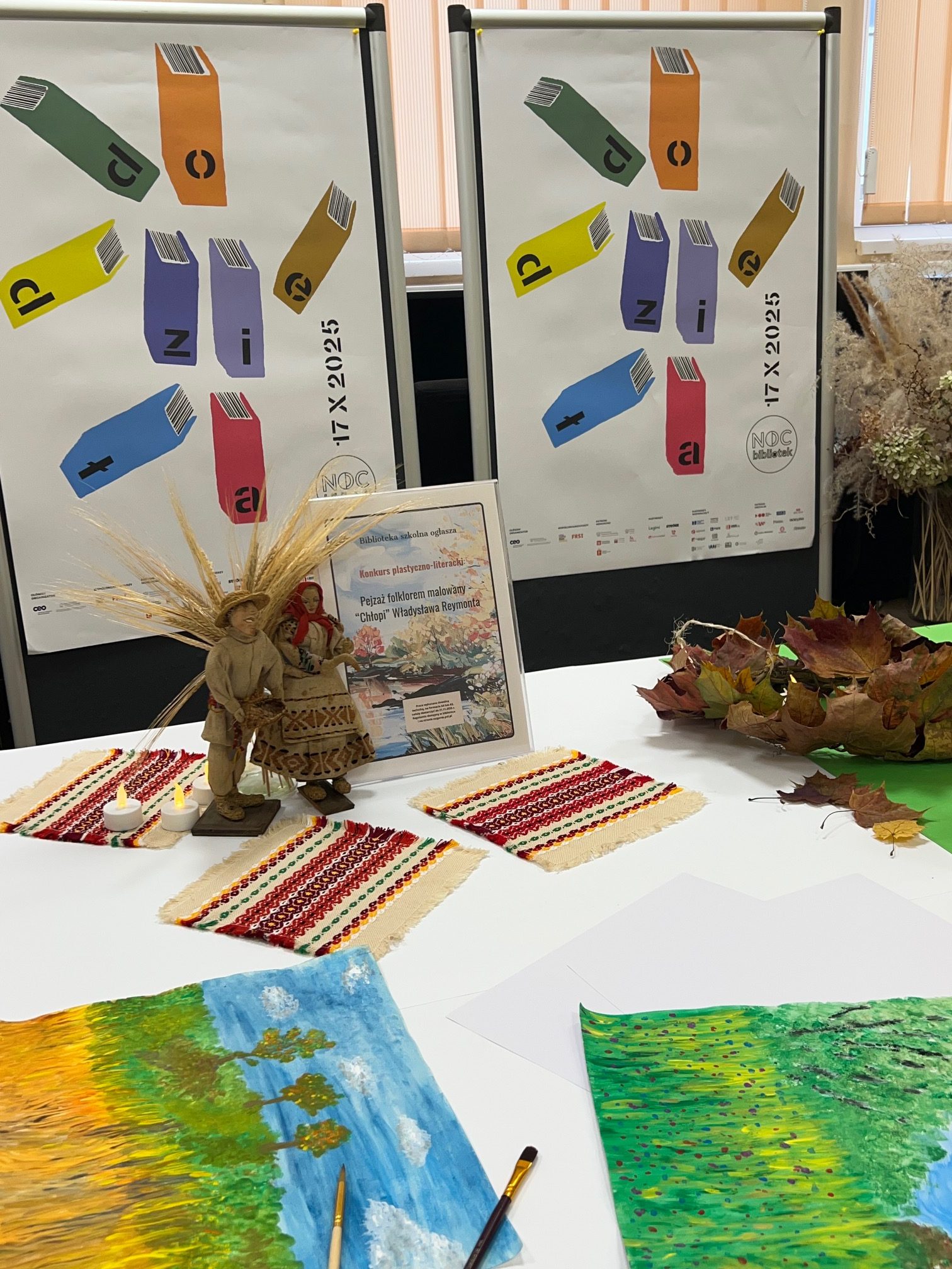 Ostatni filmik: „CHŁOPI 2023 Piękne obrazy... i ładne obrazki...” był inspiracją do kolejnego punktu naszej Nocy Bibliotek - warsztatów plastycznych. Uczniowie mieli okazję spróbować swoich sił w konkursie plastycznym „Pejzaż folklorem malowany – „Chłopi” Władysława Reymonta”, posługując się różnymi technikami plastycznymi.