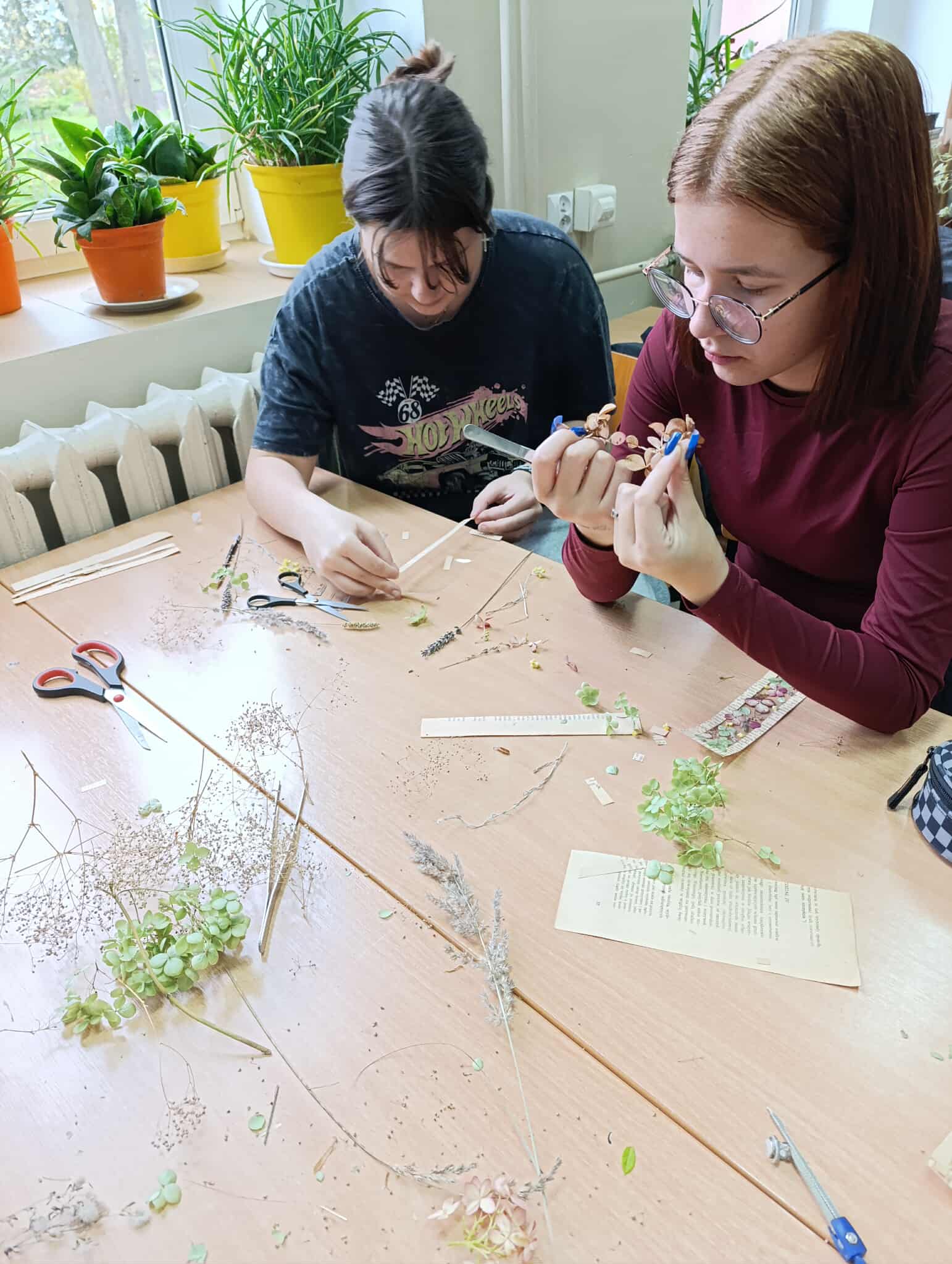 w rzeczywistości wygląda praca zespołowa oraz proces zarządzania. Architekci krajobrazu wykazali się dużą kreatywnością i wykorzystując dary jesiennego ogrodu i zasoby makulatury wykonali zakładki do książek. Prosta metoda klejenia i układania elementów kwiatowych na przygotowanych formach poddana został laminowaniu. Te dzieła