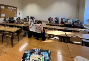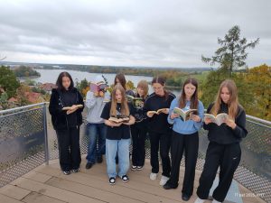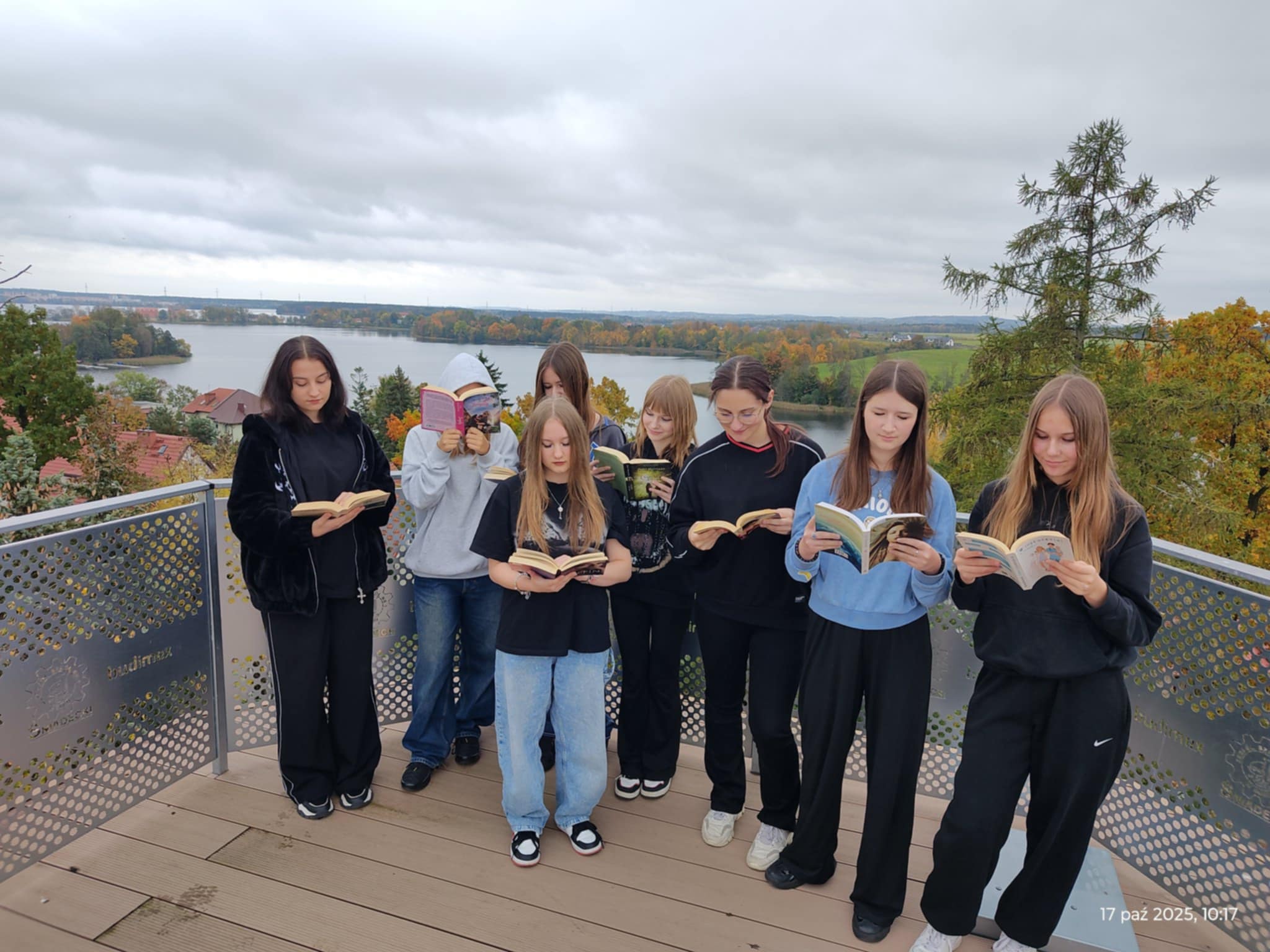 i pokonywanie barier wystąpień na forum. Czytaniem popisała się klasa trzecia szkoły branżowej i świetnie sobie poradziła. Na zajęciach biznesu czytana też była wybrana prasa branżowa i opiniotwórcza m.in. „Forbes”, „Newsweek”, „Business”, „Obserwator Finansowy” i „Controlling i Zarządzanie”. Uczniowie mogli przyjrzeć się aktualnym trendom w świecie biznesu i zobaczyć jak teoria łączy się z praktyką w realiach gospodarczych. Grupa uczennic odważnych, bez lęku wysokości z klasy pierwszej, w celu promocji czytelnictwa udała się na Basztę Szkolną, skąd obecnie rozciąga się niesamowity widok w jesiennej scenerii na budynek szkolny, osiedla naszego miasta, okoliczne wsie i dwa jeziora. Dziewczęta poznały legendę związaną z mieszkańcami budynku, którzy tu przebywali podczas II wojny światowej. We współpracy z nauczycielami z katedry psychologii i pedagogiki zorganizowaliśmy czytanie przy biesiadnym stole