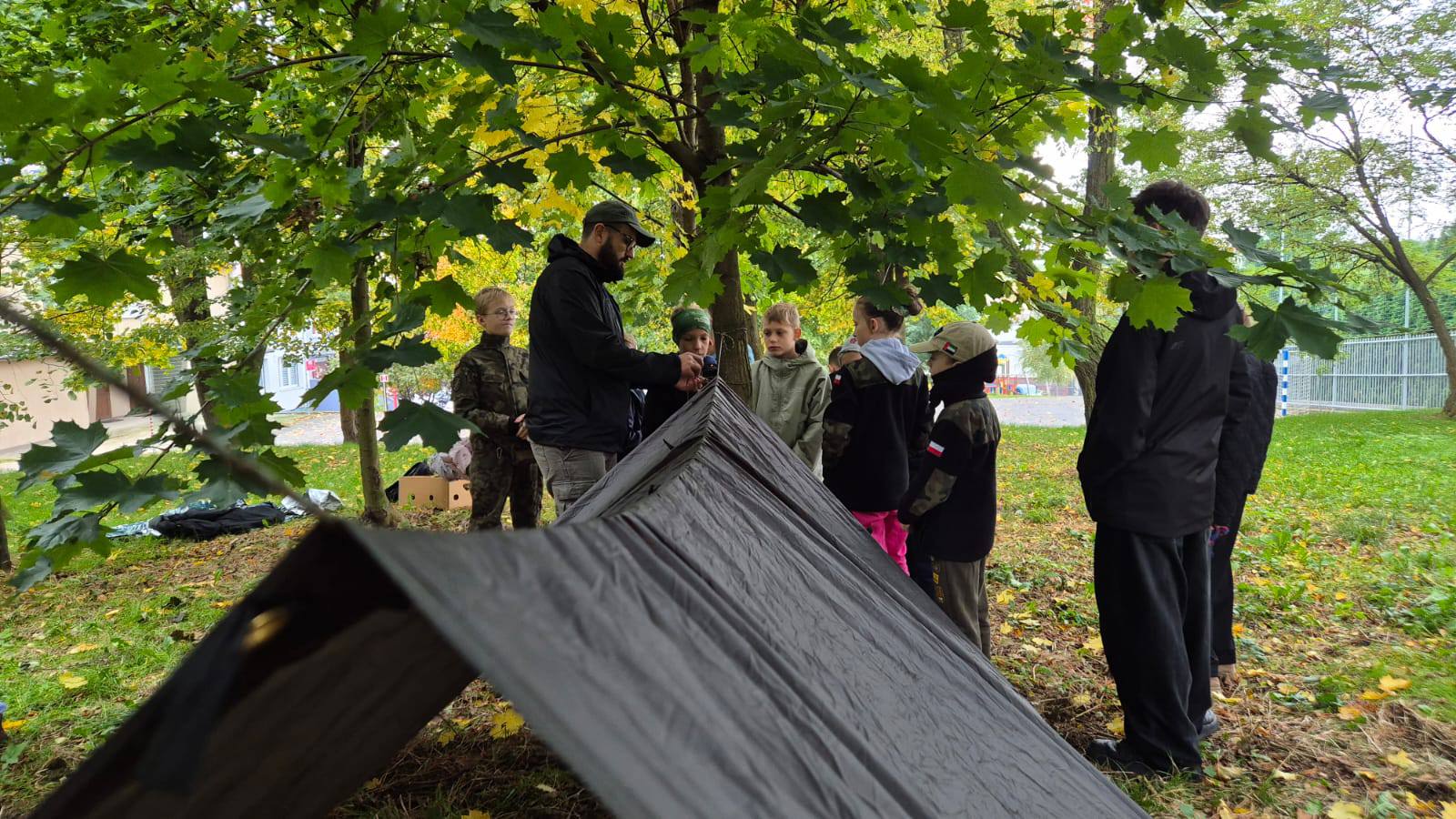 O godz. 15.00 i 16.00 ruszyły warsztaty survivalowe, podczas których dzieci uczyły się sztuki przetrwania w trudnych warunkach. 🏕️