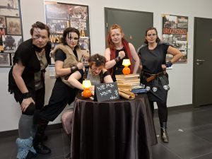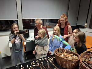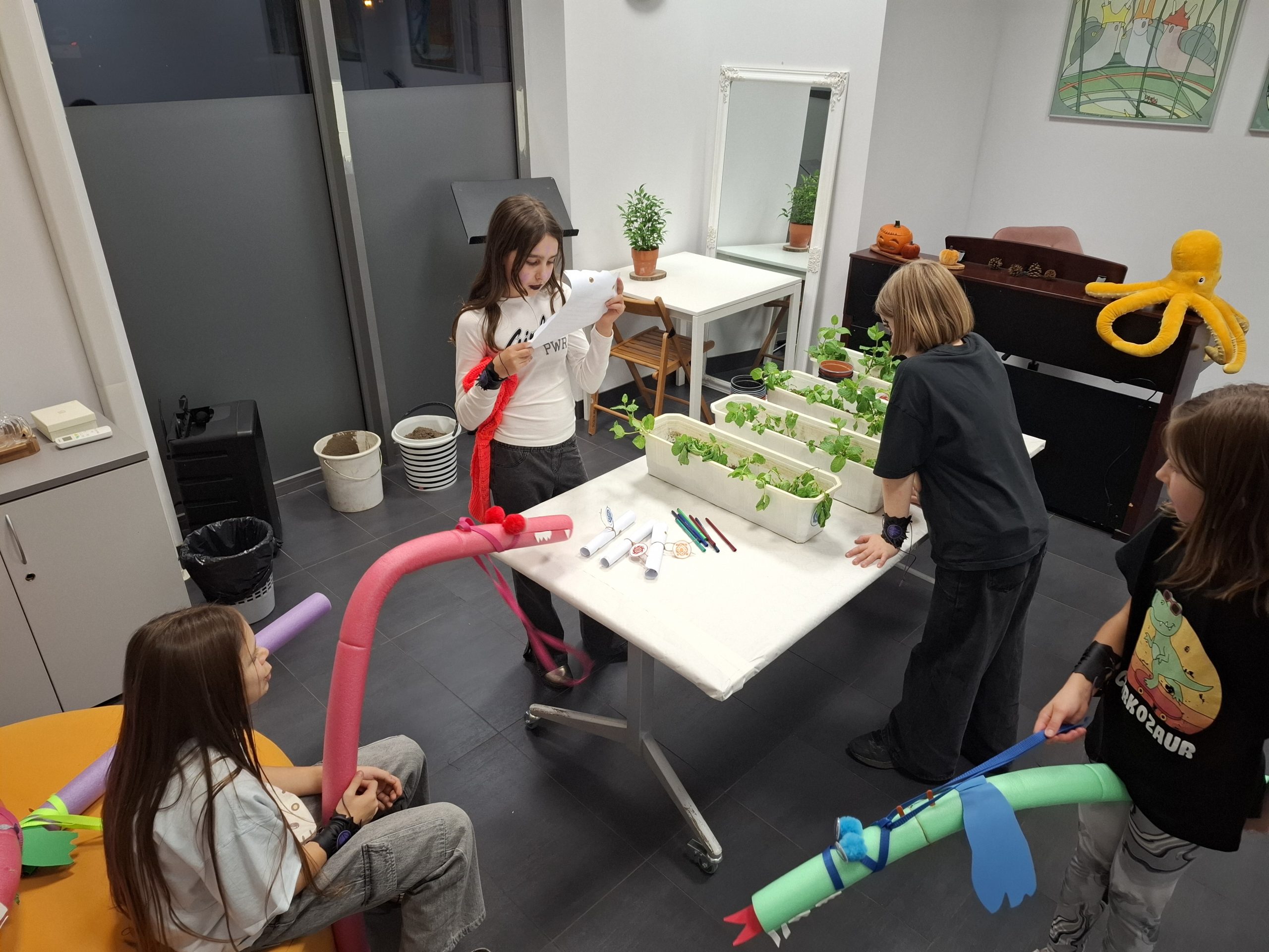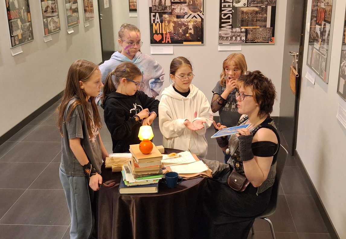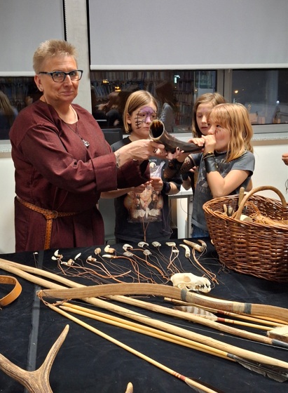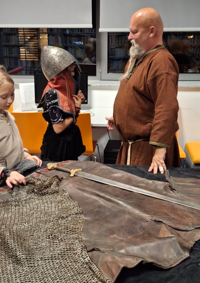 W sobotni wieczór odbyło się ostatnie z wydarzeń: czterogodzinna gra terenowa „Noc ze smokami” prowadzona w budynku Centrum Kultury, przeznaczona dla dziesięciolatków. Pracowaliśmy według autorskiego scenariusza jednej z bibliotekarek. Cały zespół przebrał się i odegrał wyznaczone role. Dzieci, podzielone na cztery zespoły odpowiadające klasom smoków, najpierw własnoręcznie wykonały bestie, a następnie, kierując się mapą, zespołowo zrobiły siedem zadań. Uczestnicy ryli swoje imiona zapisane runicznym alfabetem, tłumaczyli zagadkę zapisaną w języku smokońskim, grali w grę losową, sadzili smoczymiętkę, zbierali do koszyka owce ukryte na terenie Centrum, itp.. Kilkakrotnie musieli zetknąć się ze Szkaradnym Bibliotekarzem, osobnikiem sarkastycznym i apodyktycznym, ale znającym odpowiedzi na pytania dotyczące gry. Bibliotekarz udzielał odpowiedzi prostej lub zawikłanej ,w zależności od nastroju. W finale wszyscy spotkali się w bibliotece, gdzie czekał Wielki Zębacz ze swoja Białogłową (pasjonaci rekonstrukcji historycznej pokazujący artefakty wykonywane metodami z wczesnego średniowiecza). Można było zadąć w róg, sprawdzić ciężar kolczugi, wywiercić dziurę w kości, wziąć do rąk hełm i miecz. Jako pamiątki dzieci dostały wisiorki z zębem, „skórzane” opaski z emblematem domu, doniczkę ze smoczymiętką i tabliczkę z runami.