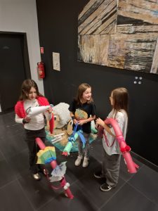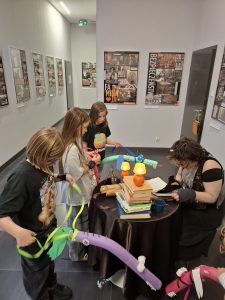 W piątek, 17 października zorganizowaliśmy dwa wydarzenia. O 16.00 najmłodsi czytelnicy biblioteki (3 -5 lat) przez godzinę uczestniczyli w warsztatach literackich z cyklu „Bajanie na dywanie”, pod tytułem „Harce z Superrobakiem” (na kanwie książki „Superrobak” Julii Donaldson). Prowadziła je pracownica biblioteki. Po performatywnym odczytaniu tekstu, uczestnicy próbowali być jak Superrobak - ćwiczyli sprawność fizyczną drążąc tunele (przeciskanie się przez tunel sensoryczny), podnosząc ciężary (gigantyczny dmuchawiec) czy grając w palanta (jagoda wielkości piłki futbolowej wbijana ogromną zapałką do pudełka). Prosta zabawa plastyczna polegała na wykonaniu dżdżownicy z różowej gumy i wymyśleniu dla niej zastosowania. Na zakończenie dzieci oglądały wycinek łąki i stworzenia, którzy przygotowują się do zimy (szklane naczynie wypełnione liśćmi, ziemią i modelami poczwarek, ślimaków, wijów itp. naturalnej wielkości, wykonanymi z masy plastycznej). To ostatnie działanie miało na celu oswajanie dzieci tymi mieszkańcami łąki, którzy często budzą lęk.